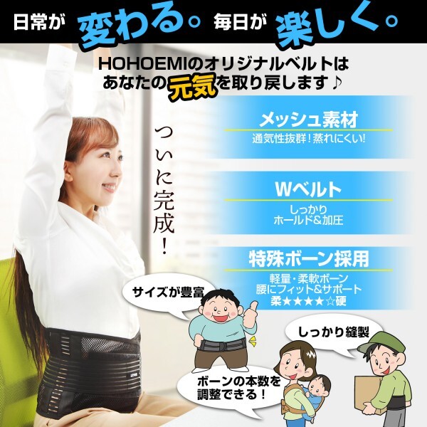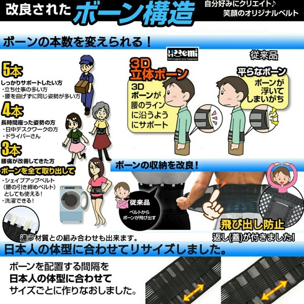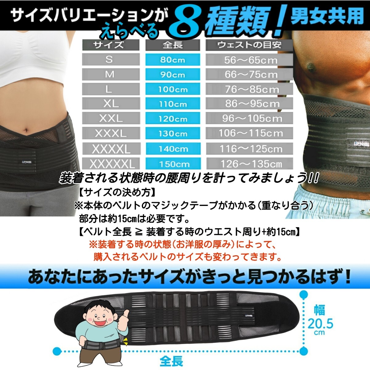数あるオークションの中から、アクセス頂きありがとうございます。 【日常が変わる!毎日が笑顔になるオリジナルベルトはあなたの元気を取り戻します!】 ・丈夫なメッシュ素材で通気性、耐久性抜群! ・こちらは5Lサイズのご案内になります。(豊富な8サイズを展開!) サイズ:5Lサイズ 横:全長約140cm(腰周り:約116~125cmまで対応) 幅:約20.5cm 材質:ポリエステル65%・コットン35% カラー:ブラック (サイズ表も合わせてご覧くださいませ) ・Wベルトとマジックテープでしっかりホールド&加圧! ・医療用特殊樹脂ボーン採用だから驚きの軽さで、しっかりサポート! ・ボーンの本数が調節可能な為、ご自身の体調やご 使用環境に応じてホールド感の調整が可能です! 【こんな方にオススメです】 長時間のデスクワーク、立ち仕事、ヘルニアやぎっくり腰、 関節痛などの不安がある方、日常的に腰のサポートをしたい、 ウエストのシェイプアップなど、幅広く様々な方にご利用いただけます。 【特徴】 ・二段式ベルトの長さ、ボーンの間を日本人体型にリサイズしました。 ・ボーンが最大5本内蔵でき自由に取り出せるので5→4本など数を変えて 体調やご使用環境に応じてお使いになれます。 ・丈夫なメッシュ素材を採用しているので、通気性はもちろん耐久性にも優れています。 ・洗濯機で洗えるのでお手入れが楽! 【特典もついてくる】 ・オリジナル収納ポーチが付属! ・購入者だけの特典漫画で解説日本語説明書付き! ・100%安全保証!サイズ交換ももちろんOKです。 ※3Dボーンを装着しての激しい動きには向いておりません。ご注意願います。