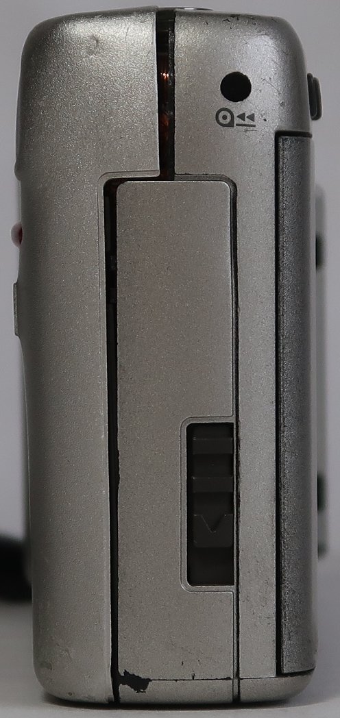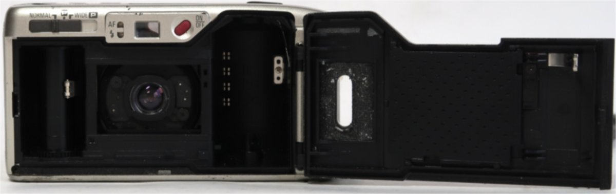 ボディに開いている箇所があります。電池を入れてテストしました。電源ははいります。再度の日付位の液晶は機能しております。上部の液晶はほぼなにも表示されません。電源オン後に少しだけレンズ扉が開きます。次にシャッターボタンを押すとレンズが出てきます。このような仕様なのかわかりません。その後にシャッターボタンを押すとシャッターが切れます。フィルムの蓋を開けて閉めるとフィルムの送り出しの音はします。またフィルム巻取りボタンを押すとフィルム巻取りを開始します。最後に電源ボタンを押すと電源はオフにりレンズも引っ込みレンズ蓋も閉じられます。液晶横のボタンは液晶が見えないので機能しているのかわかりません。ただフラッシュのボタンを何回か適当に押してシャッターボタンを押すとフラッシュ光るとともにシャターがきれました。ファインダーは左側が少し黒くなって見えなくなっています。フィルムをいれて、写真を撮った後の確認はとれておりませんし、現像後の状態もわかりません。分かることは以上です。このように壊れている状態ですのでお取引後はいかなる理由がありましても返品はできませんし、クレームはお受けできません。