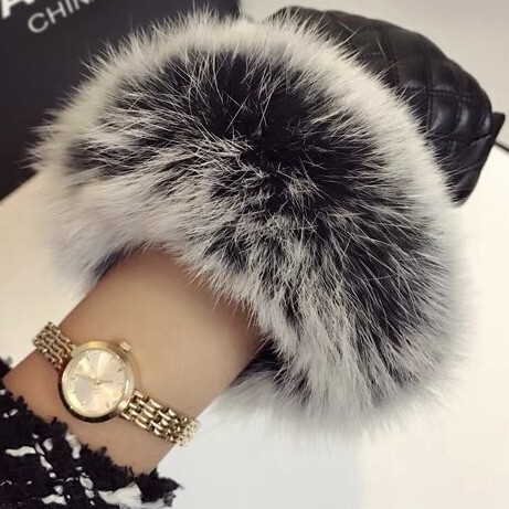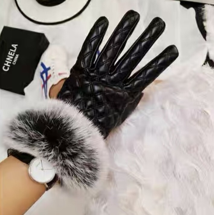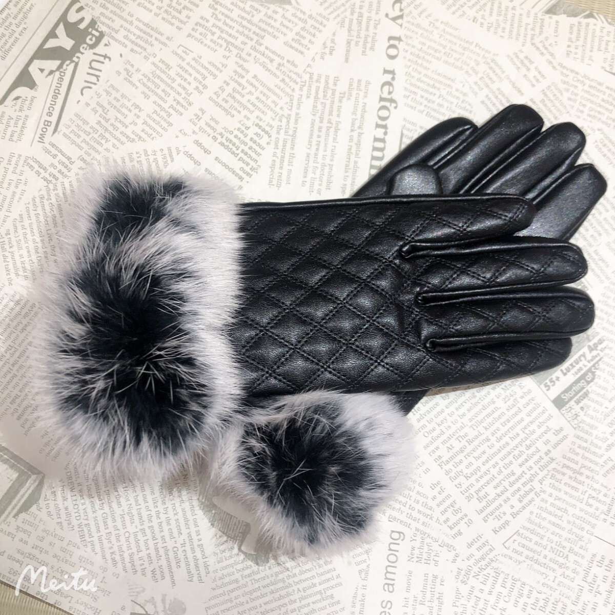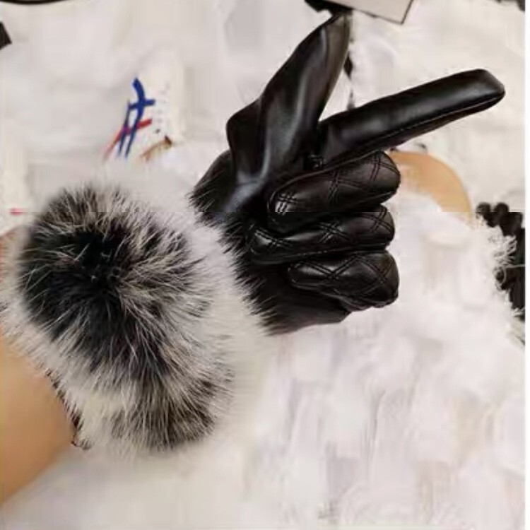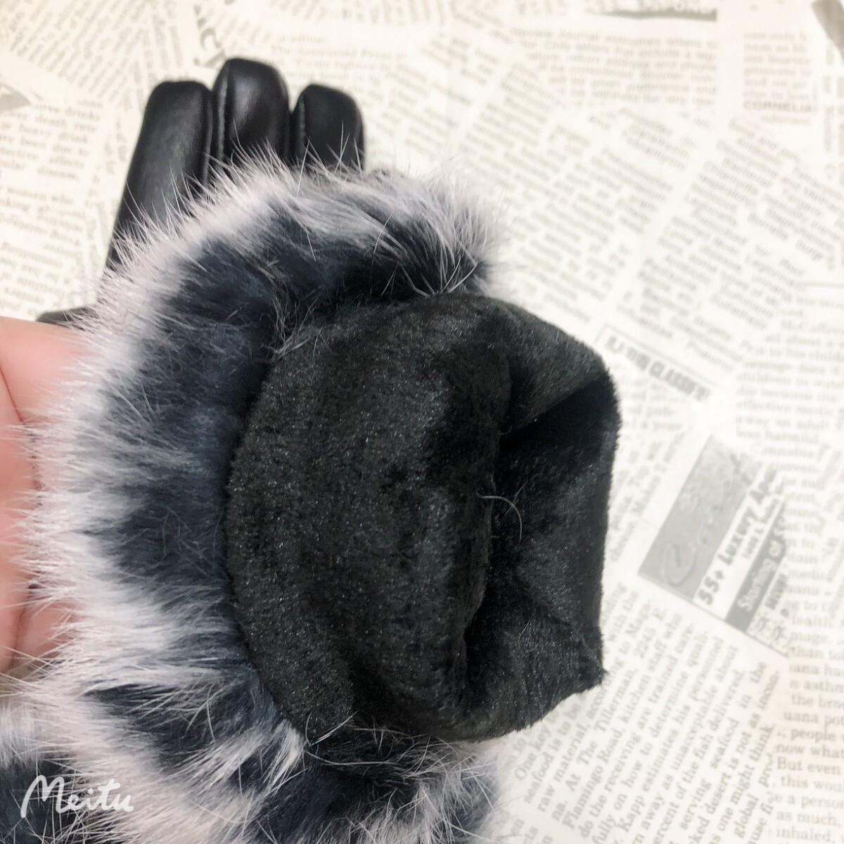 可愛いファーつき手袋です、本体は合皮、ファーはウサギの毛になります。手触りが柔らかく、とてもよい。中はモコモコフリース生地で暖かい〜