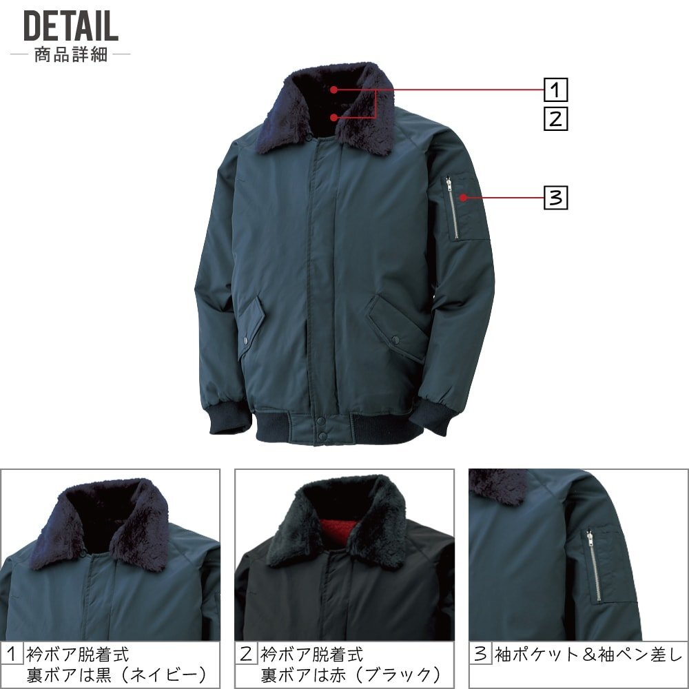 特長:撥水/衿ボア脱着式/内ポケット/袖ペン差し/ファスナー付袖ポケット