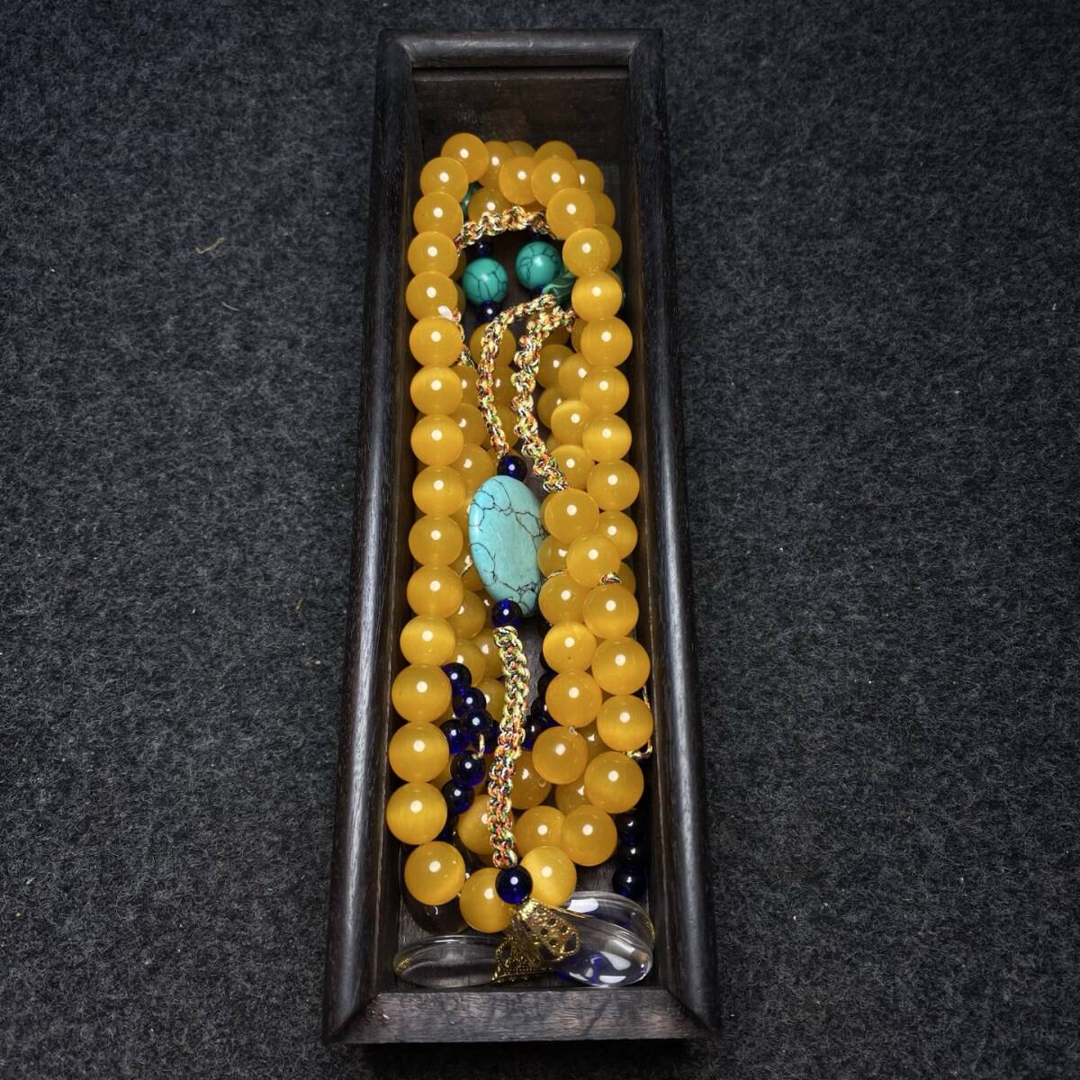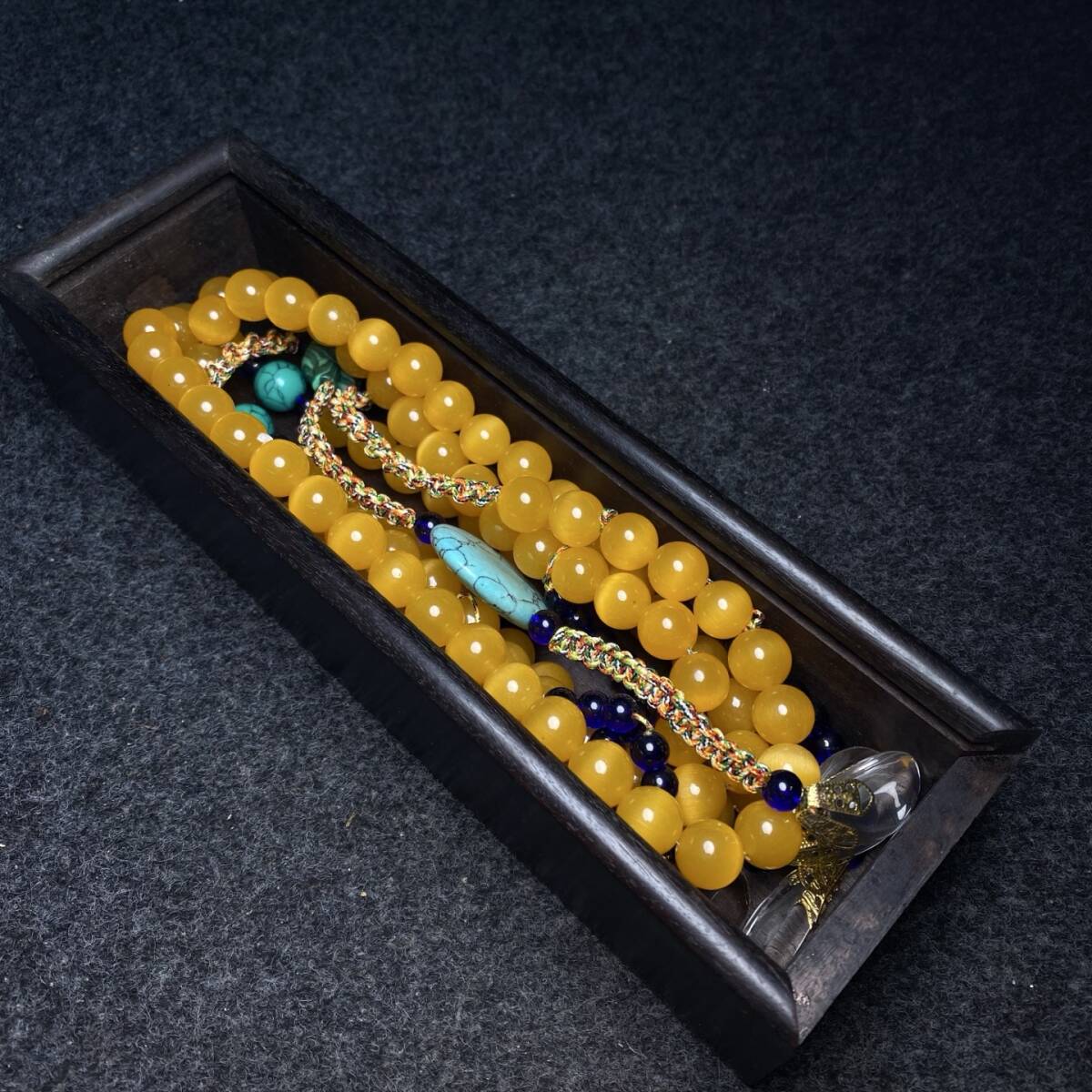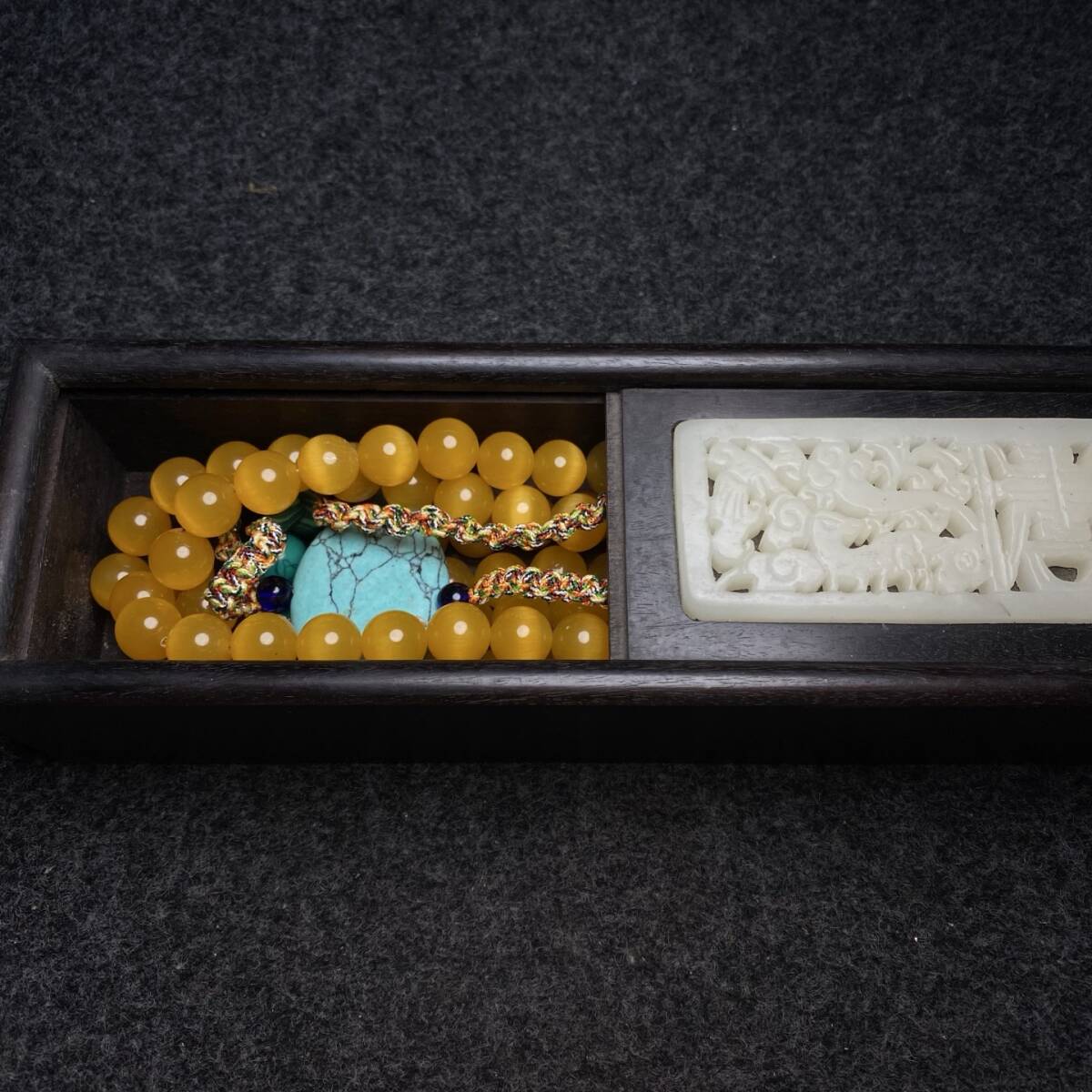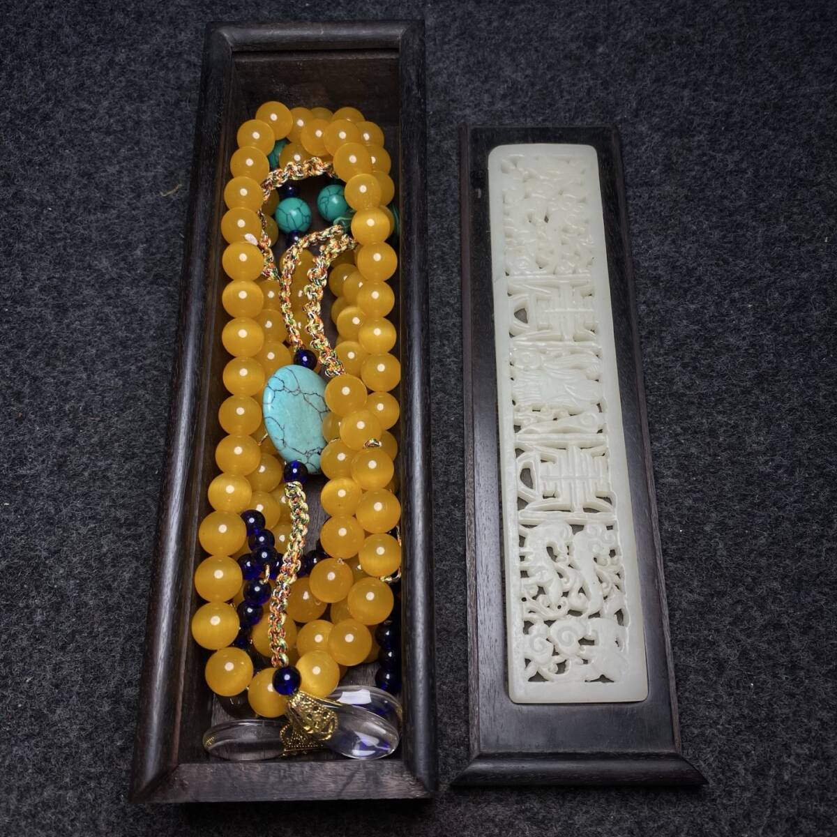 館蔵 黑檀木彫 玉石嵌 收納箱入 猫眼石 朝珠 仏珠 念珠 古官員用品 中国古美術 古美味 蔵出