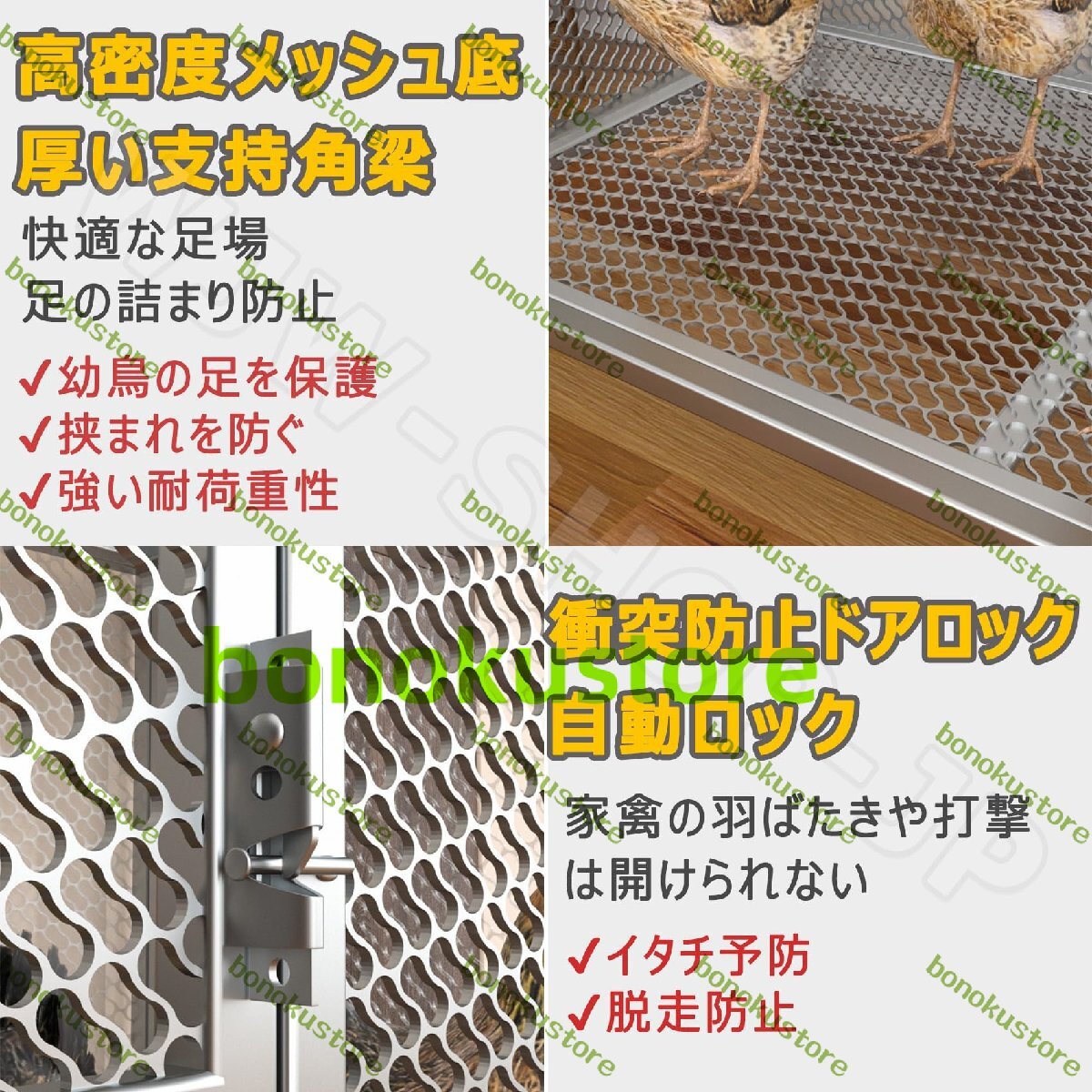 【丈夫な素材と考え抜かれたデザイン】高温塗装コーティング保護(ブラック)またはコーナーチューブオリジナルカラー(原色)を使用し、頑丈で耐久性に優れています。高密度の金属底と厚いコーナービームは、家禽に快適な立ち面を提供し、若い鳥が足を挟むのを防ぎ、強力な耐荷重性を備えています。耐衝撃自動ドアロックを装備しており、家禽がドアをつついて開けるのを効果的に防止し、逃亡やイタチの侵入を防ぎます。