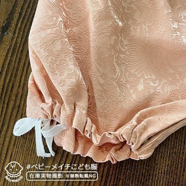 セパレートタイプのベビーキッズ袴、上下2点セット♪こちらは光沢があり高級感溢れるジャガード織りの生地を採用し、特別な日にピッタリです。上は短肌着や甚平のように紐とスナップボタンで脱ぎ着ができ、かぼちゃパンツは股スナップボタンで全開にできるのでおむつ替えも楽ちん♪お宮参りやお食い初め、初節句のお祝い、お正月、七夕、お祭りなど幅広いシーンで活躍します!