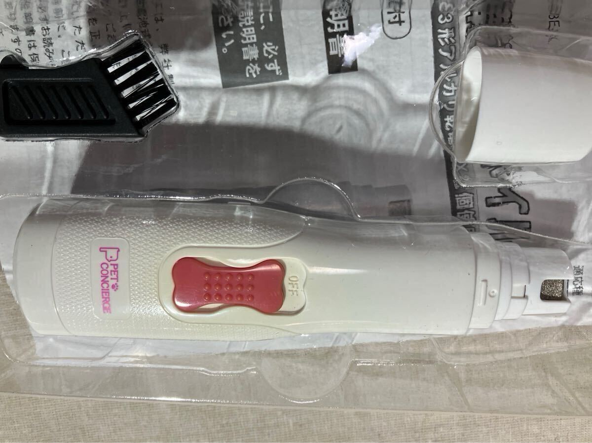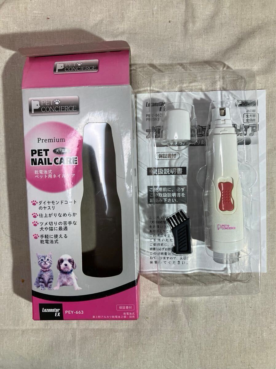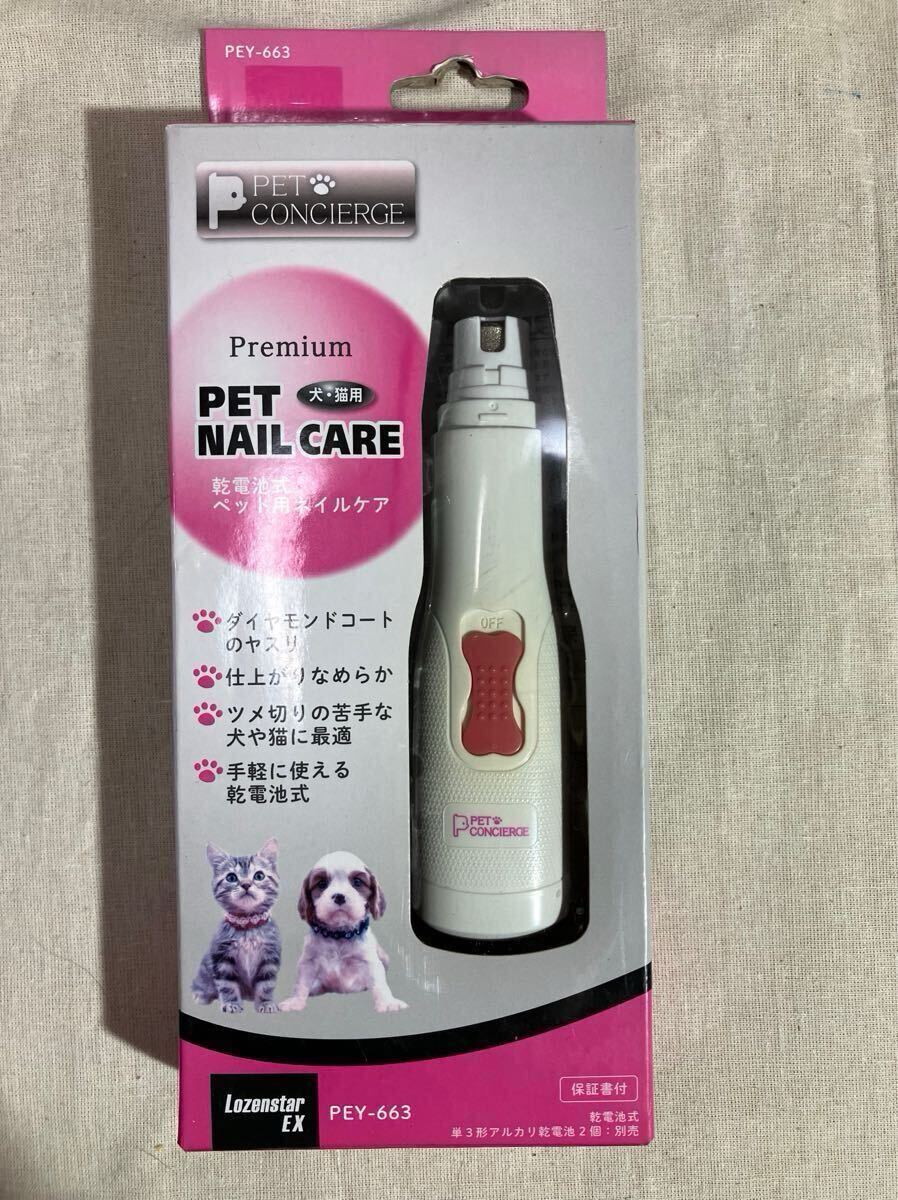 ロゼンスター PEY-663 ペット用電池式ネイルケア ●ツメの形状・大きさに合わせてA側(小さいツメに最適)・B側(大きいツメに最適)の選択ができます。 ●ツメ切りの苦手な犬や猫に最適。 ●手軽に使える乾電池式。 【仕様】 材質: 本体/ABS樹脂 ヤスリ/ステンレス、ダイヤ モンドコート キャップ/ABS樹脂 付属品: キャップ、掃除用ブラシ 本体寸法(mm):W35×H136×D26 本体重量:約71.6g 商品状態 新品未使用品になりますが 写真ではわかりにくいのですが 店舗に陳列していた為、商品と外箱に日焼けや色褪せあります パッケージにキズ等ございます 神経質な方は、ご注意ください 在庫たくさんありますので何台も必要な方はメールでご相談ください … … … … … … … … … 付属品 商品写真に写っているものが全てになります。 写真をよくご覧の上、ご購入をお願い致します。 乾電池は入っていません