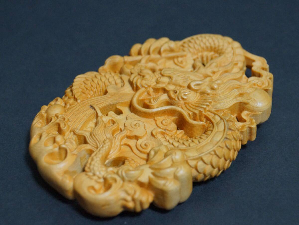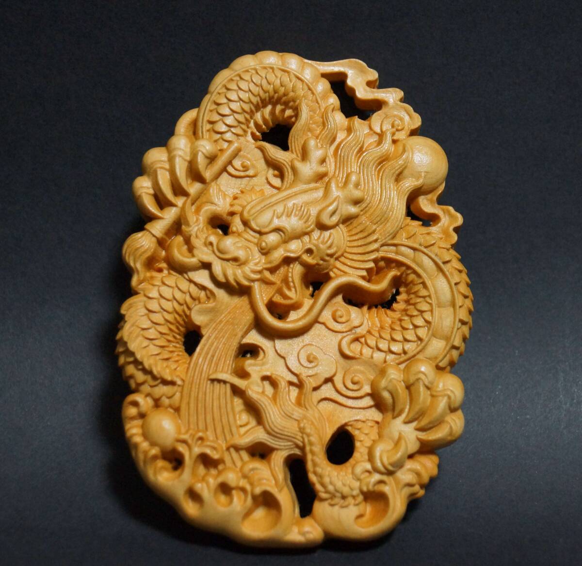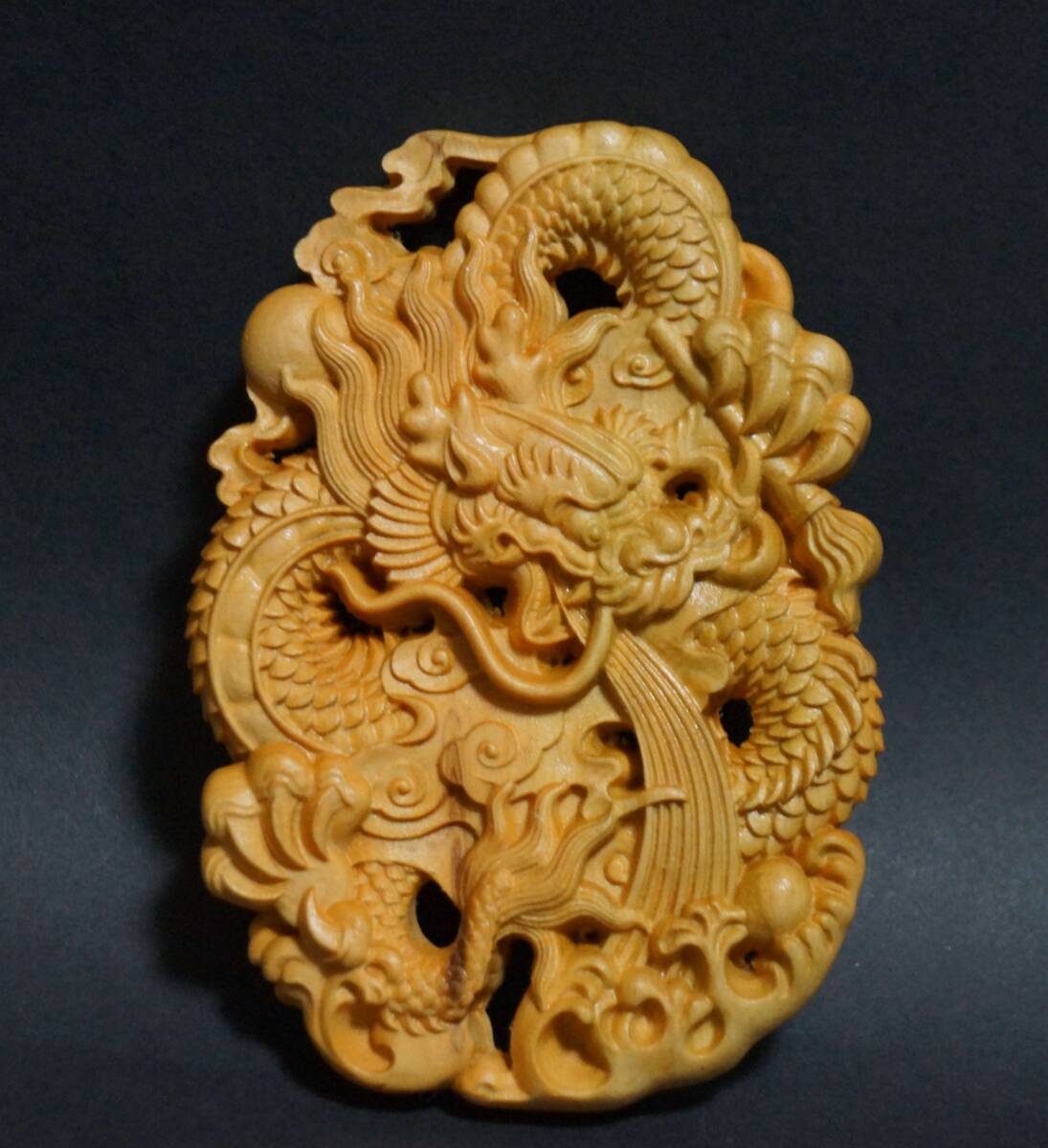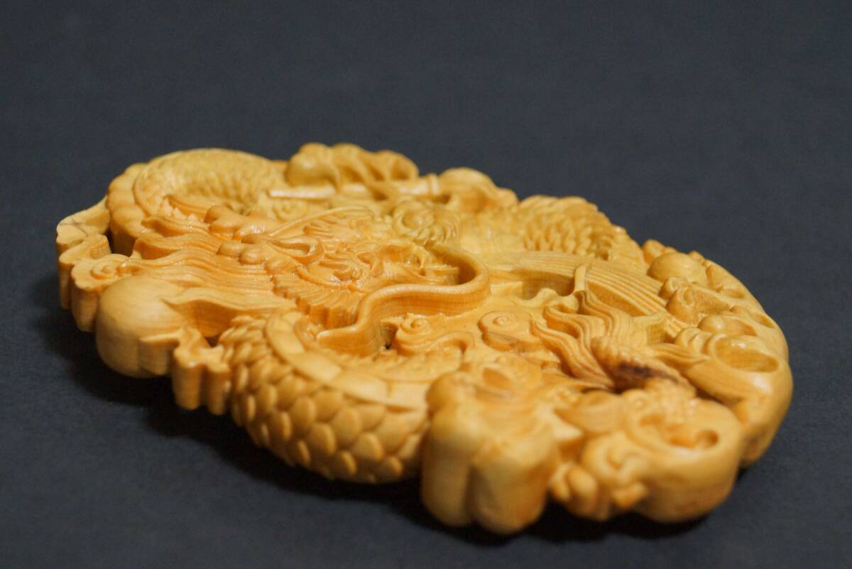 【寂】木製 柘植 黄楊 透かし彫り 両面彫 細工彫 龍 根付 緒締玉 提げ物 装飾品 置物 飾り物☆時代物☆s71203