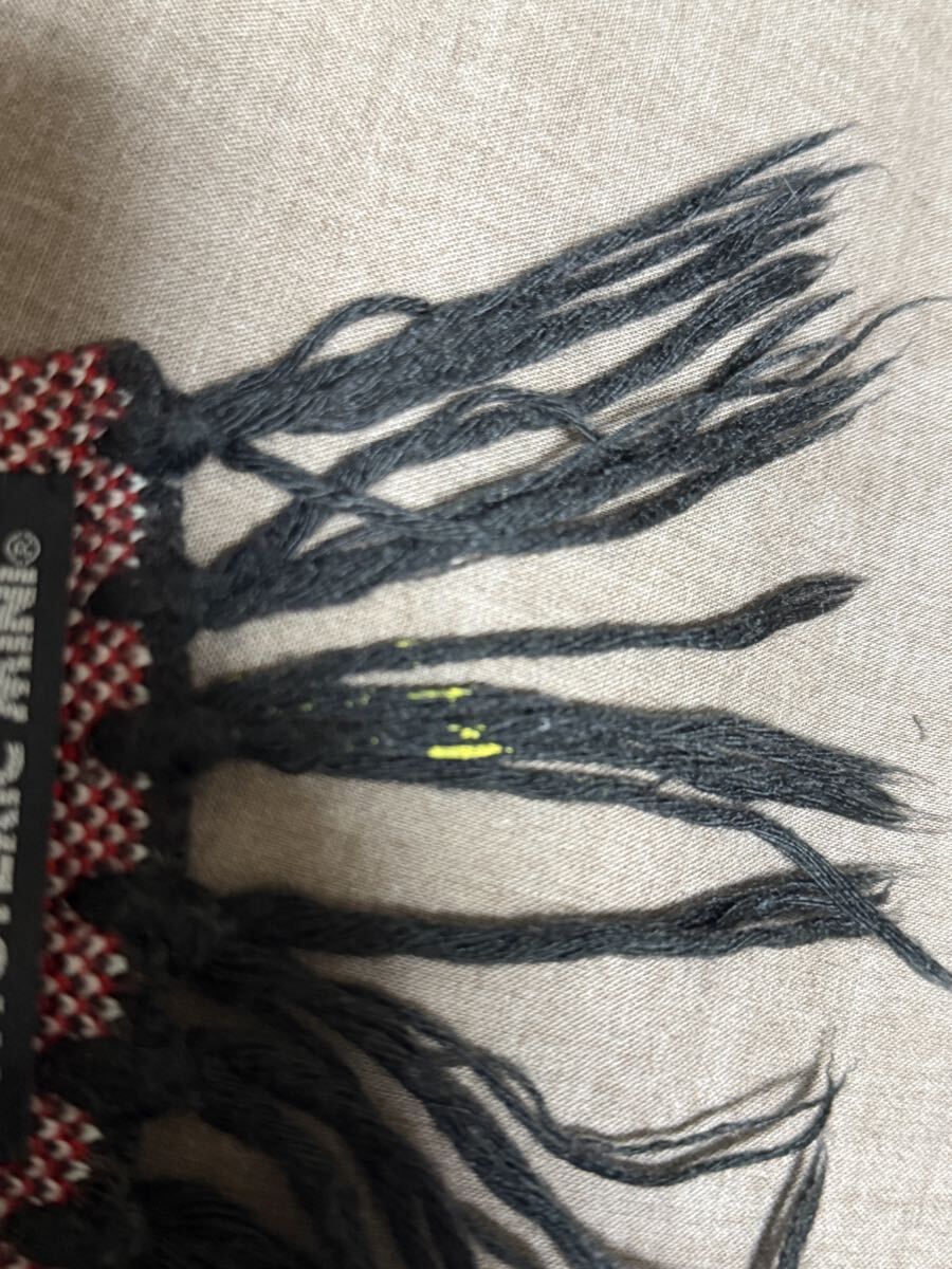 マフラーのフサフサ部分に黄色い絵の具汚れがあります。