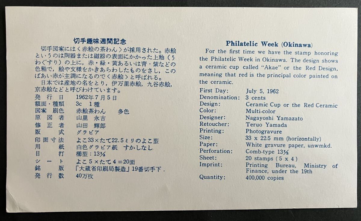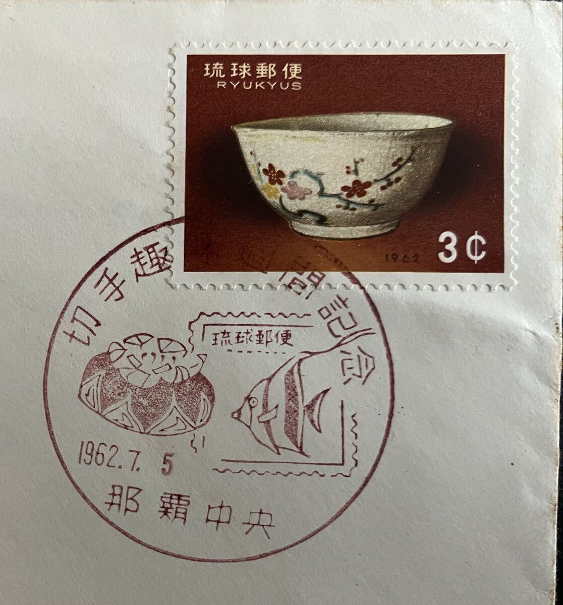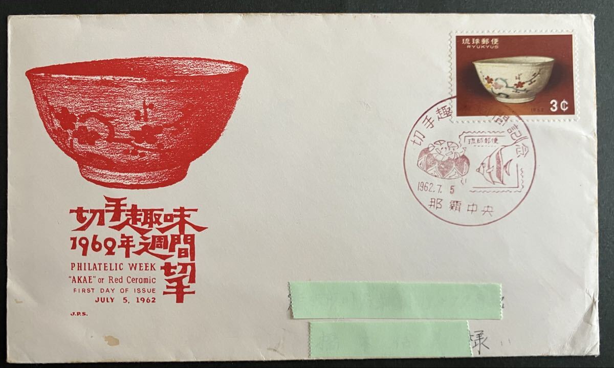 [実逓FDC]琉球切手 切手趣味週間 赤絵碗(1962.7.5 那覇中央)印 初日カバー