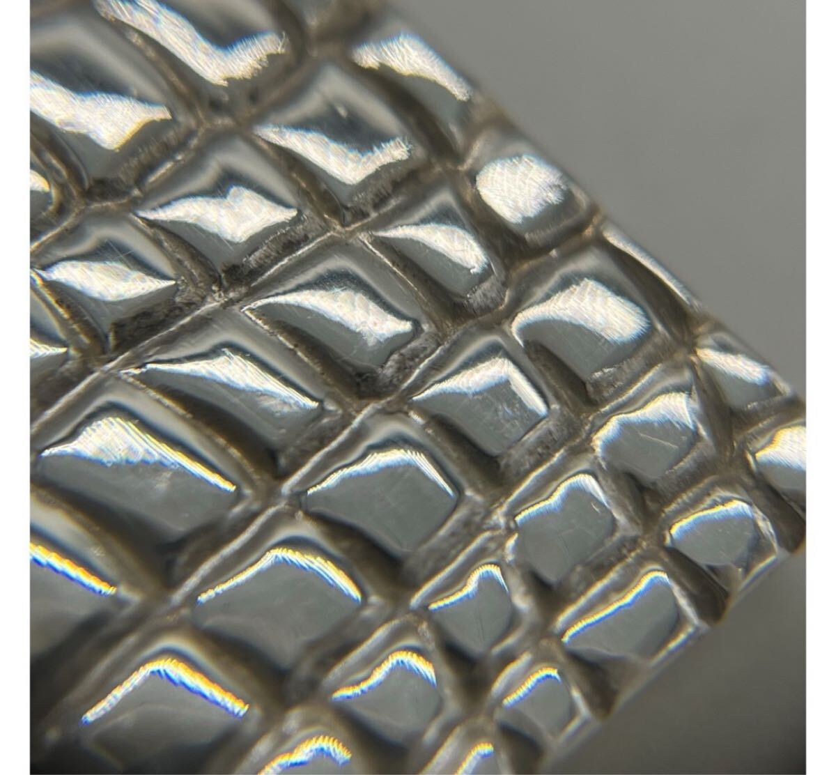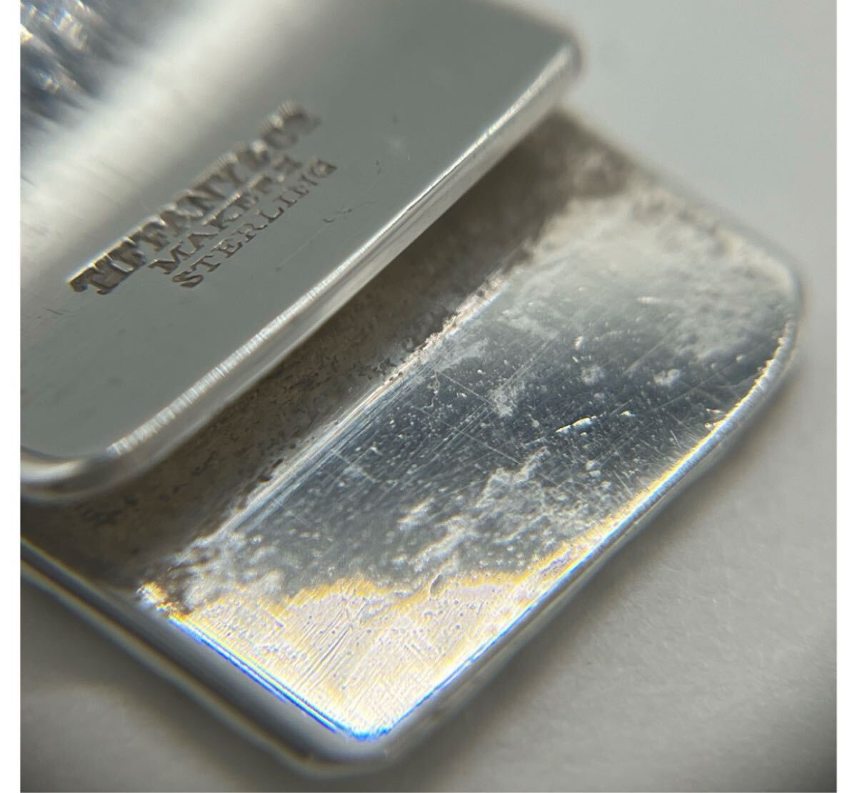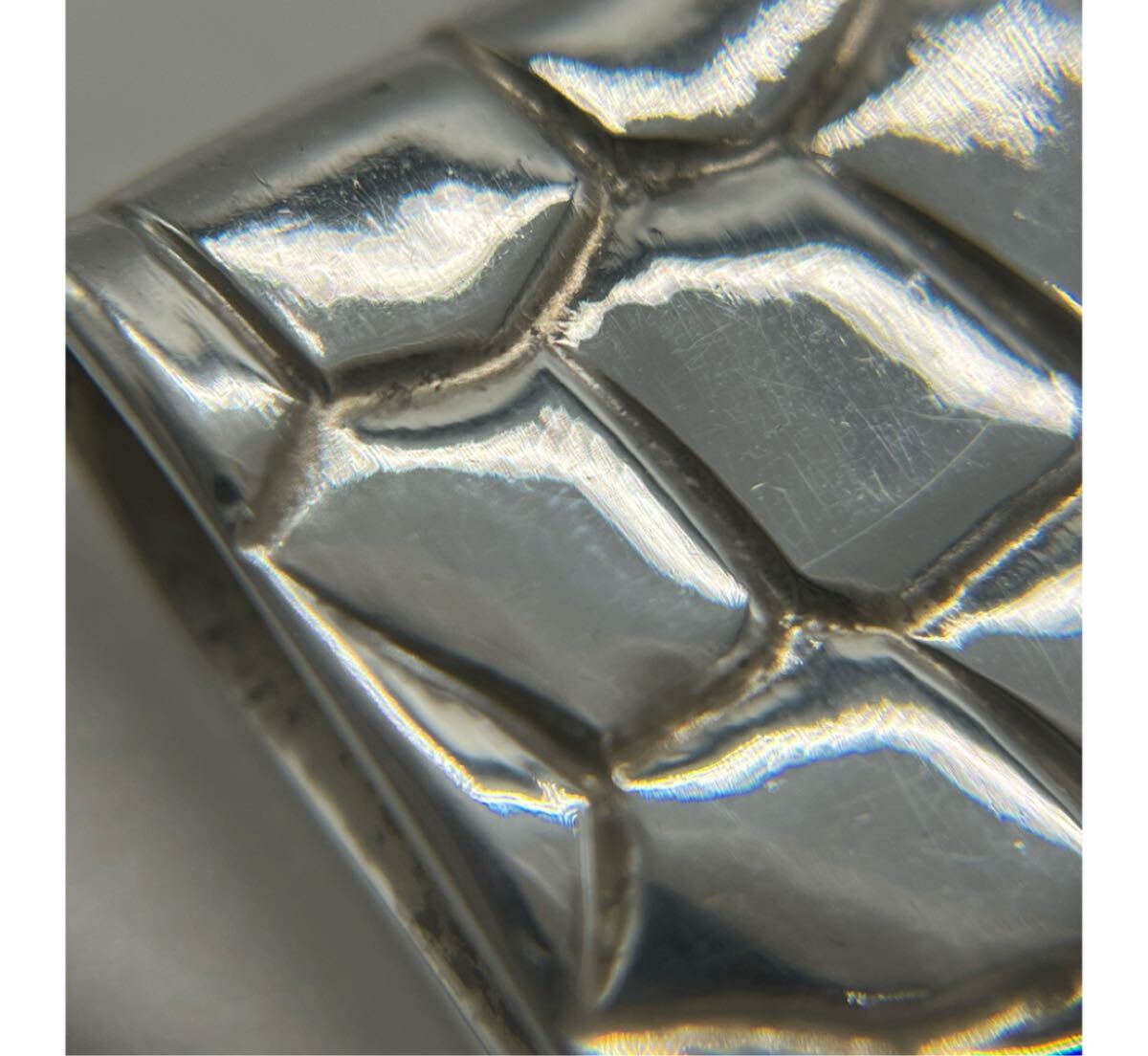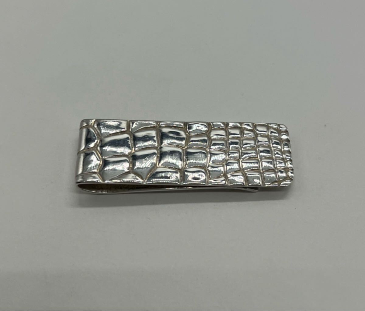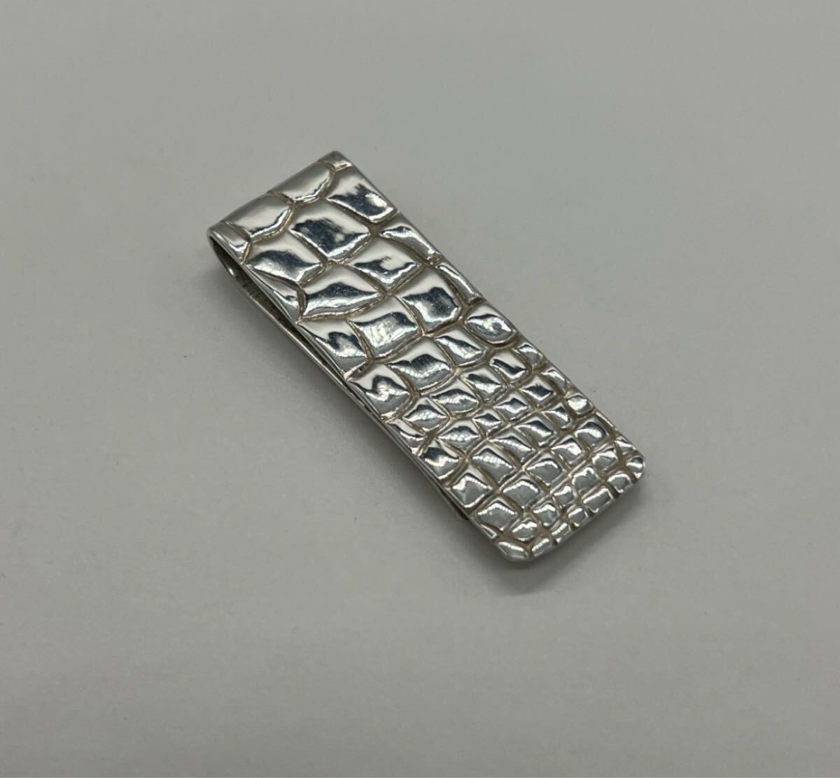 レザー製品に行われるクロコ型押しをシルバー素材のマネークリップで表現したヴィンテージティファニーならではの遊び心のあるお品物でございます。