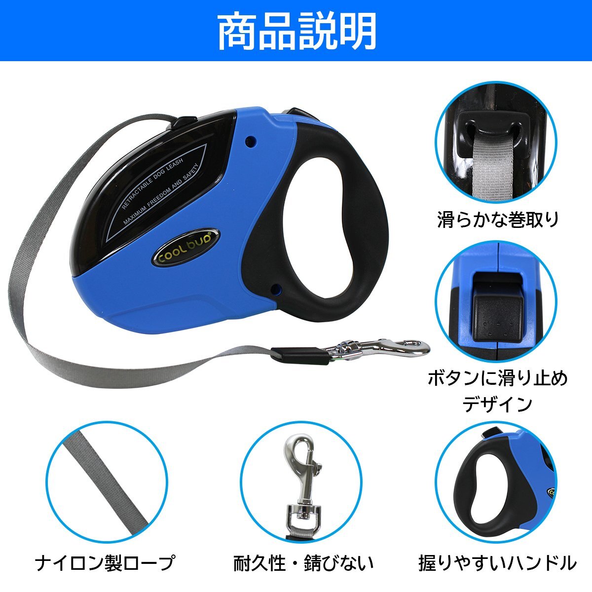 便利なロック機能付き!犬用 伸縮 リード 5m/5メートル 自動巻き取り ブルー 青 ペット 散歩 小型犬 中型犬 犬 ヒモ