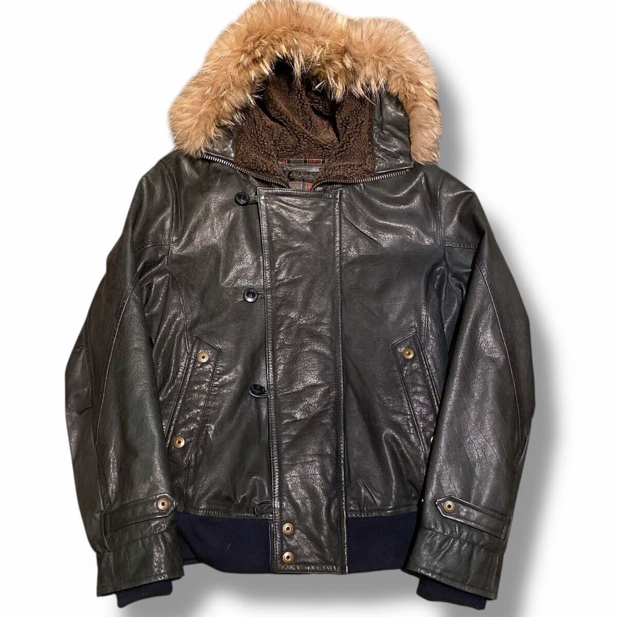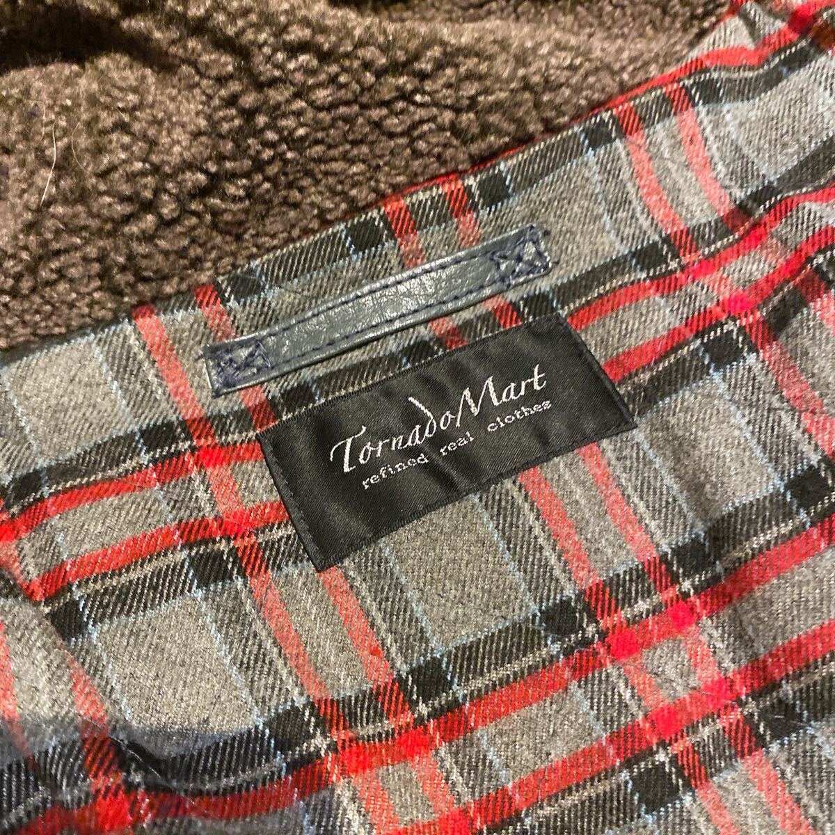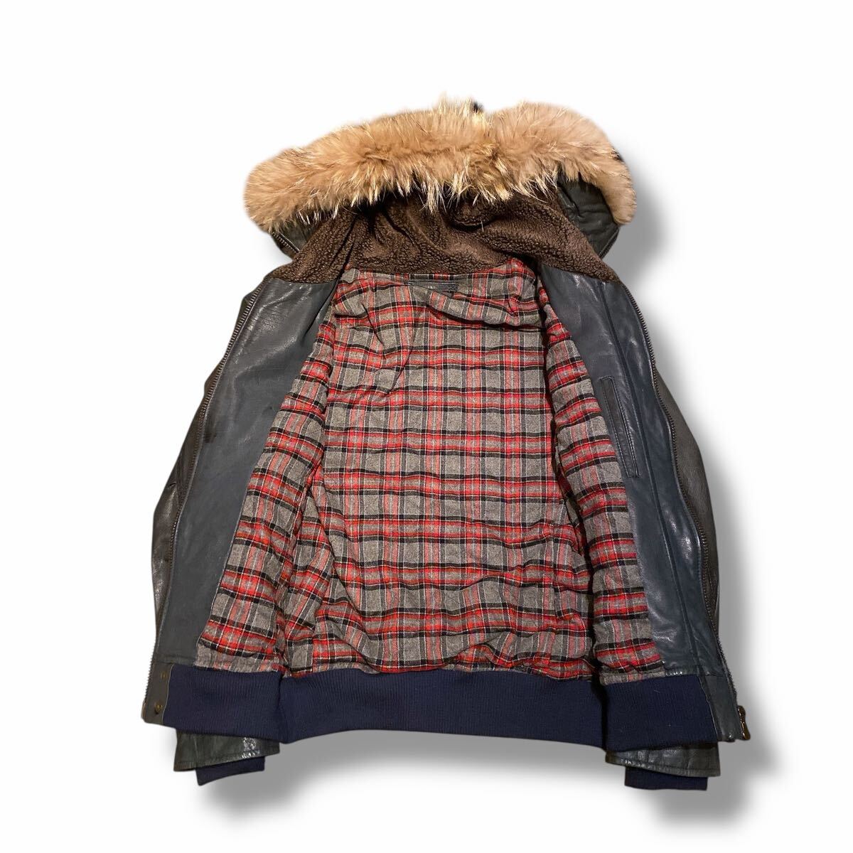 トルネードマートのN2Bタイプのファーレザージャケットです。写真では照明の具合でわかりづらいですがブルーグレーっぽい色合いです。裏地などはとても綺麗ですが袖に若干の使用感があります。それ以外は問題なく着用いただけます。