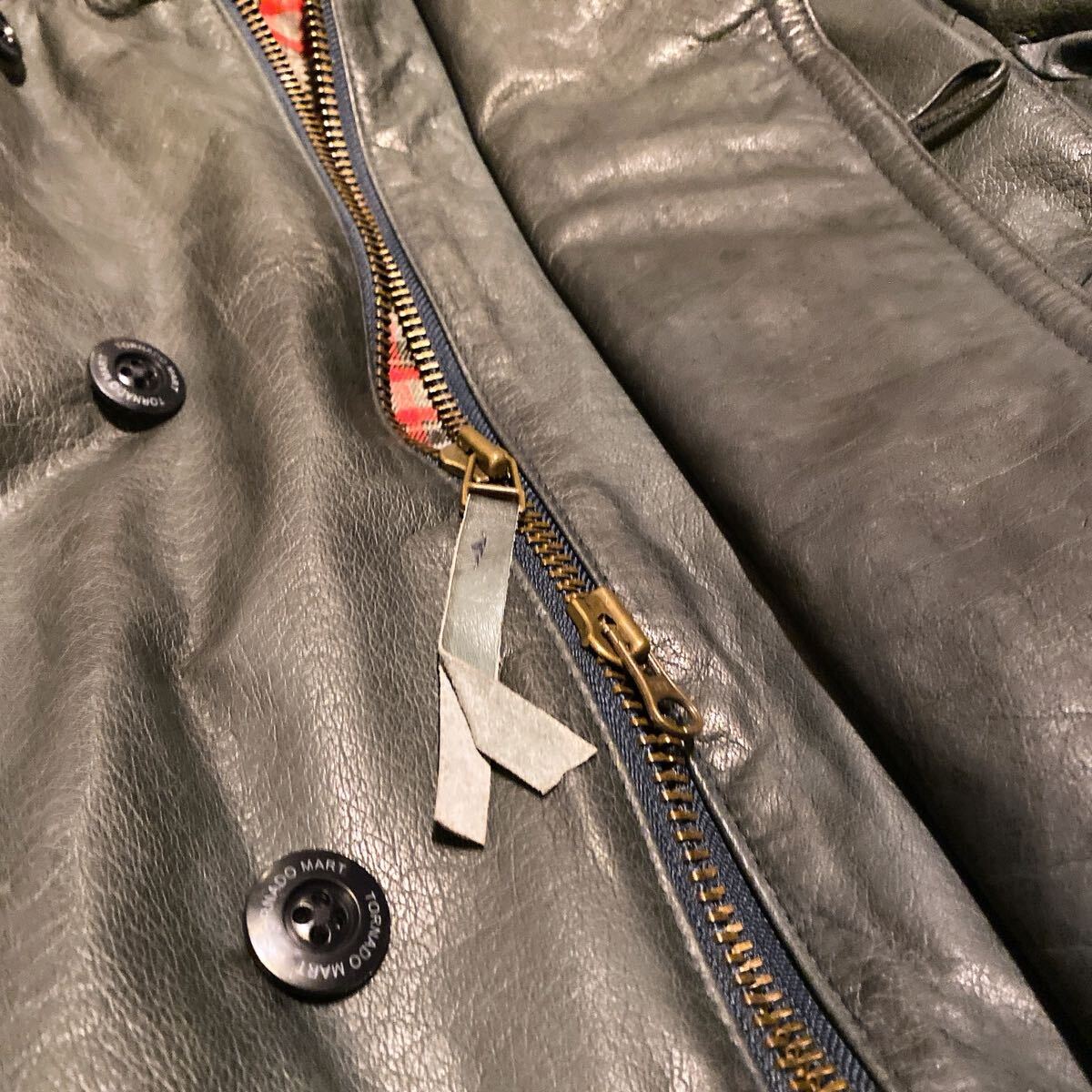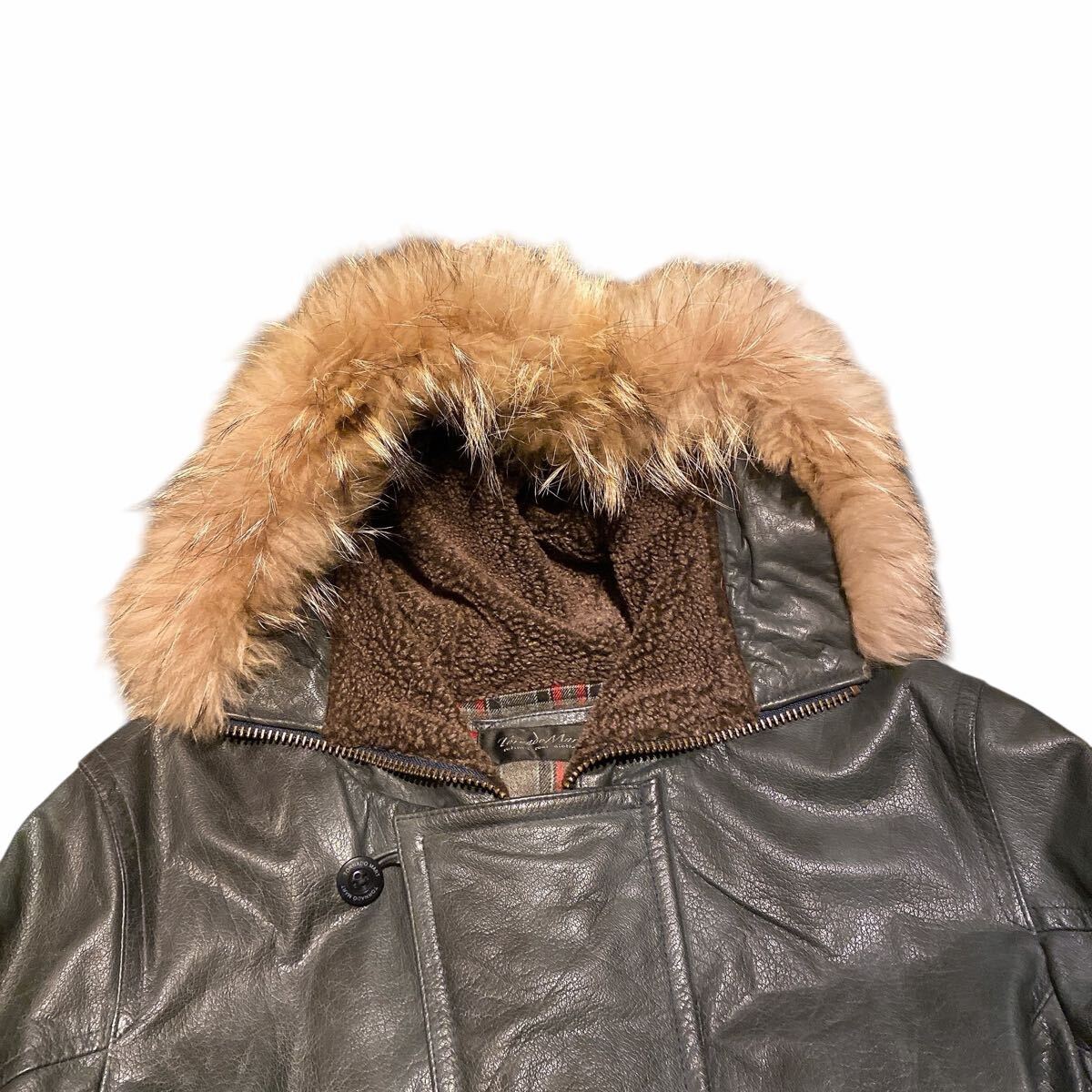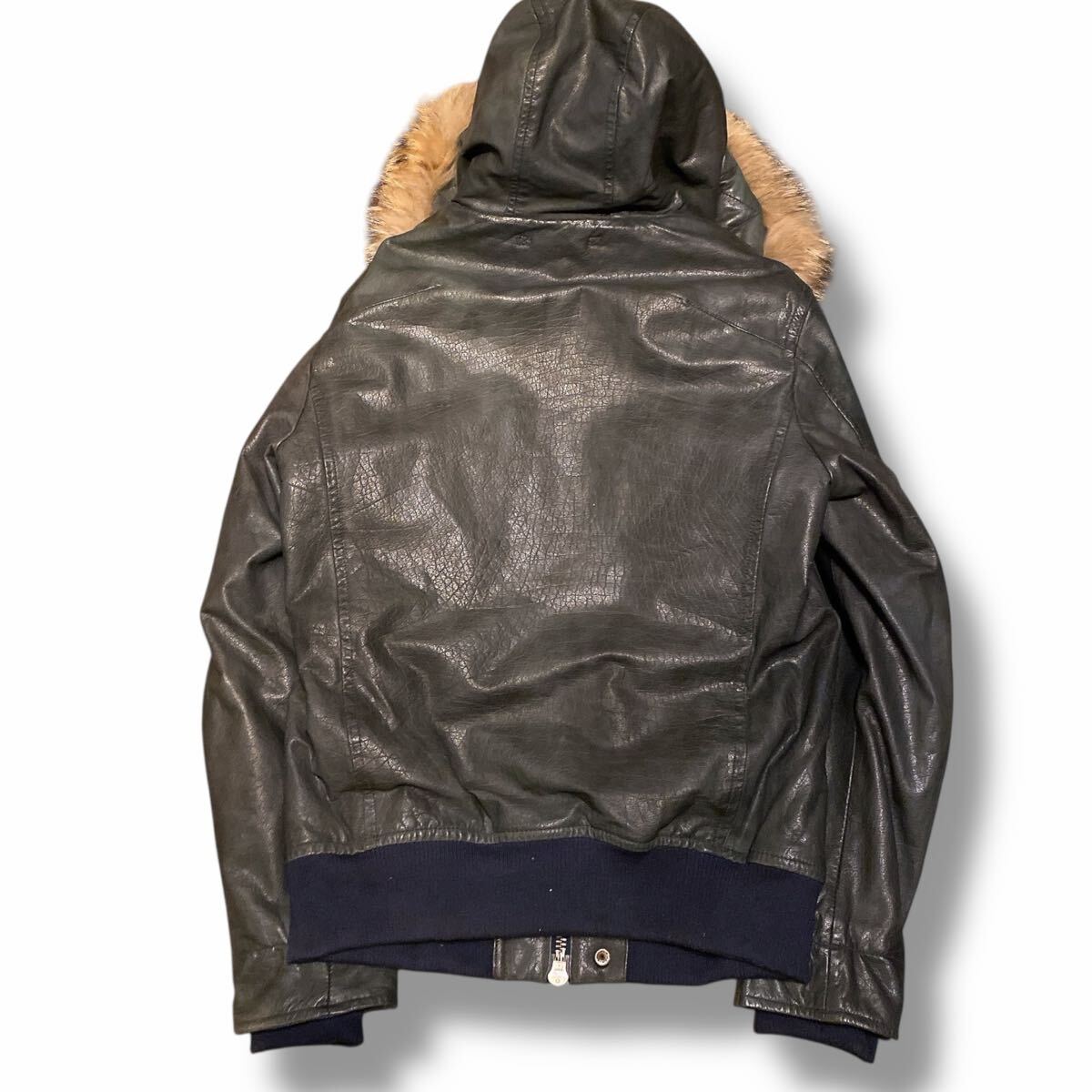 トルネードマートのN2Bタイプのファーレザージャケットです。写真では照明の具合でわかりづらいですがブルーグレーっぽい色合いです。裏地などはとても綺麗ですが袖に若干の使用感があります。それ以外は問題なく着用いただけます。