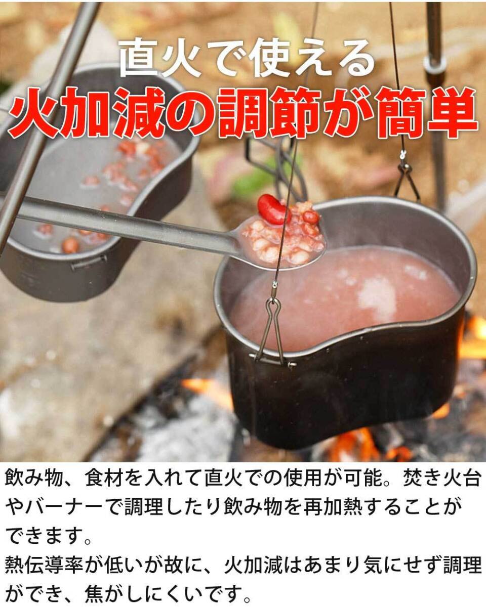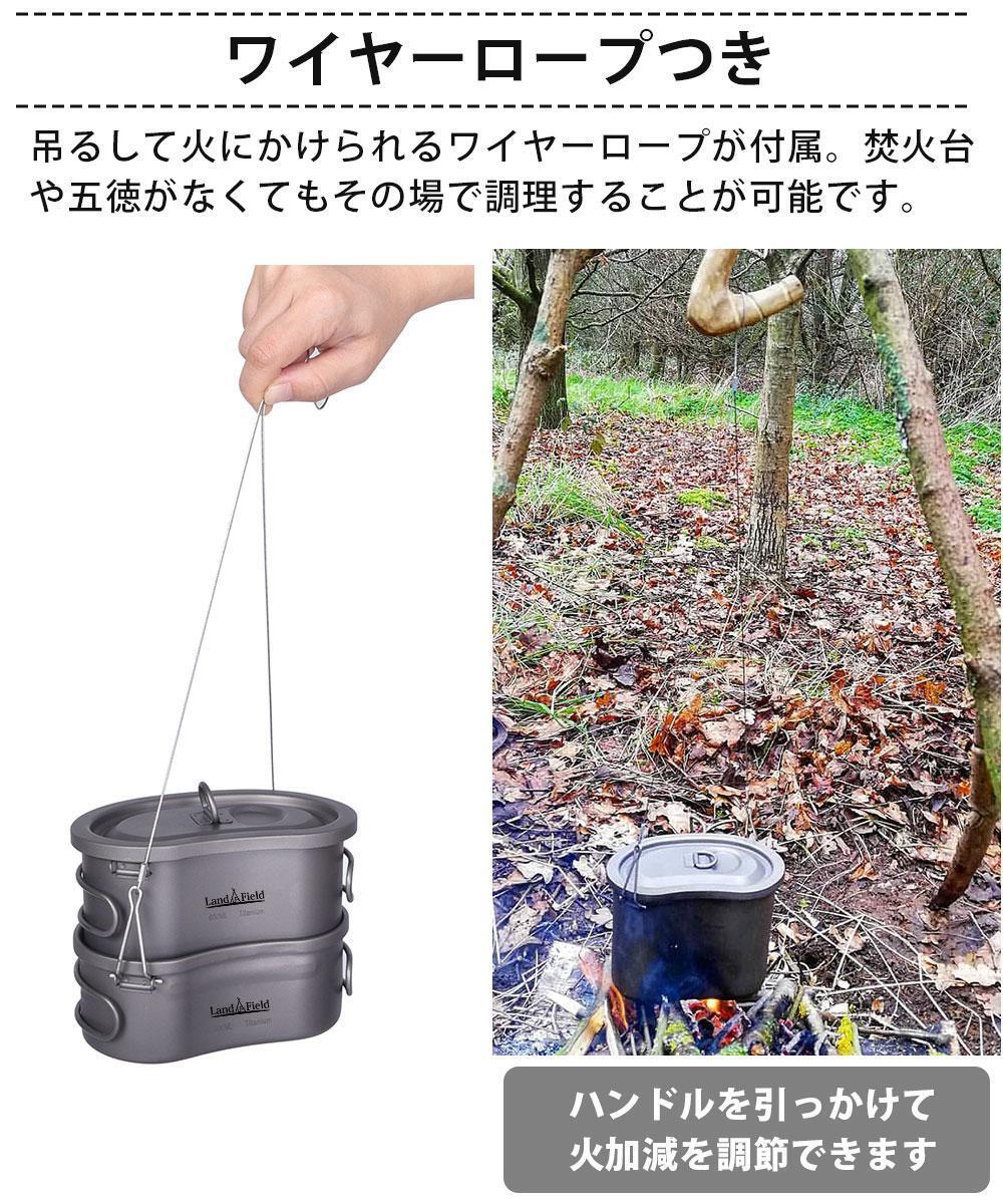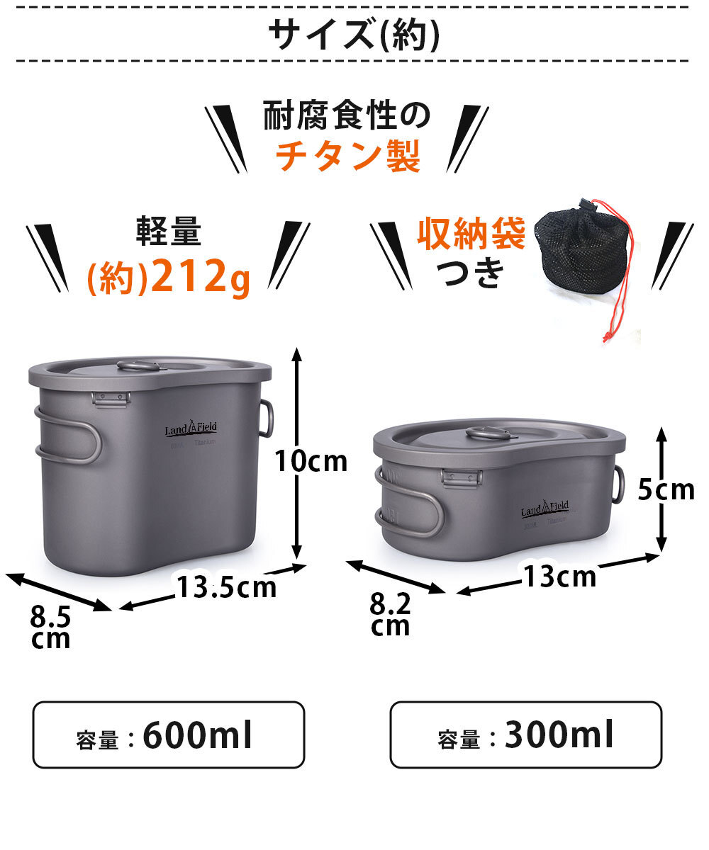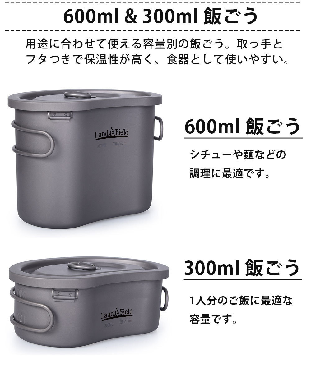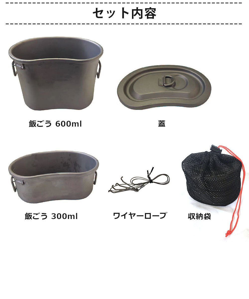 | 99.8%純チタン製の飯ごうセット 600ml、300mlの2種セット スープや麺の調理に適した深めの600mlと、一人用のご飯を炊くのにぴったりな300ml容量の2種類。 用途に分けてご使用いただる飯盒です。 ワイヤーロープつき 飯盒に引っかけて使えるワイヤーロープが付属 焚火台や五徳がなくても簡単に調理ができます。 軽量ながら高い強度 材質はチタンを採用。鉄やステンレスと比べて軽く、耐久性に優れています。 キャンプやアウトドアでも長くお使いいただけます。 1合相当(180ml)、2合相当(360ml)の計3合相当のお米が炊けます。 ステンレス製に比べて、火加減をそれほど気にしなくても済むチタン製なので、簡単においしくお米を炊くことができます。 抗菌&耐腐食性があるから安全 チタン特有の抗菌効果で雑菌の繁殖を防ぎ、耐食性が高いのが特徴です。 防汚性もあり油汚れも落としやすくて衛生的なので、食品にも安心して使えます。 すぐに食器を洗えない登山やハイキングにも最適です。 日常のお弁当箱としても使えます。 保温&保冷性ので食事の温度をキープ チタンの特性は鉄やステンレスに比べ熱伝導率が低く、保温・保冷性が高いことです。 ガラスやステンレス製の食器よりも食事の温度を長くキープできます。 冬は冷めにくく、夏はぬるくなりにくいので、ピクニックやバーベキューでは ご飯の美味しさをそこないません。 鍋・カップとして直火で使える 飲み物や食材を入れて直火調理が可能。 焚火台やバーナーで料理したり、飯ごうでスープなどをそのまま再加熱することもできます。 飯ごうには取っ手がついているので、 小型鍋のように使用したりカップのように持つこともできます。 野外での食事がしやすく、ソロキャンやファミキャン、BBQを盛り上げるクッカーセットです。 フタつき 蓋があるので、さらに保温性を高めることができます。 ふたは600ml、300mlどちらの飯ごうにも使えます。 重ねて収納できる収納袋つき 取っ手をたたみ、300ml飯ごう600ml飯ごうの順で重ねて収納することができます。 メッシュ素材で通気性の良い収納袋つきなので、使い終わってもコンパクトに収納できます。 スタック収納により、荷物がかさばらないのもキャンパーには嬉しいポイントです。 | ||||||||||||