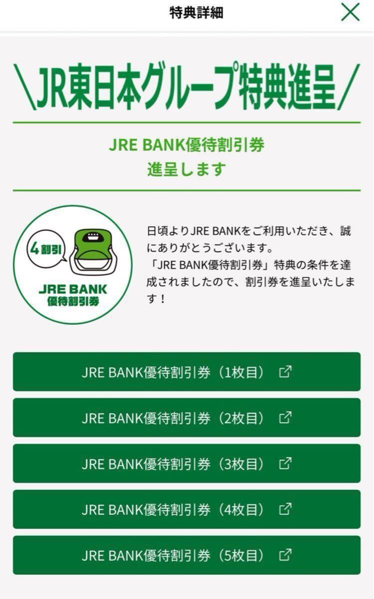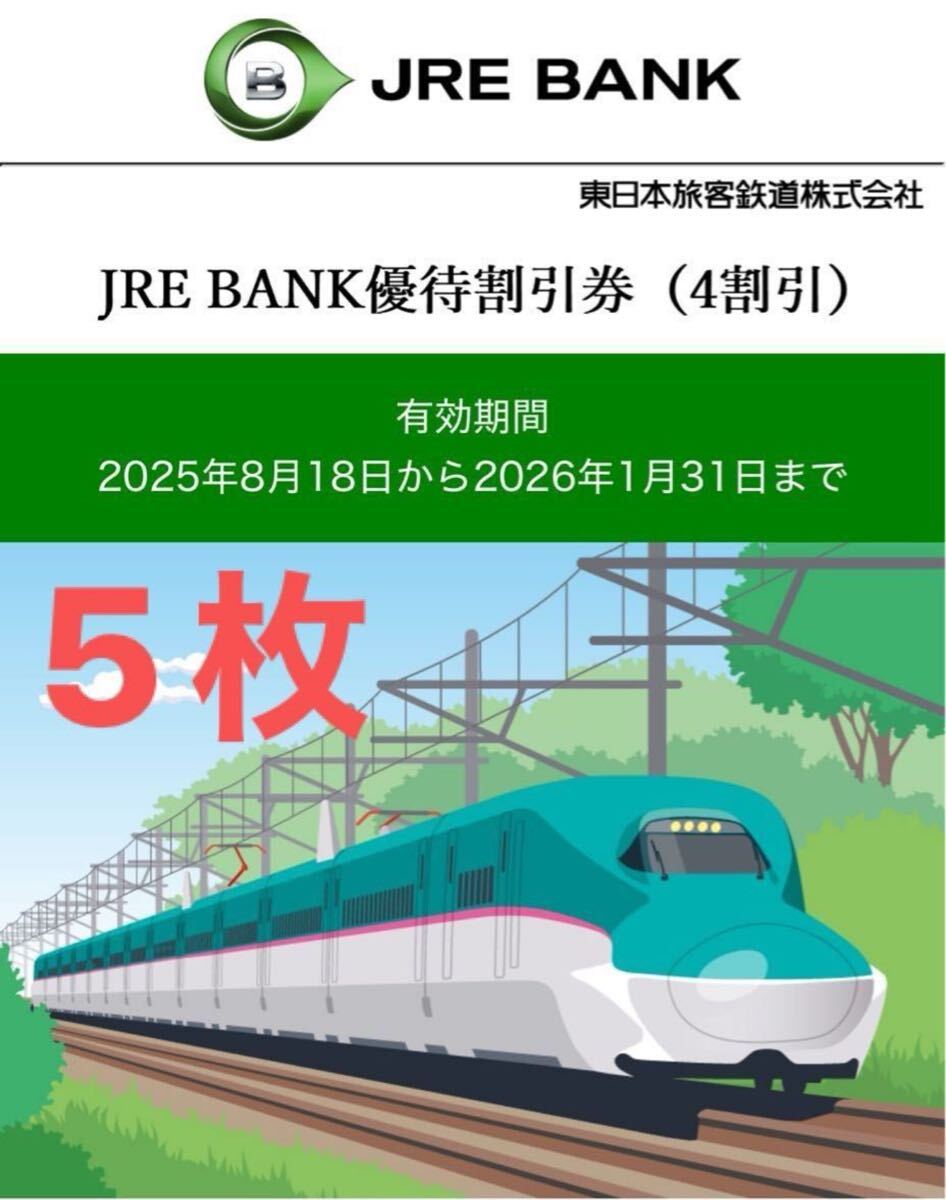 JRE BANK 優待割引券(4割引)5枚です。優待割引券番号とパスワードが印刷された紙をお送りします
