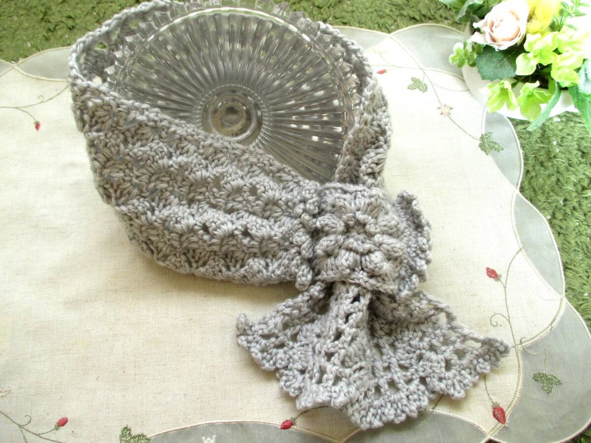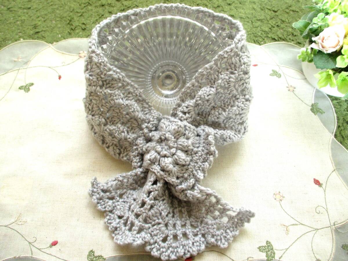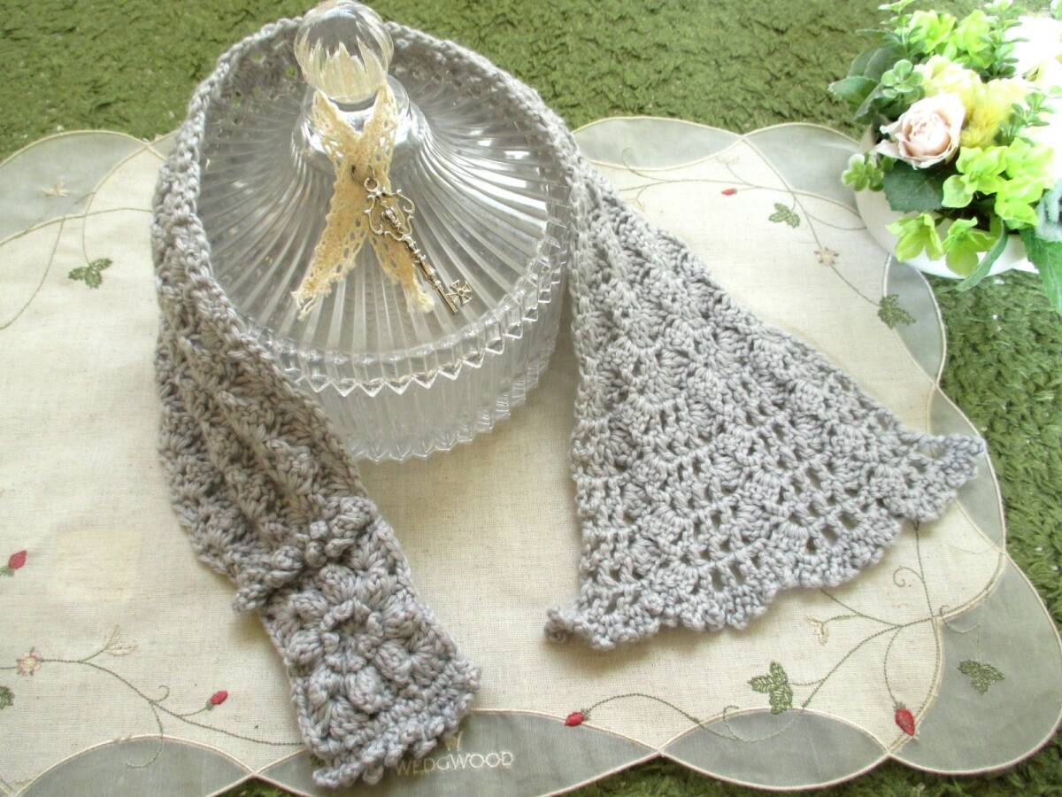 | やわらかシルクウール*手編み*ハンドメイド*モチーフ付フリルミニマフラー*ライトグレー |