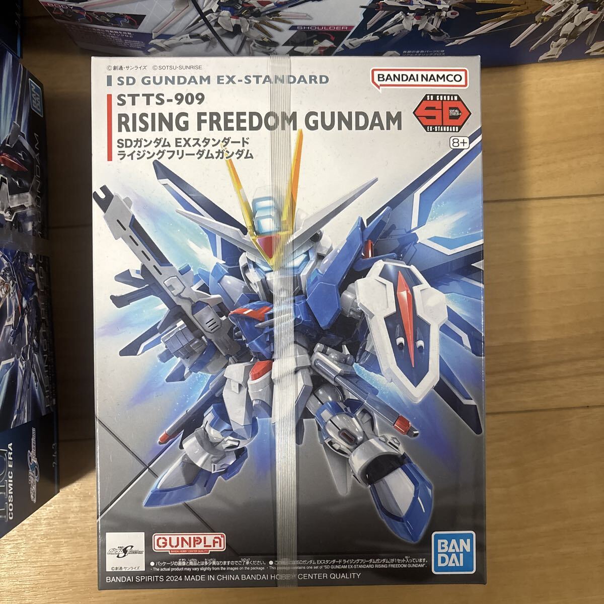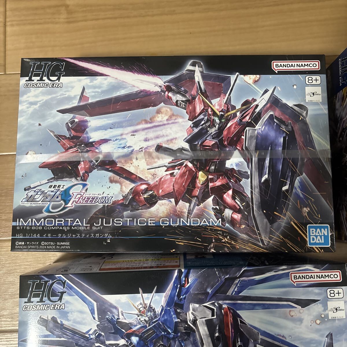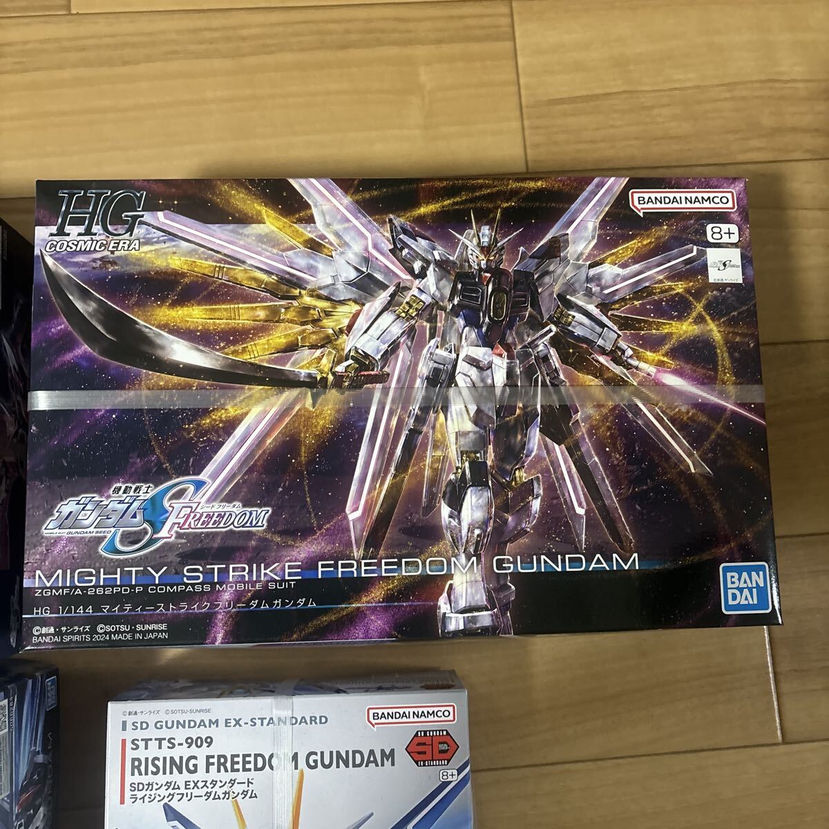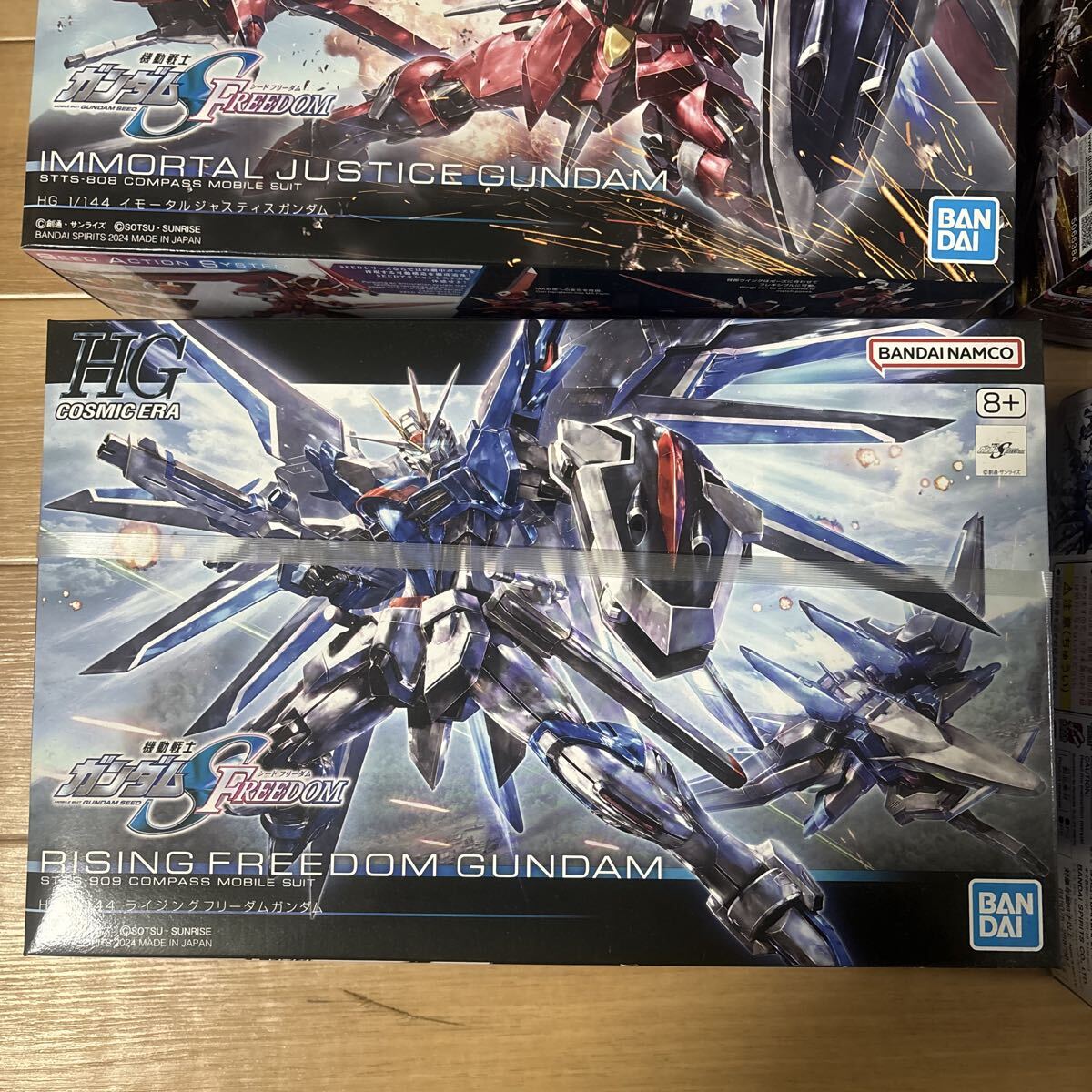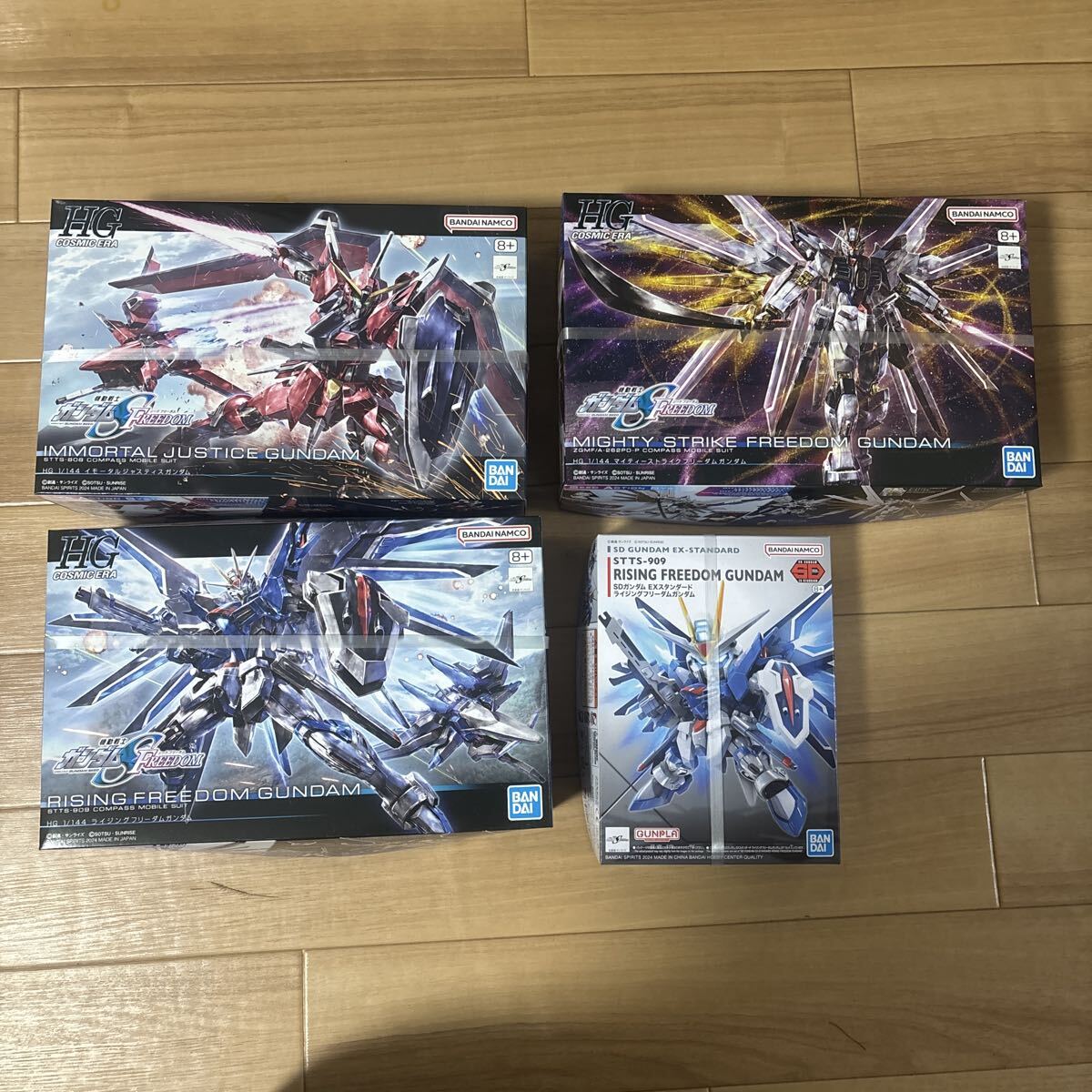 HGCE 1/144 ライジングフリーダムガンダム、マイティーストライクフリーダム、イモータルジャスティス、SDガンダム・ライジングフリーダムの4個セットで出品します。