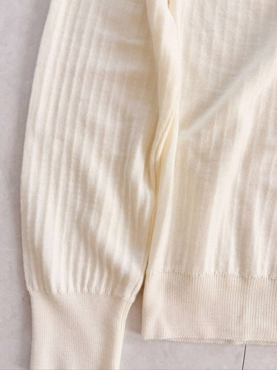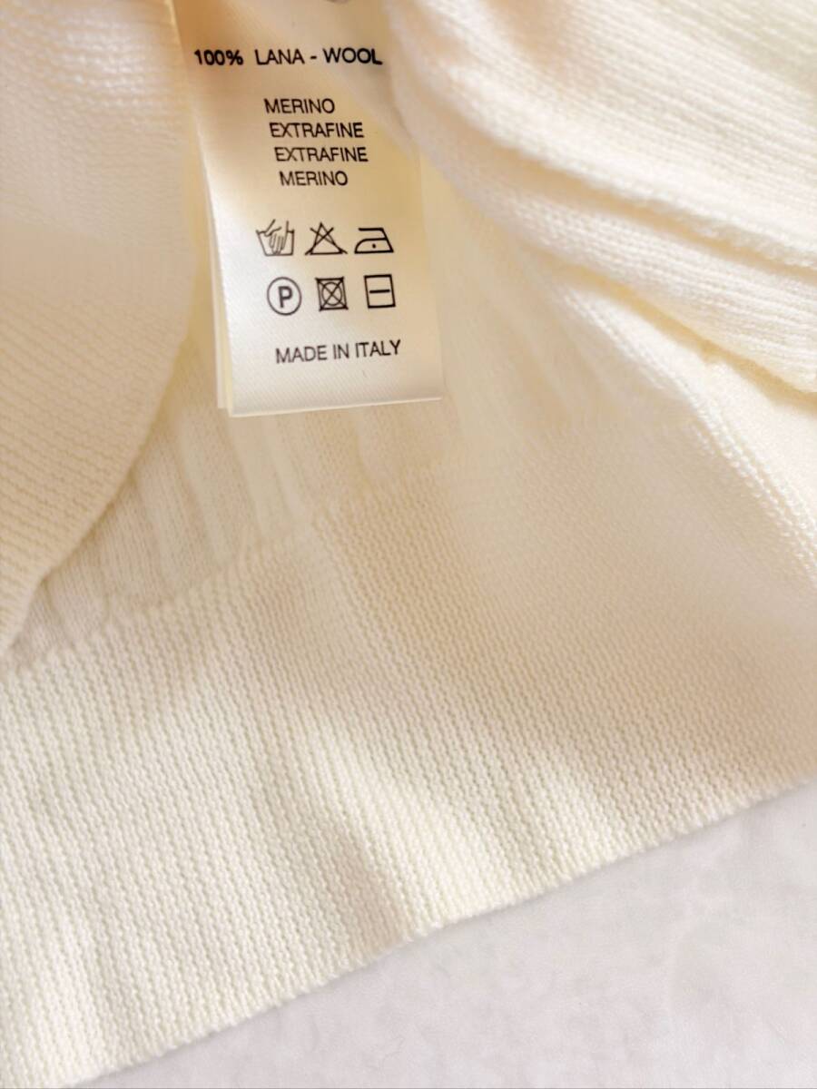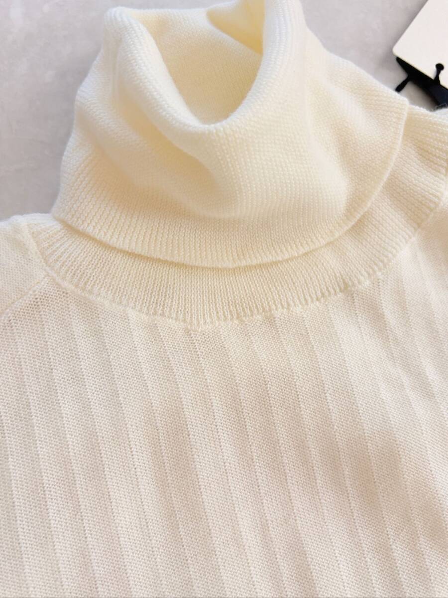 ロベルト コリーナが持ち味とする滑らかな編地設計と、素材のポテンシャルを最大限に引き出す糸使いが際立つ、エクストラファインメリノウール100%のタートルネックニット。 使用される原毛は17.5〜18.5ミクロン級の極細繊維で、油脂含有量のバランスに優れたトップレンジのメリノを採用。 糸は過度に撚りを掛けず、軽いツイストで膨らみと柔軟性を保持した“ソフトスパン”に近い仕様のため、肌離れが滑らかで、ウール特有のチクチク感をほとんど感じさせない点が特徴です。 編みはハイゲージをベースとしながら、段階的にテンションを調整することで、軽量性と保形性を両立した均整の取れた生地厚に仕上げています。タートル部分はロール時のボリューム過多を避けるため、編み目を微妙に詰めた高密度リブを採用。長時間の着用でもネックラインが崩れにくく、立体的な筒状シルエットを維持するあたりに、ロベルト コリーナの技術の精度が表れています。 肩周りは前振りに設定し、袖山の角度をやや落とした“可動域を確保する設計”。これにより、タートルネック特有の首回りの密着感をほどよく分散し、ウールニットとしては驚くほどストレスの少ない着用感を実現しています。メリノウール特有のドレープ性も美しく、着用時の縦の落ち感がシルエットをよりエレガントに見せます。 エクストラファインメリノの上品な艶は、カシミアとは異なる“さらりとした光沢”が魅力で、ジャケットインでもアウター下でも調和する汎用性の高さを発揮。ロベルト コリーナの丁寧なクラフトマンシップが凝縮された、ワードローブの核となる上質タートルネックニットです。 ブランド:roberto collina / ロベルトコリーナ 素材:エクストラファインメリノウール100% サイズ:46 着丈:63cm 袖丈:ラグラン 肩幅:ラグラン 身幅:50cm 裄丈:82cm ※迅速なお取引を心がけさせていただいております。オークション終了より24時間以内にご連絡をいただけない場合、土日祝日を除き48時間以内にお支払い手続きをいただけない場合は、お取引の意思なしと判断させていただき取引キャンセルとさせていただきます。 万が一上記が不可の場合は事前にご連絡いただくか、入札をお控えいただきますようお願い申し上げます。 ※なるべく現物に近いお色味で撮影するよう心掛けておりますが、閲覧環境の違い等によって違いが出る場合があります。 差し替えトラブルを避ける意味でも上述した旨含め、イメージと違う等での返品は受け付けておりません。 百貨店並みのサービスを求める方や神経質な方の入札はお控えいただきますようお願い申し上げます。 また、差替えやSNS使用後の返品等を防止するためためにも、原則返品には応じられません。 疑問点や心配事等がある場合は入札前に質問欄にてお問い合わせください。 ※当方が出品するすべての商品は間違いなく本物ブランド品となりますので、安心してオークションにご参加ください。 万が一、第三者等により偽物と判断された場合、商品の返品、お支払いただきました全額を返金をいたします。 |