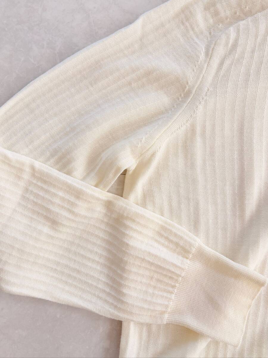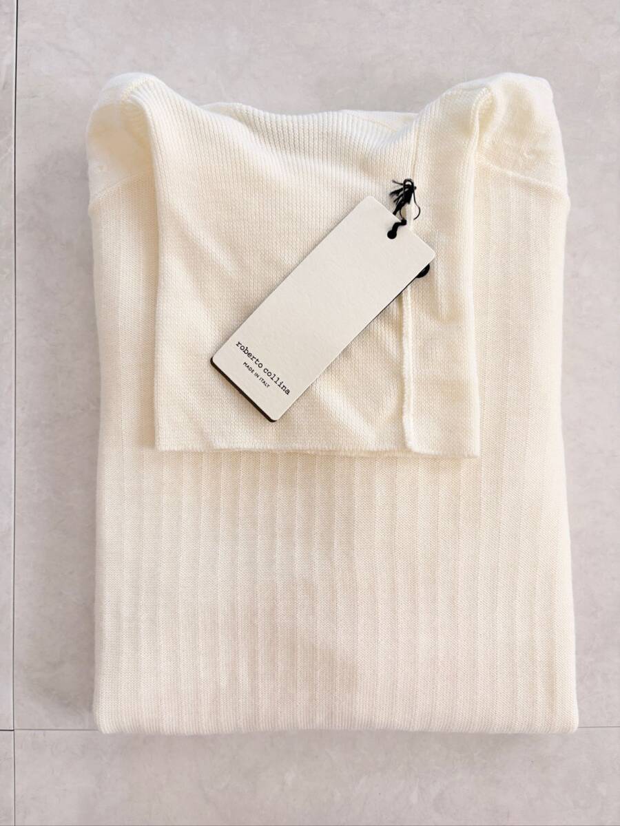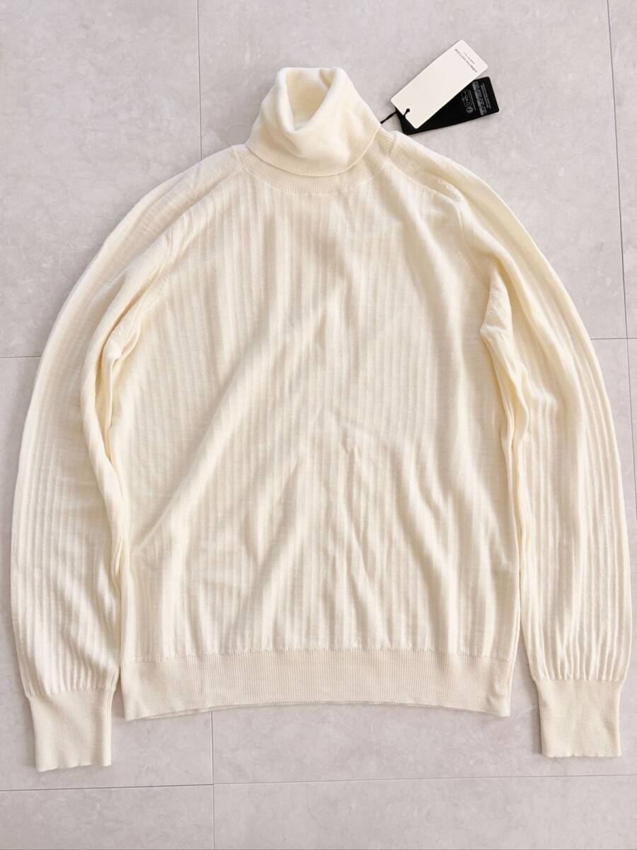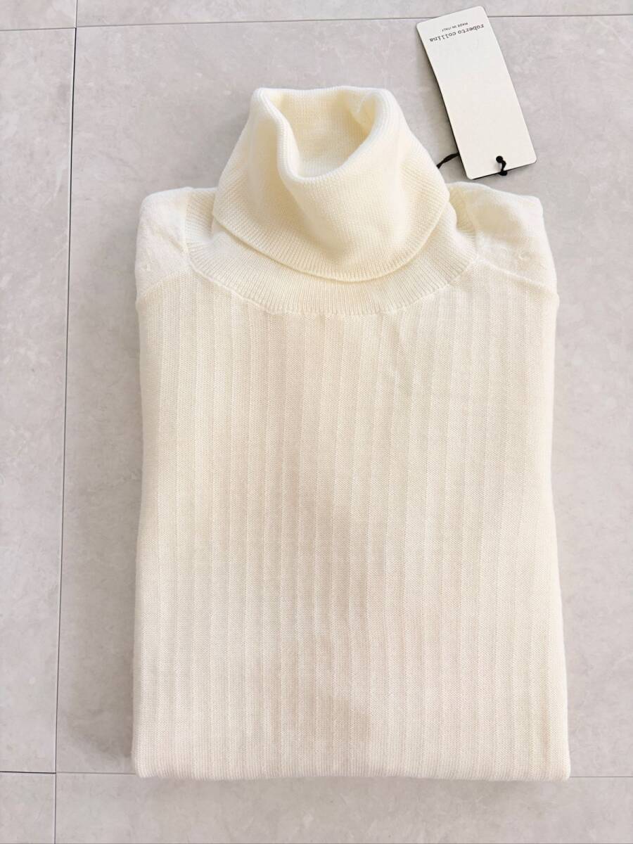 ロベルト コリーナが持ち味とする滑らかな編地設計と、素材のポテンシャルを最大限に引き出す糸使いが際立つ、エクストラファインメリノウール100%のタートルネックニット。 使用される原毛は17.5〜18.5ミクロン級の極細繊維で、油脂含有量のバランスに優れたトップレンジのメリノを採用。 糸は過度に撚りを掛けず、軽いツイストで膨らみと柔軟性を保持した“ソフトスパン”に近い仕様のため、肌離れが滑らかで、ウール特有のチクチク感をほとんど感じさせない点が特徴です。 編みはハイゲージをベースとしながら、段階的にテンションを調整することで、軽量性と保形性を両立した均整の取れた生地厚に仕上げています。タートル部分はロール時のボリューム過多を避けるため、編み目を微妙に詰めた高密度リブを採用。長時間の着用でもネックラインが崩れにくく、立体的な筒状シルエットを維持するあたりに、ロベルト コリーナの技術の精度が表れています。 肩周りは前振りに設定し、袖山の角度をやや落とした“可動域を確保する設計”。これにより、タートルネック特有の首回りの密着感をほどよく分散し、ウールニットとしては驚くほどストレスの少ない着用感を実現しています。メリノウール特有のドレープ性も美しく、着用時の縦の落ち感がシルエットをよりエレガントに見せます。 エクストラファインメリノの上品な艶は、カシミアとは異なる“さらりとした光沢”が魅力で、ジャケットインでもアウター下でも調和する汎用性の高さを発揮。ロベルト コリーナの丁寧なクラフトマンシップが凝縮された、ワードローブの核となる上質タートルネックニットです。 ブランド:roberto collina / ロベルトコリーナ 素材:エクストラファインメリノウール100% サイズ:46 着丈:63cm 袖丈:ラグラン 肩幅:ラグラン 身幅:50cm 裄丈:82cm ※迅速なお取引を心がけさせていただいております。オークション終了より24時間以内にご連絡をいただけない場合、土日祝日を除き48時間以内にお支払い手続きをいただけない場合は、お取引の意思なしと判断させていただき取引キャンセルとさせていただきます。 万が一上記が不可の場合は事前にご連絡いただくか、入札をお控えいただきますようお願い申し上げます。 ※なるべく現物に近いお色味で撮影するよう心掛けておりますが、閲覧環境の違い等によって違いが出る場合があります。 差し替えトラブルを避ける意味でも上述した旨含め、イメージと違う等での返品は受け付けておりません。 百貨店並みのサービスを求める方や神経質な方の入札はお控えいただきますようお願い申し上げます。 また、差替えやSNS使用後の返品等を防止するためためにも、原則返品には応じられません。 疑問点や心配事等がある場合は入札前に質問欄にてお問い合わせください。 ※当方が出品するすべての商品は間違いなく本物ブランド品となりますので、安心してオークションにご参加ください。 万が一、第三者等により偽物と判断された場合、商品の返品、お支払いただきました全額を返金をいたします。 |