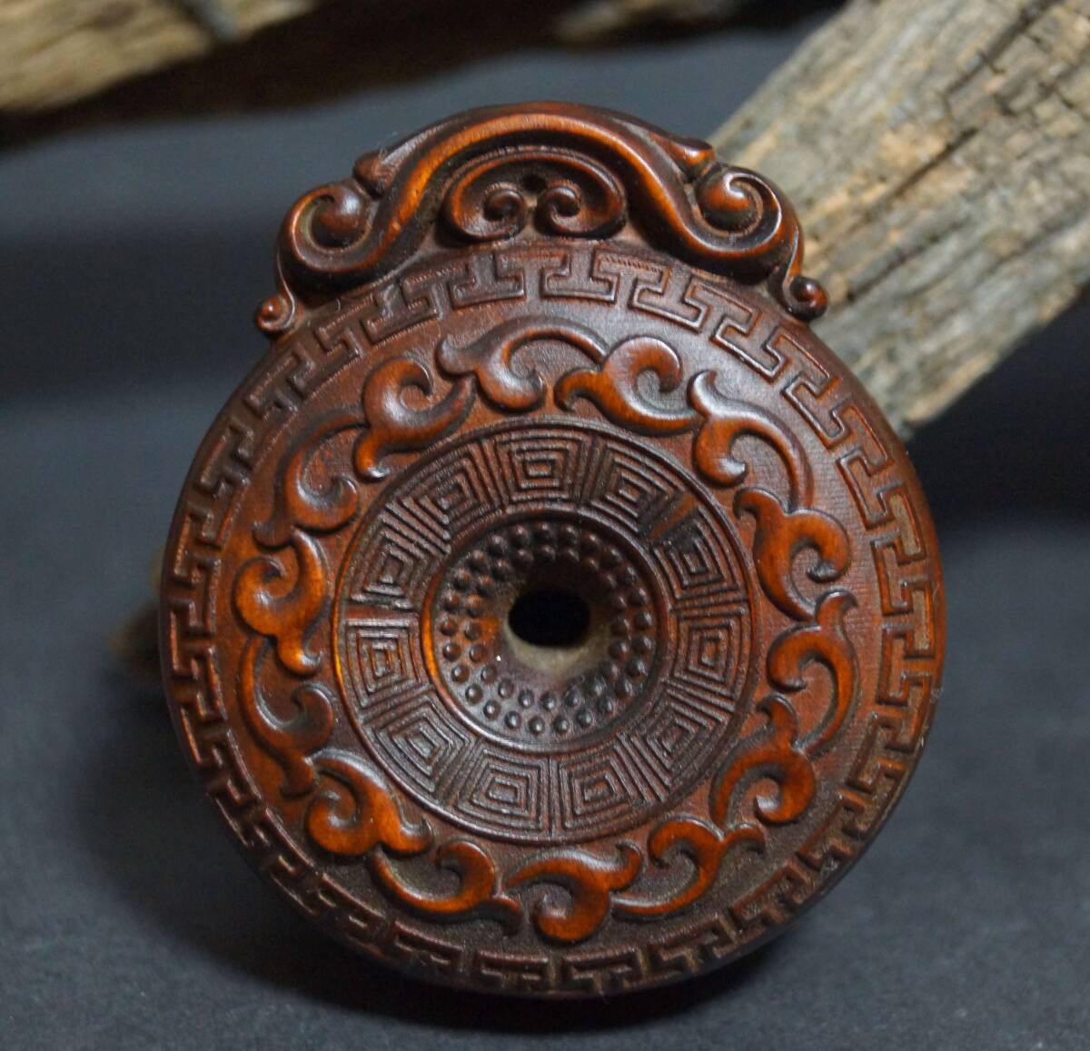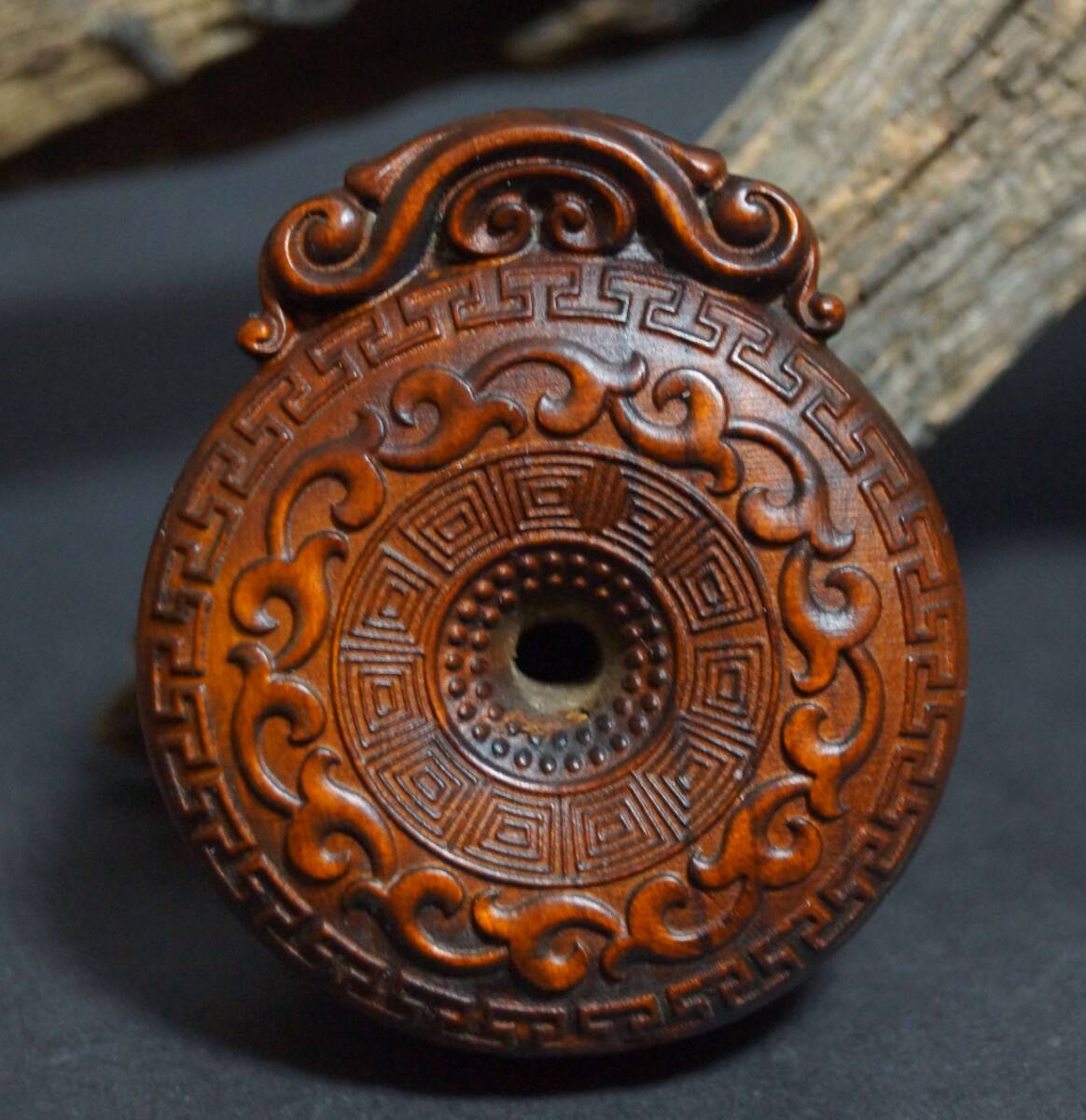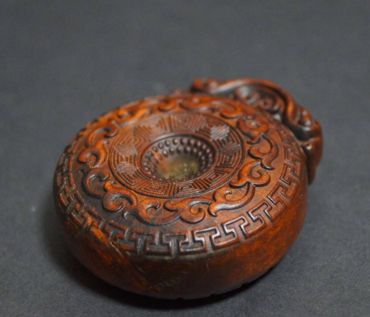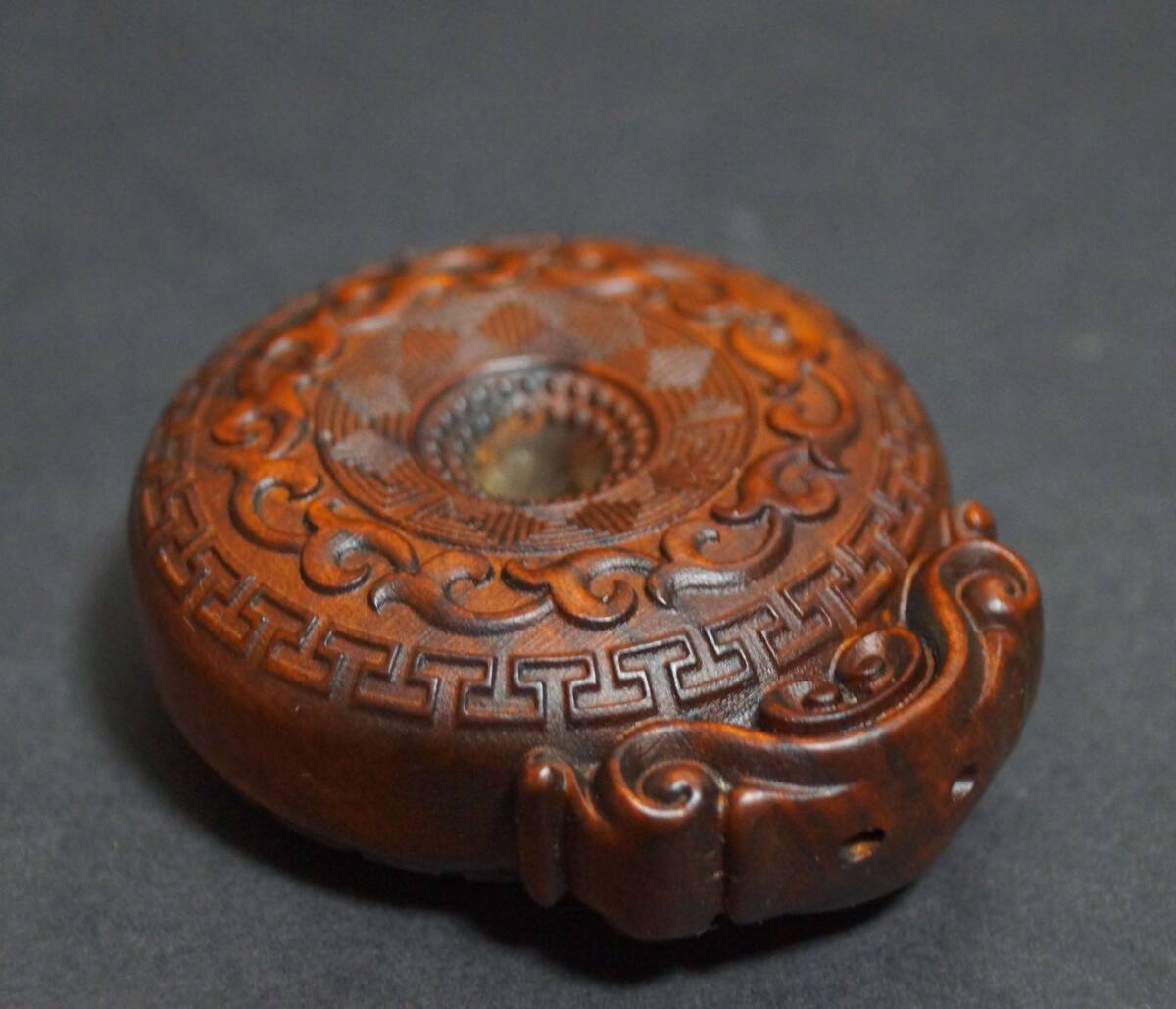 【寂】木製 拓植製 つげ 黄楊木 細工彫り 両面彫 八卦 根付 緒締玉 提げ物 装飾品 縁起物 置物 飾り物 s71205