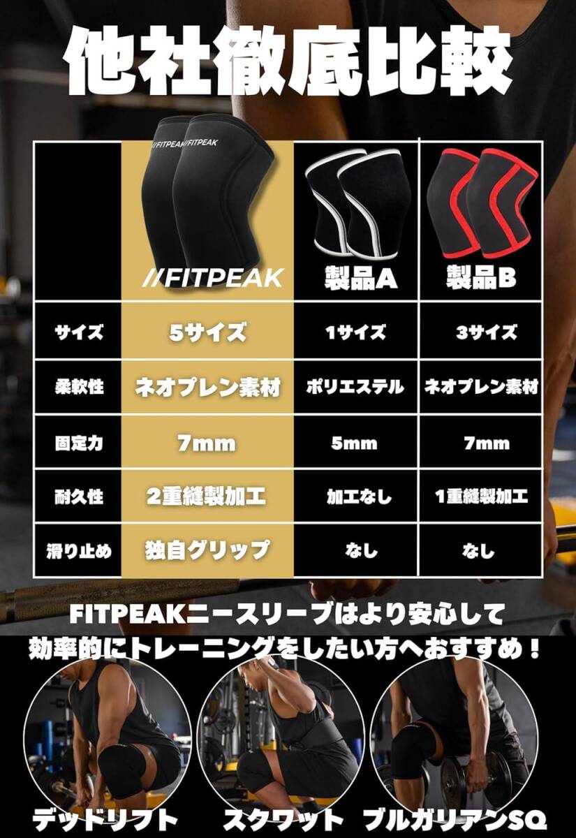 • 【効果】FITPEAKニースリーブは安定したフォームとスムーズな筋肉動きを実現し、重量UPや筋肥大に効果的