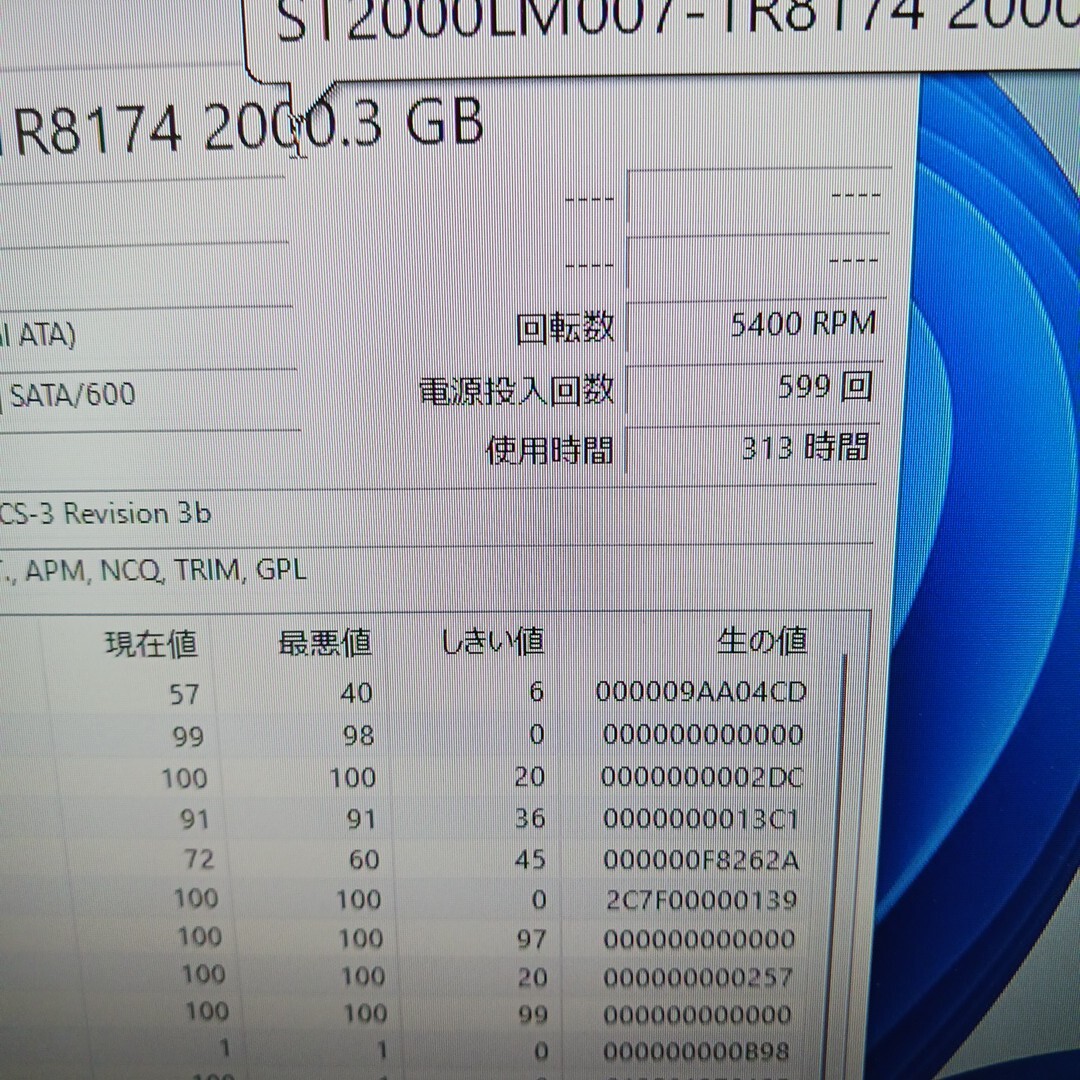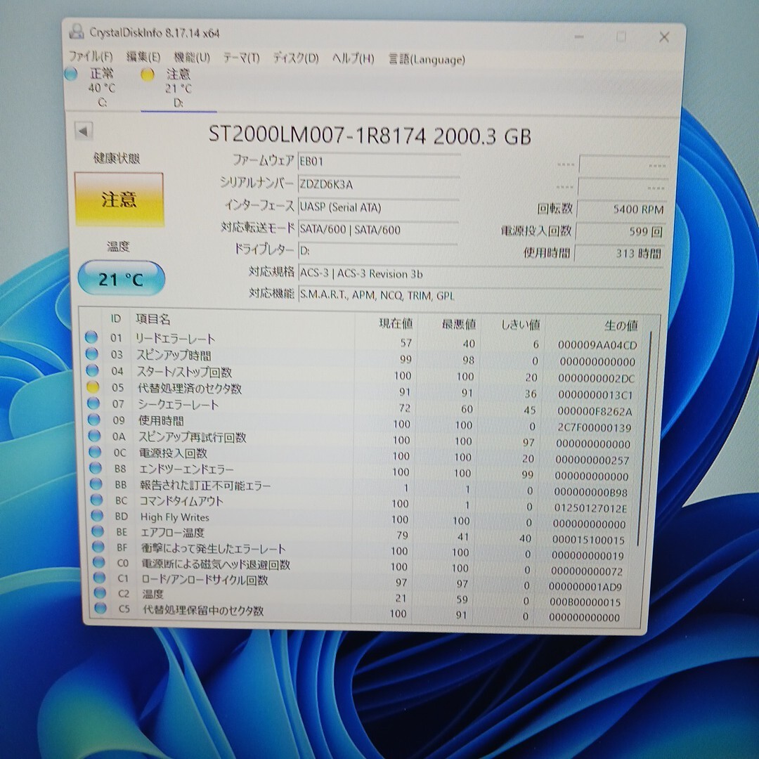 通電確認済み。健康状態 注意(代替処理済みセクター)になっておりますのでジャンクになります。