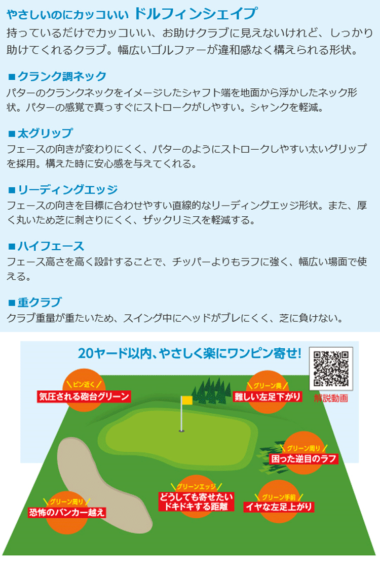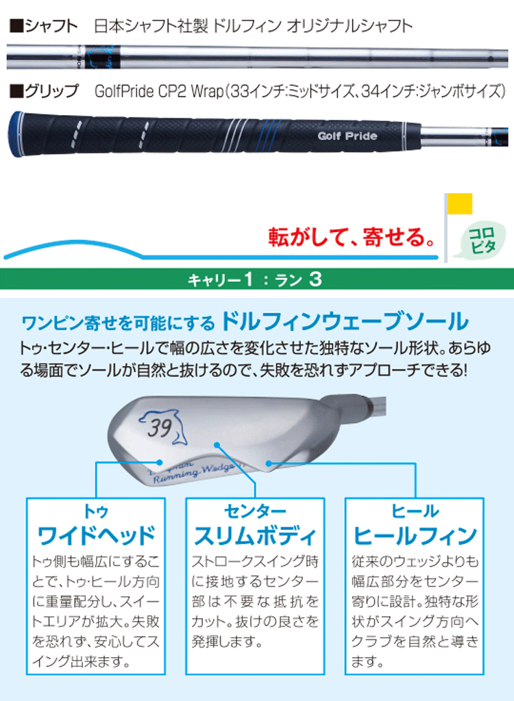 【商品特徴】 <20ヤード以内をワンピン寄せ。コロコロ転がして、ピタっと寄せる。> ■WAVE SOLE ワンピン寄せを可能にする ドルフィンウェーブソール ■DOLPHIN SHAPE やさしいのにカッコいい ドルフィンシェイプ 【商品詳細】 ●状態:新品・未使用品 ●商品番号:DRW-119 ●ヘッド素材:軟鉄(ヘッド部分) ●製造国:日本 ●ロフト:39度 ●クラブ長さ:33インチ ●ライ角:67度 ●シャフト:日本シャフト社製 ドルフィン スチールシャフト ●重量:519g ●グリップ:GolfPride CP2 Wrap(ミッドサイズ) ※撮影時の光量の具合や、ご覧いただいております画面環境によりまして、実際の商品と若干色味が違う場合がございます。 ※商品詳細のスペック値はメーカー表記の数値となりますが、個体差による若干の公差がございます。 ※グリップは、33インチがミッドサイズ、34インチがジャンボサイズとなり、交換不可となります。