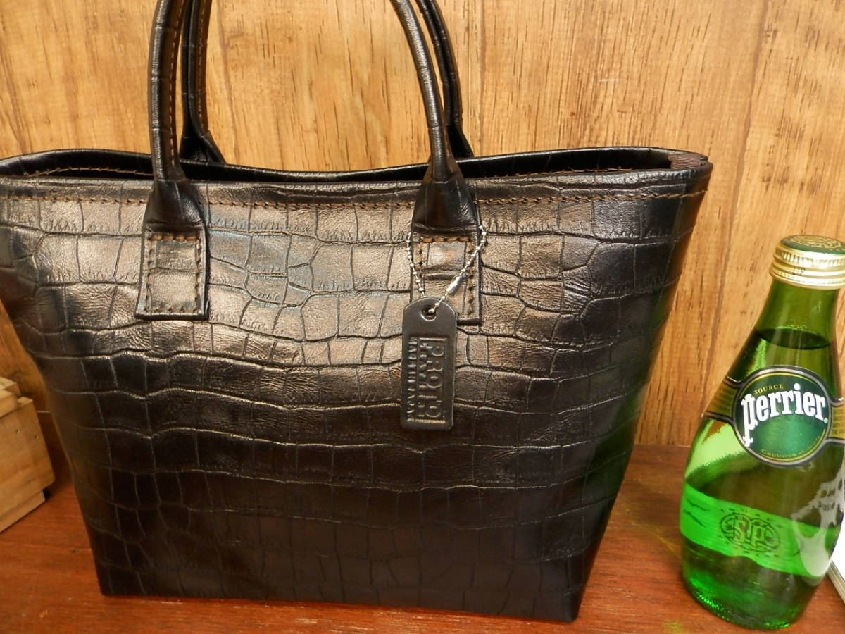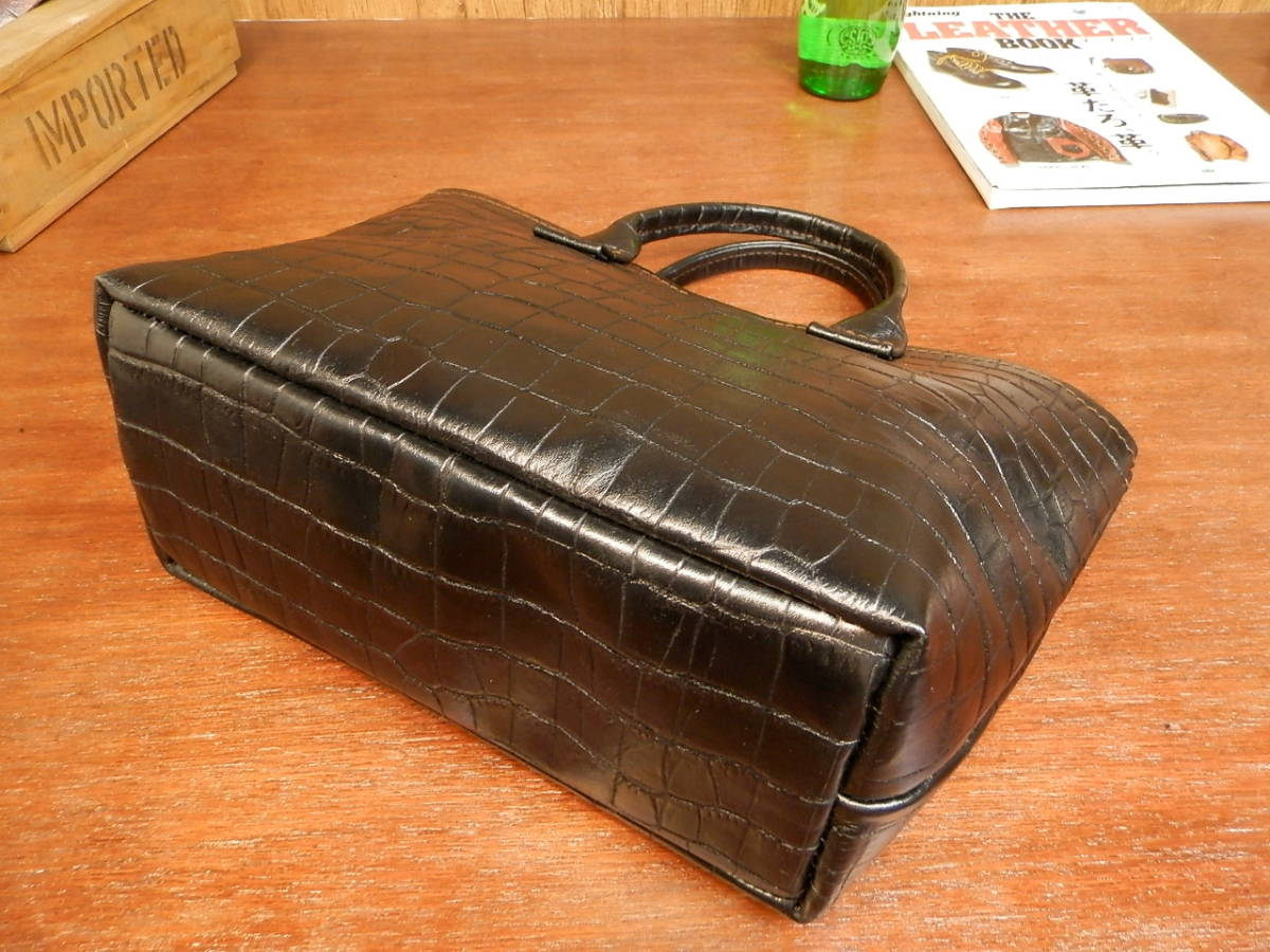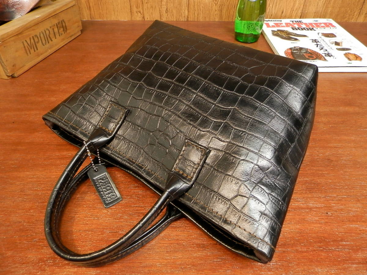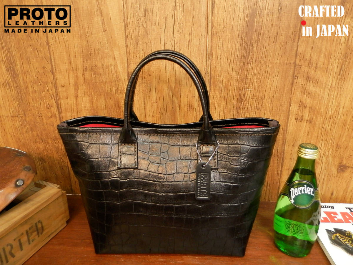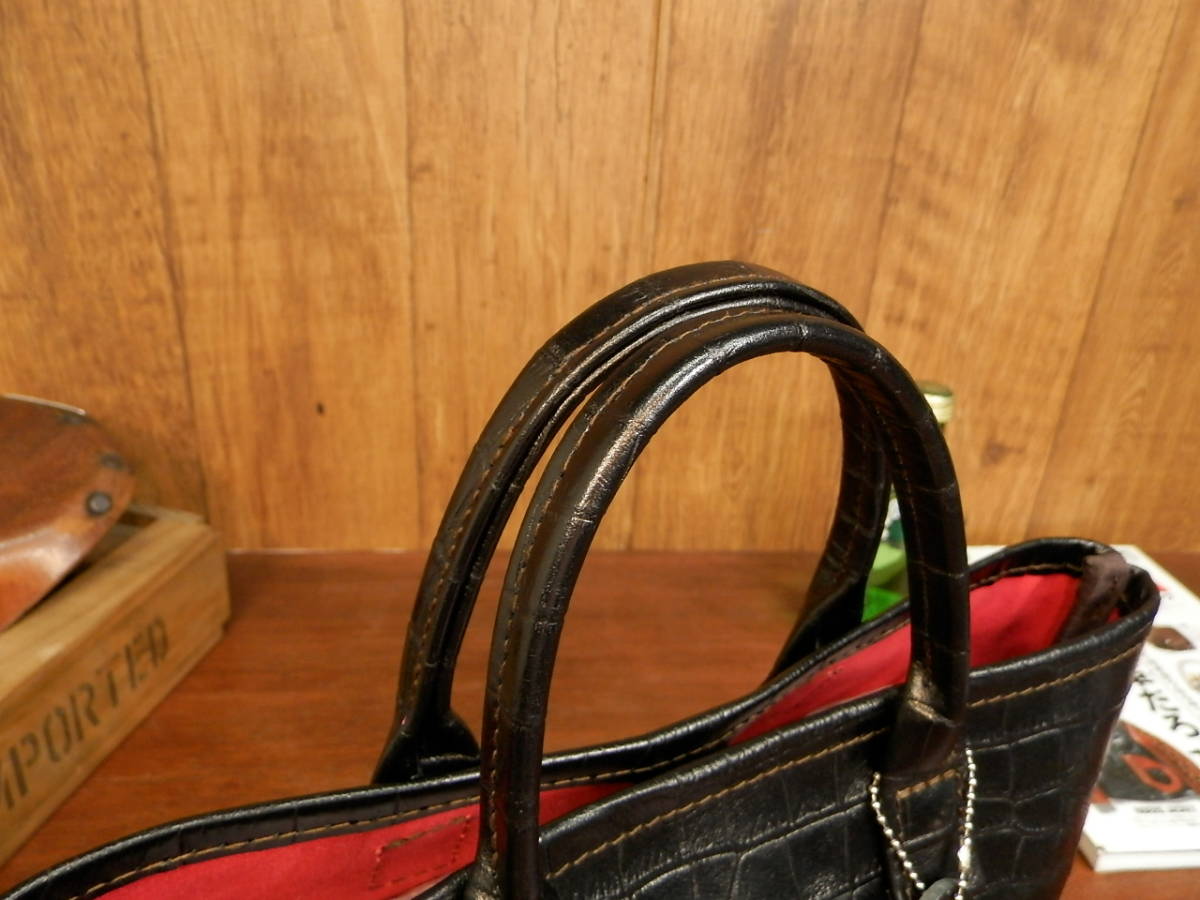 Sサイズ☆真っ赤な裏地カスタム☆迫力のクロコ型押レザー小型トートバッグ!日本製ブラック黒ミニトート龍野レザー裏地レッド黒