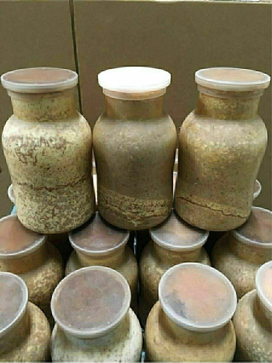 ボトルやキャップはキノコ栽培に繰り返し使用したものですので、色が茶色く変色していますが、高圧釜で完全殺菌後の植菌ですから菌糸の品質には全く影響ありません。