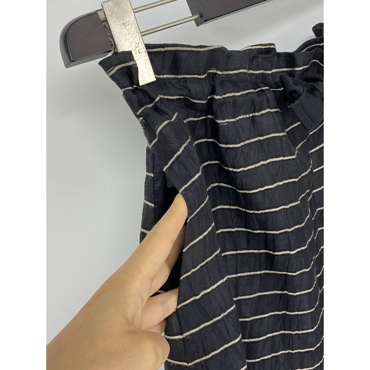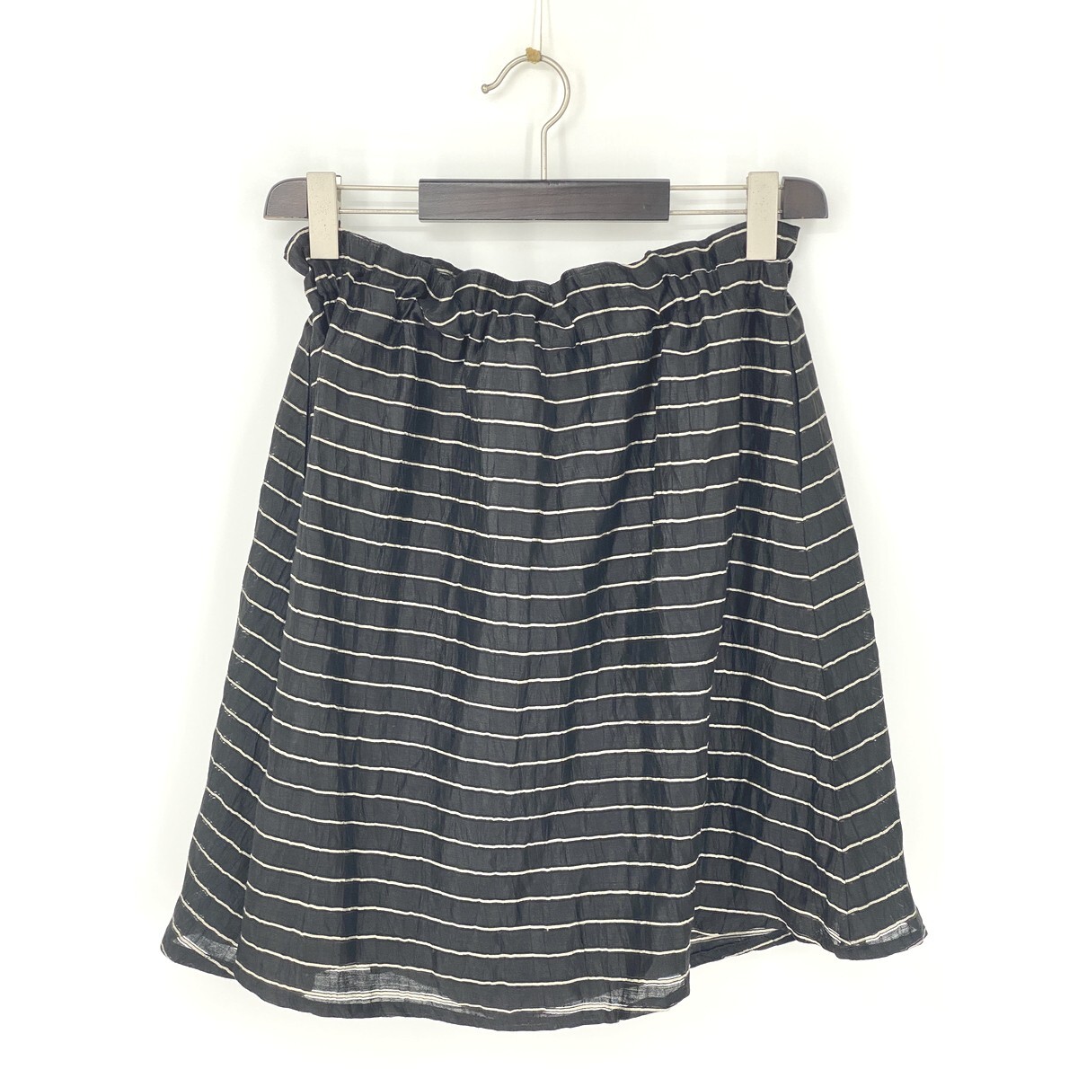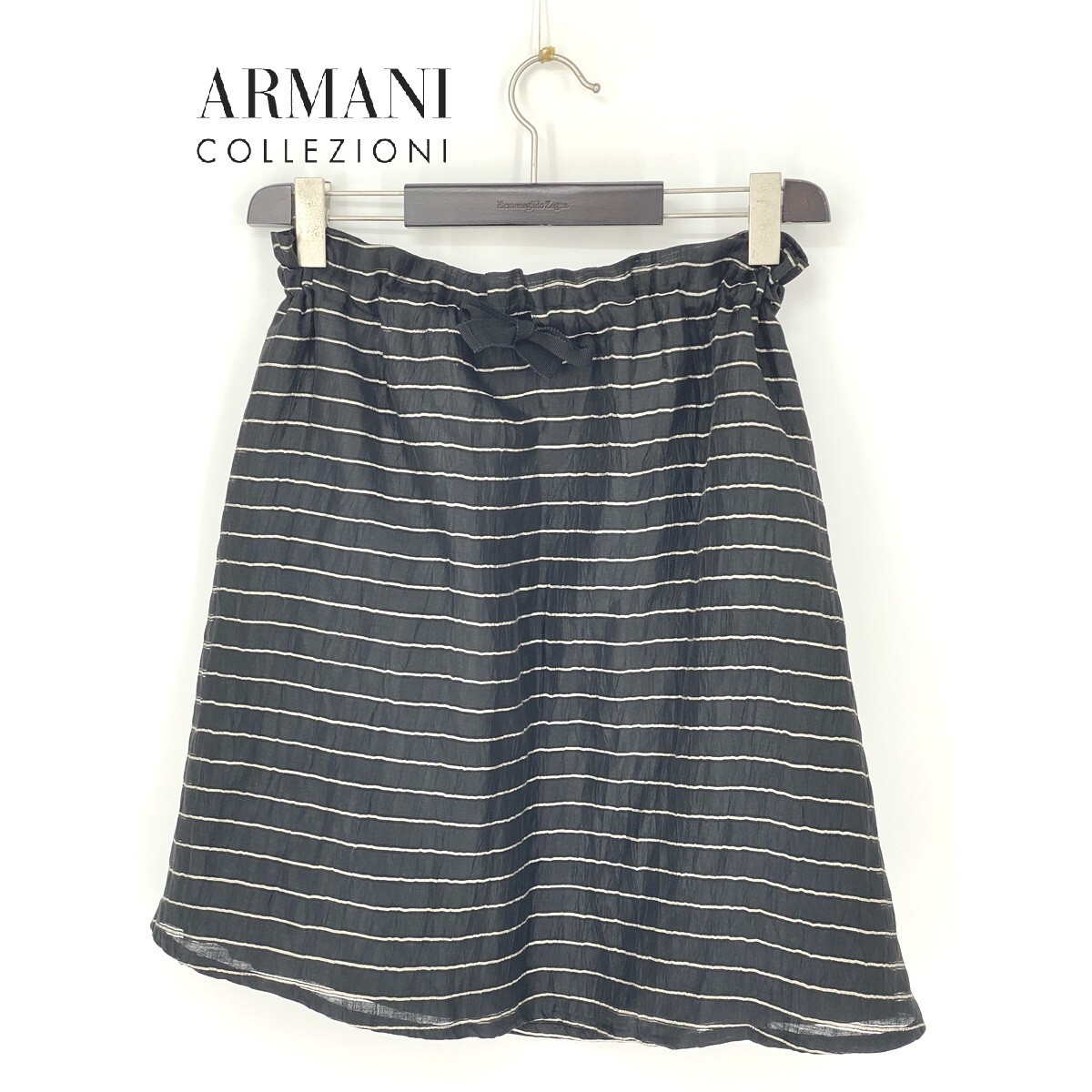 B0326/極美品 ARMANI COLLEZIONI アルマーニ リネン ボーダー 腰紐付き イージー ドロスト ギャザー 膝丈 スカート 42 L 黒 レディース