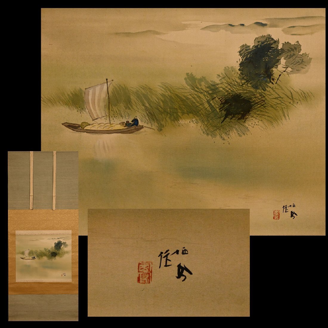 【永】a052【兵庫県の図書館や博物館の館長を歴任された歴史研究家遺族委託品】掛軸 竹内栖鳳 彩色風景舟人物幅 優品