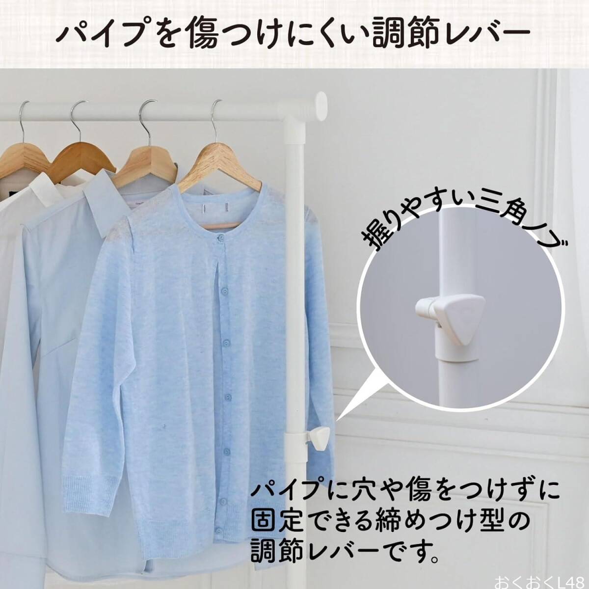 【パイプを傷つけにくい調節レバー】締め付け型調節レバーで、パイプに穴や傷ができにくくなっています。三角形のノブで握りやすくしっかり固定できます。