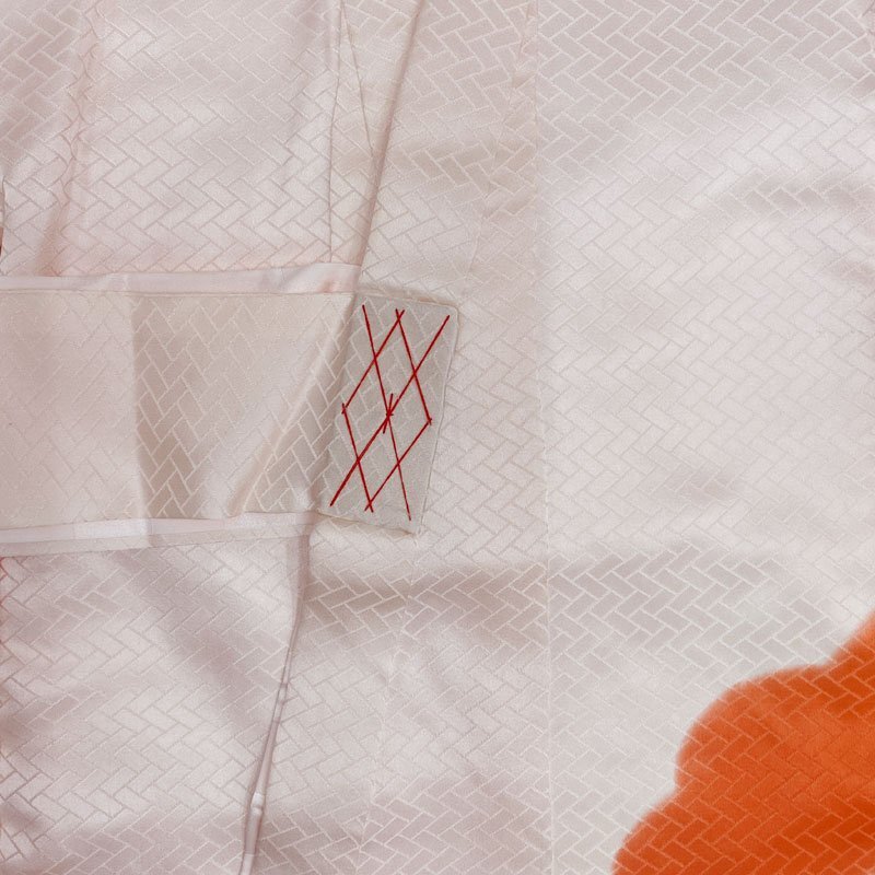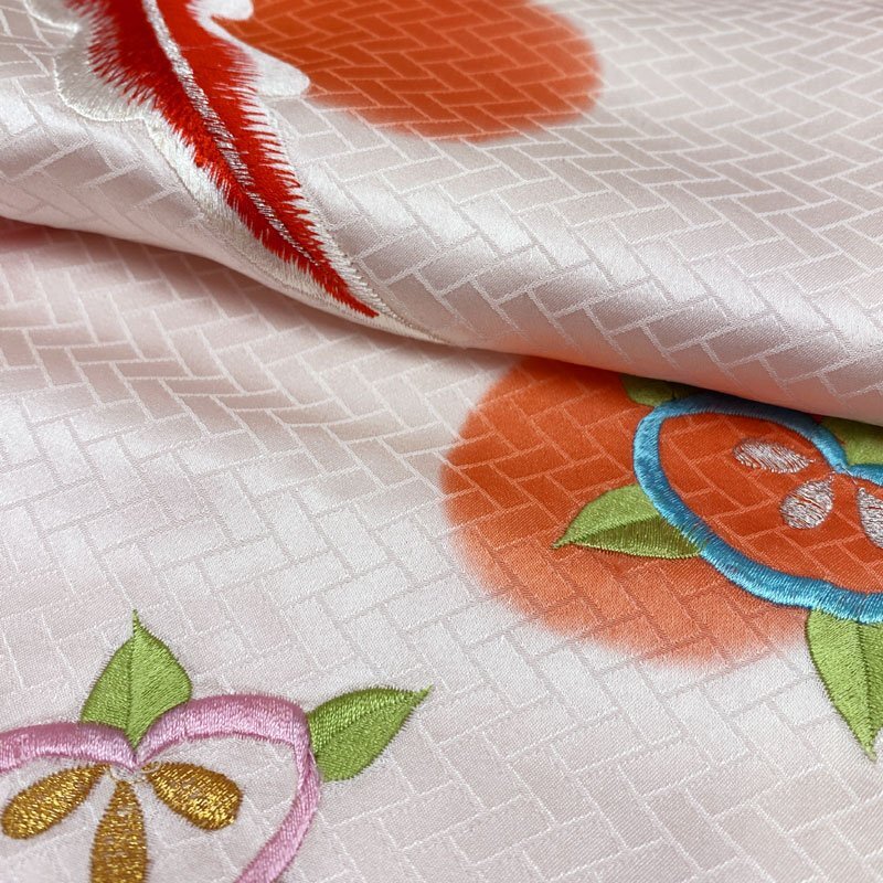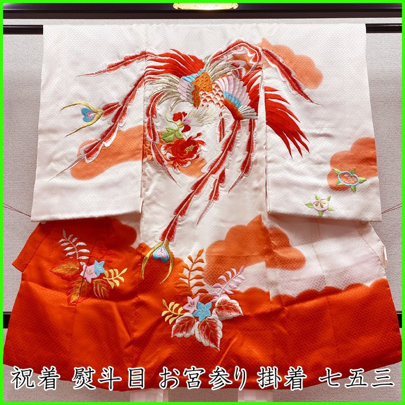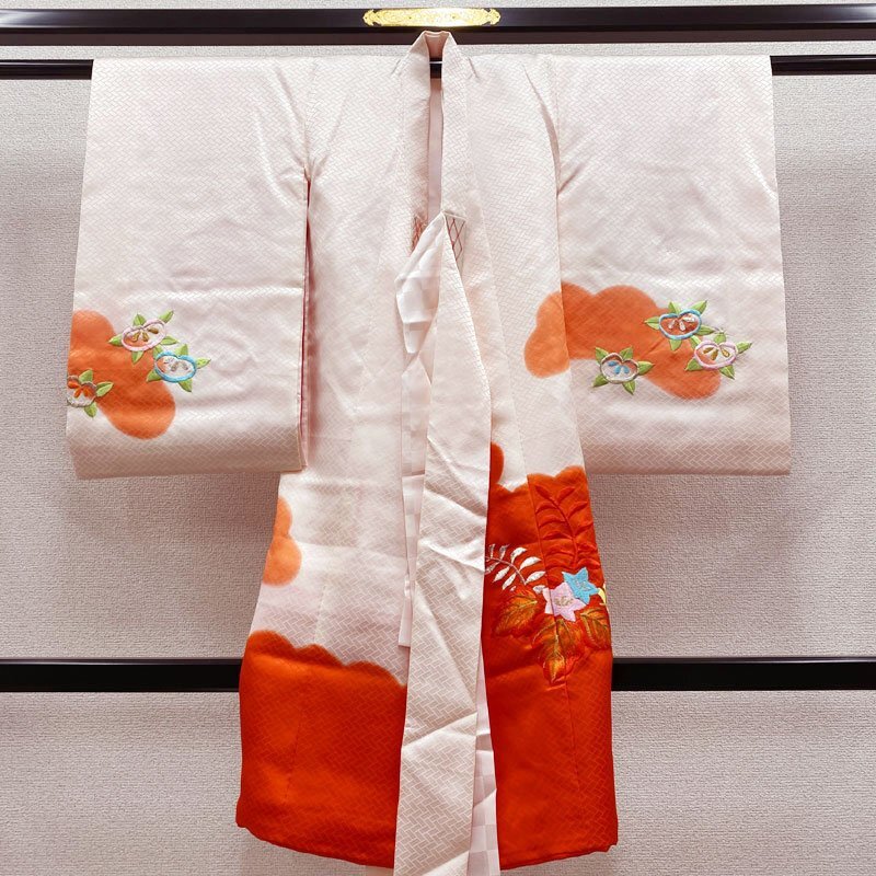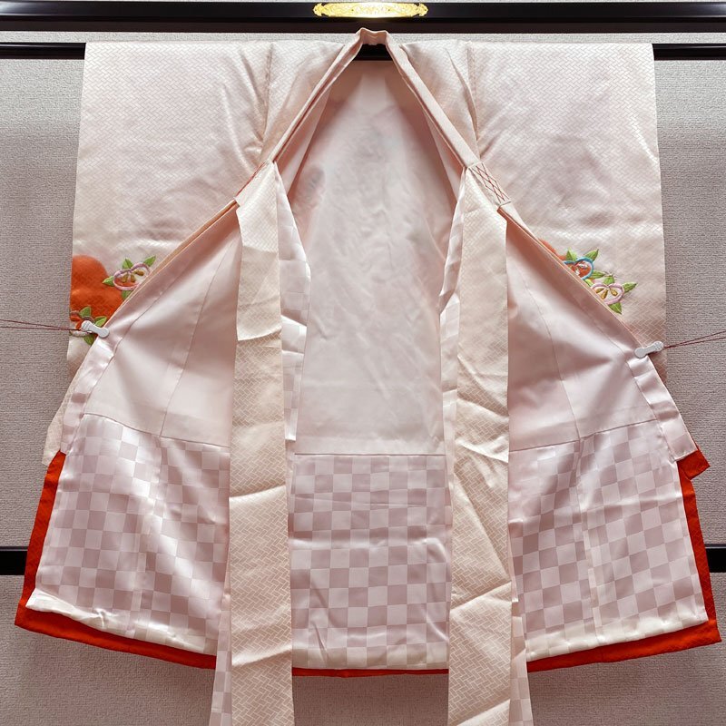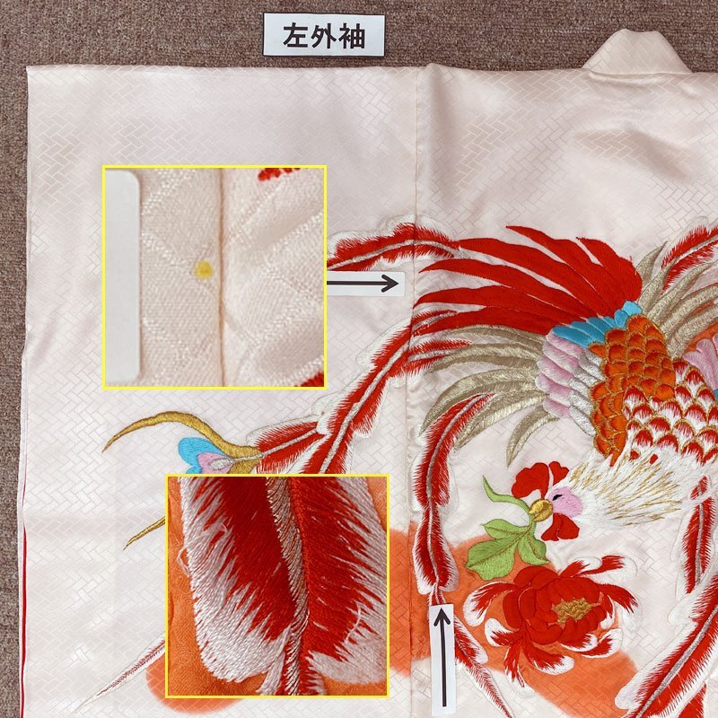 | ◎お宮参り 女児 祝い着 着物 産着 七五三にも 長襦袢付◎美品 こちらは掛着と長襦袢のセットです。*長襦袢はおまけでお付けしております。地紋が浮かび上がる白に近い桜色と濃いオレンジ色の地に、刺繍で施された鳳凰、橘、桐文様が豪華で素敵なお宮参り用の女の子のお祝い着です。長襦袢付きです。 画像のような薄いシミや刺繍に糸の飛び出しが他にもいくつかございますが、目立ちません。長襦袢はおまけでお付けしておりますが、ダメージがある場合もございますので、ご了承ください。 【表地素材】(着物)正絹 (長襦袢)ポリエステル 【色】白に近い桜色、濃いオレンジ *モニターによって色味は実際と異なる場合がございます。 【サイズ】(着物) 裄:45cm、袖丈:57.1cm、身丈(肩から):96cm *素人採寸のため、多少の誤差はご容赦ください。 お宮参りの掛け着としてはもちろん、七五三の3歳のお祝い着としては、お直しや被布と草履などのお小物類をご準備ください(肩上げ、腰上げは手縫いで簡単にできます) 。 | |