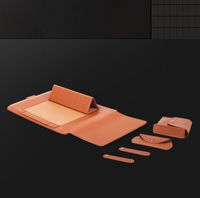 4つの機能が1セットになった画期的なPCケースです。 パソコンケース、マウス収納バッグ、電源収納バッグ、コードバンド2本、オフィスでも出張時でもテレワークでも活躍すること間違いなしです。 PCケースを裏返すと、3つ折り開きのスタンドが出現。