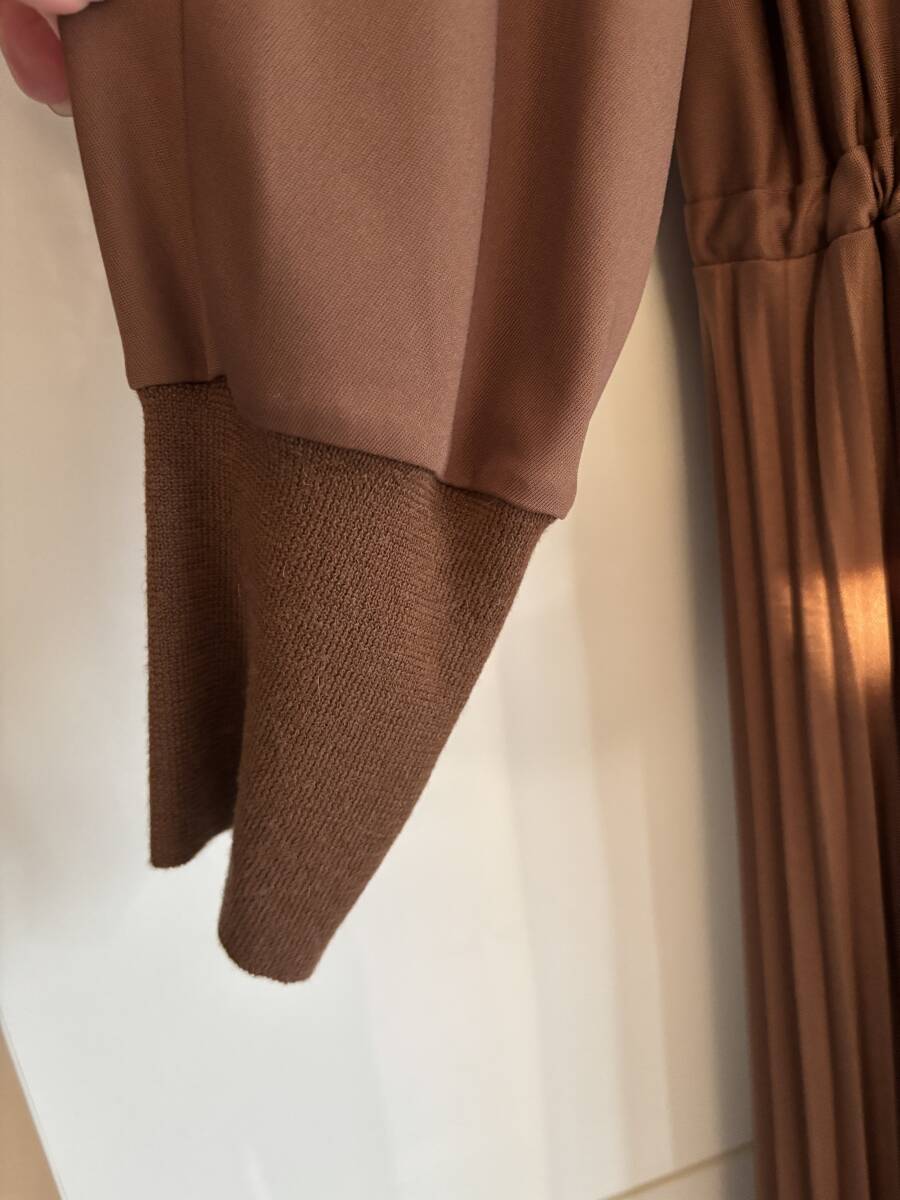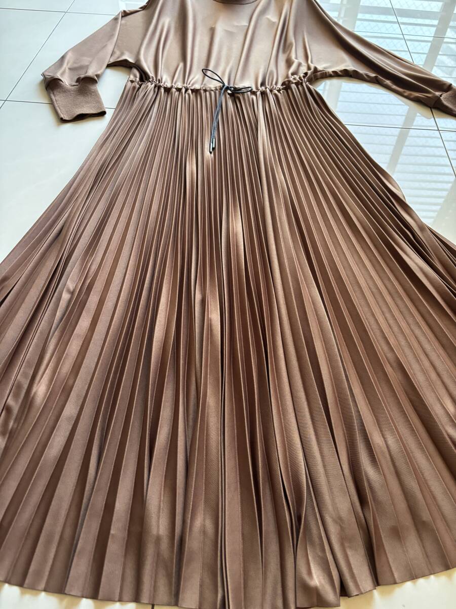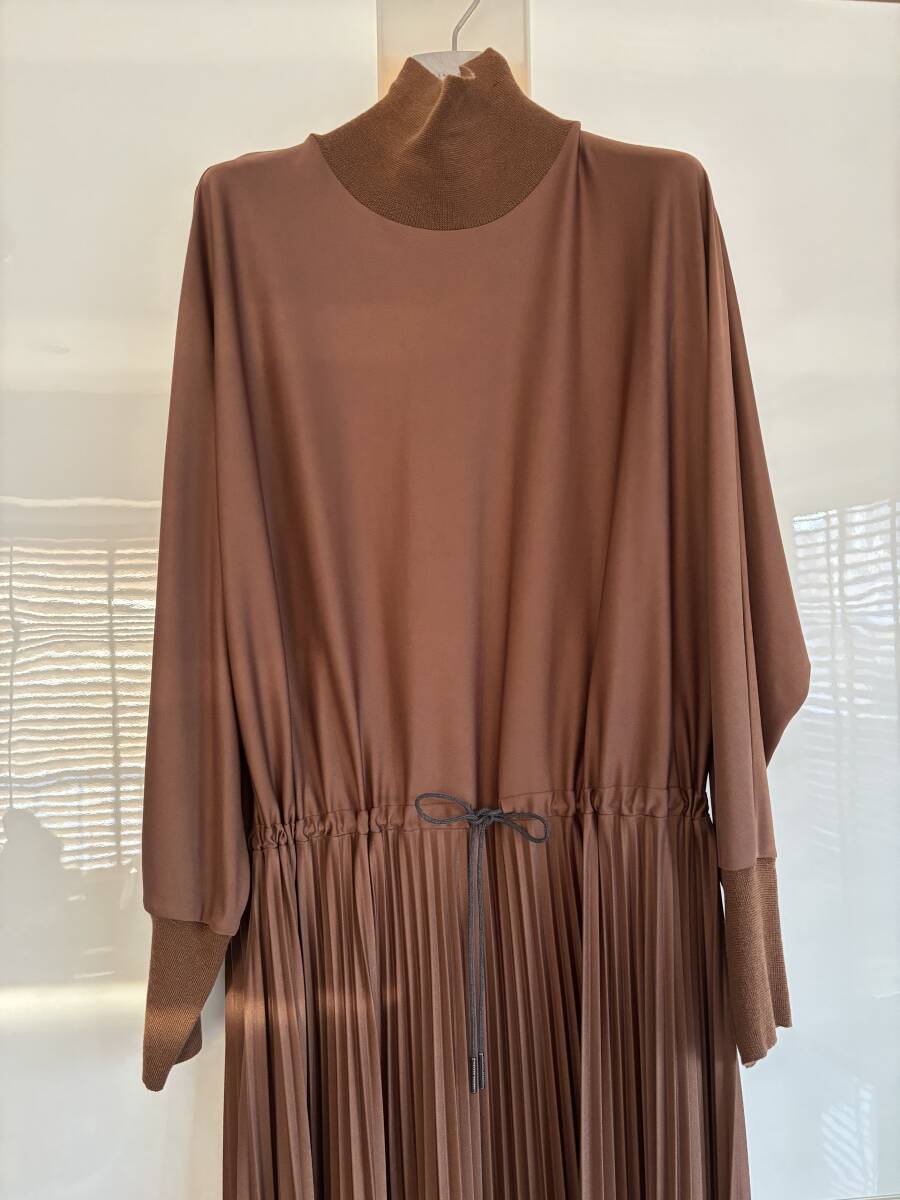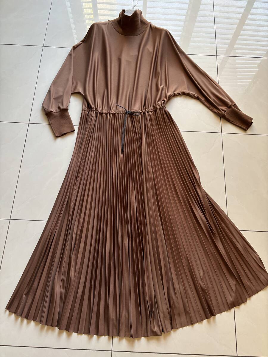 流行のブラウンカラー、ドルマンシルエット、スカート部分は優雅なプリーツです。