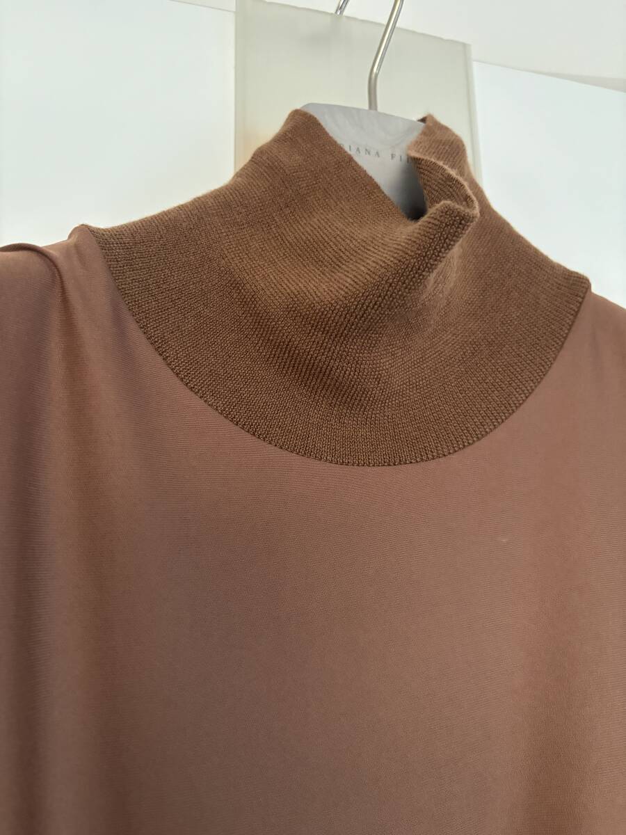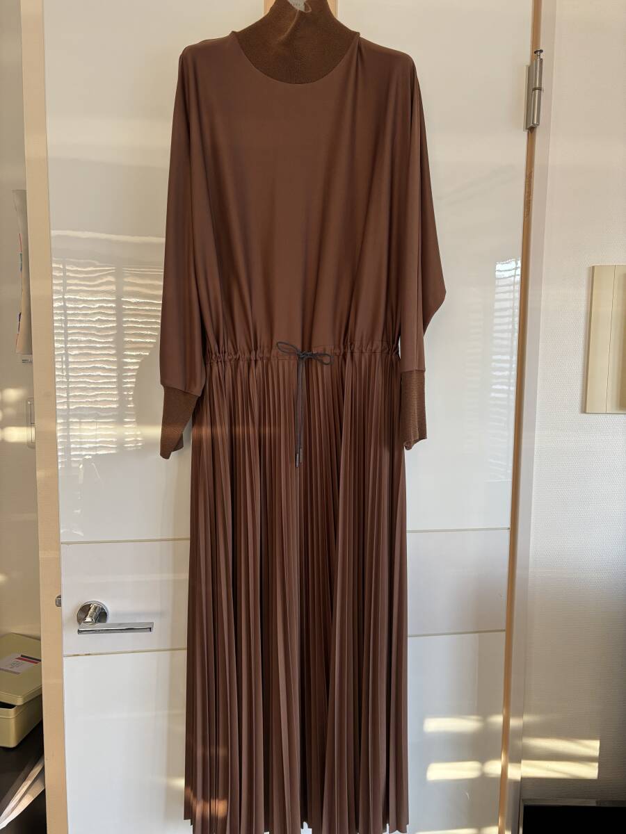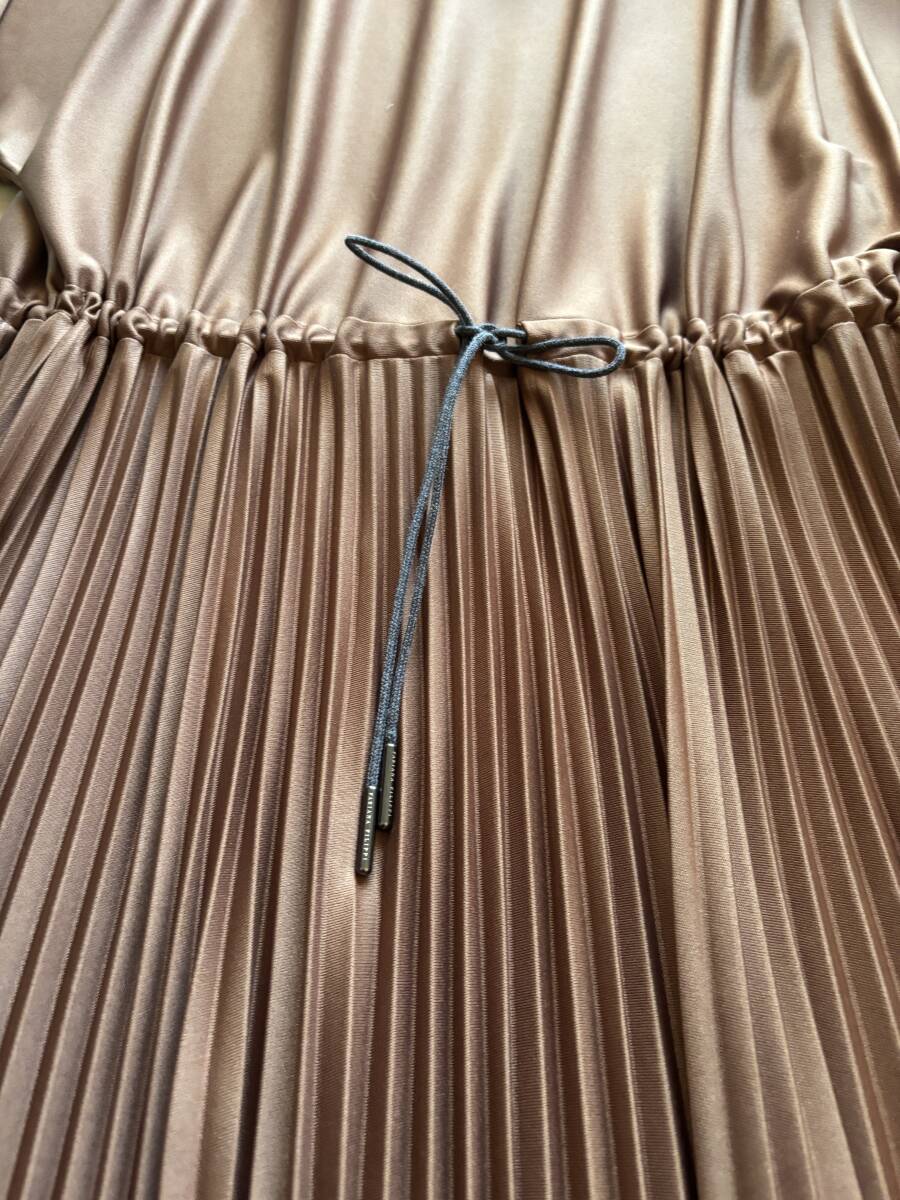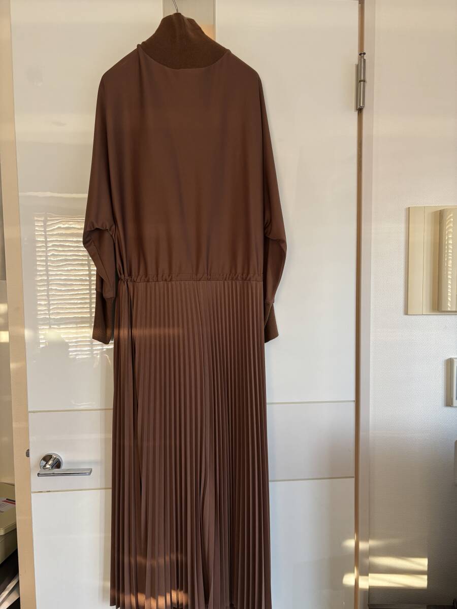 流行のブラウンカラー、ドルマンシルエット、スカート部分は優雅なプリーツです。
