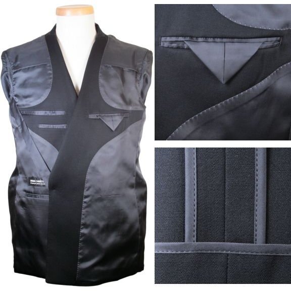 ■仕様:ラペル毛芯仕様、ノーベント、背裏背抜きパイピング仕上げ、胸箱ポケット、左右腰ポケット(フラップ付両玉縁)、袖口開き見せ額縁仕上げ、ピンポイントステッチ、台場、左右内ポケット、携帯ポケット、タバコポケット、ワンタックアジャスター付