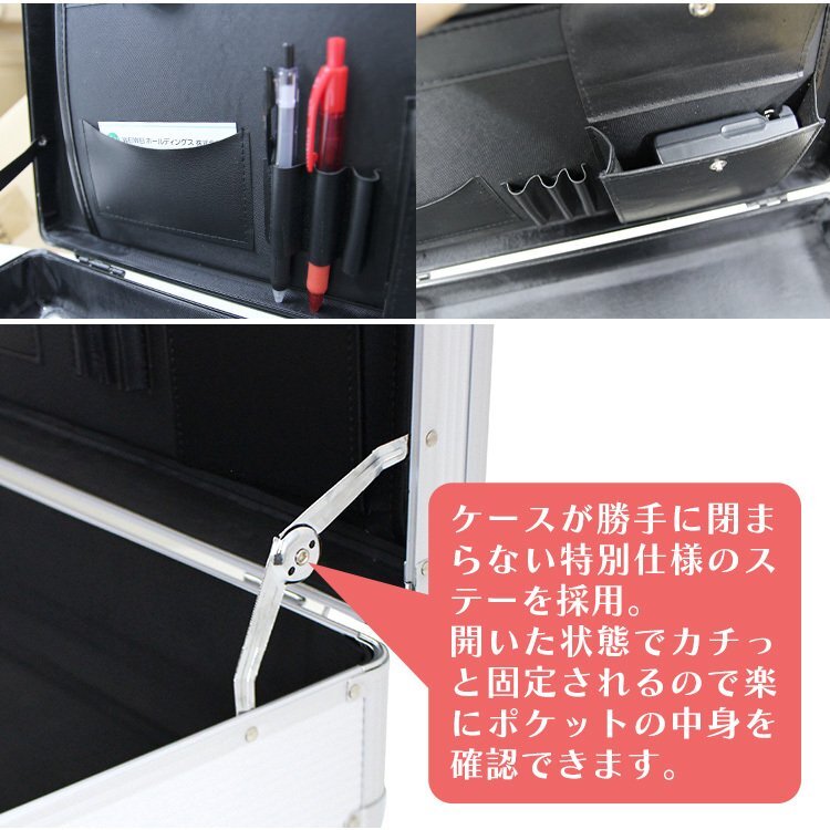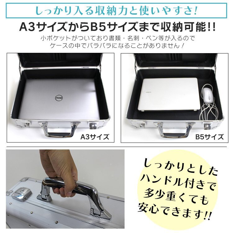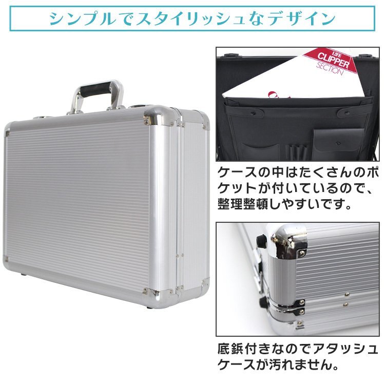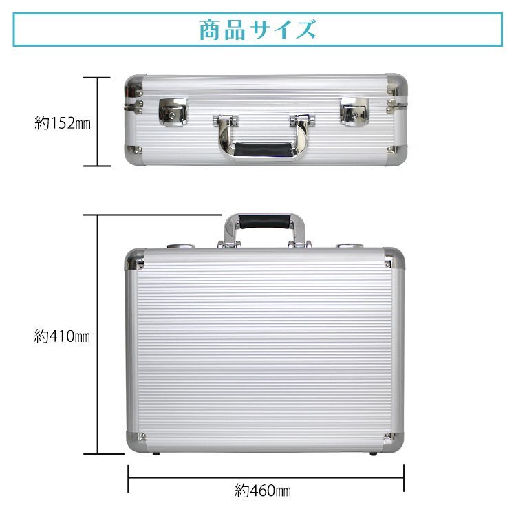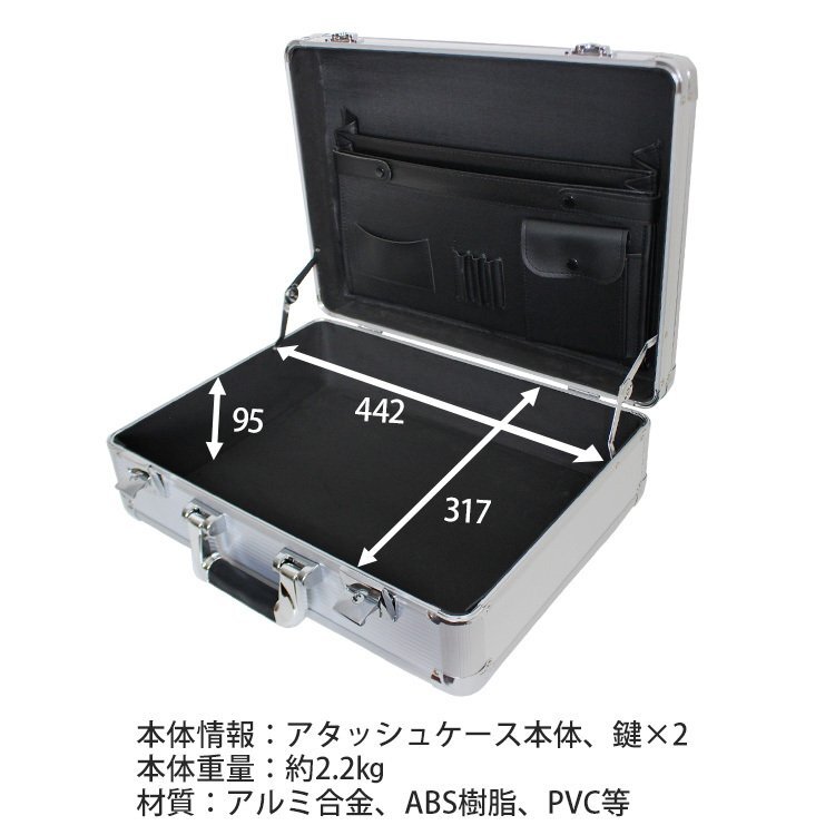 軽量で頑丈、抜群の収納を誇るアルミアタッシュケース。 シンプルなデザインと軽量で丈夫なボディでシーンを選ばず大活躍! ポケットも充実たっぷり収納♪ 盗難防止用の鍵も付いていて、出張など長時間の移動にもしっかり対応します。 ノートPC・書類・メディア・貴重品の収納等、多彩な用途にご利用頂けます♪ ケースが勝手に閉まらない、特別仕様のステーを採用。 開いた状態で固定されるので楽にポケットの中身を確認できます! ●仕様 サイズ(約):460X410X152mm 重量(約)2.2Kg 材質:アルミニウム合金、PVC、ABS樹脂他 ●注意事項 ※本体にアルミ素材・MDF素材を使用している為、内張りを接着で固定しています。輸送中の振動などにより多少接着面が浮いてしまう事がございます。軽く手で押さえられると接着力を回復できますので、予めご了承願います。 ※アルミニウム合金はフレームのみでパネル面は使用しておりません。 ▼アタッシュケース カラー一覧▼ ■ ブラック ■ シルバー |