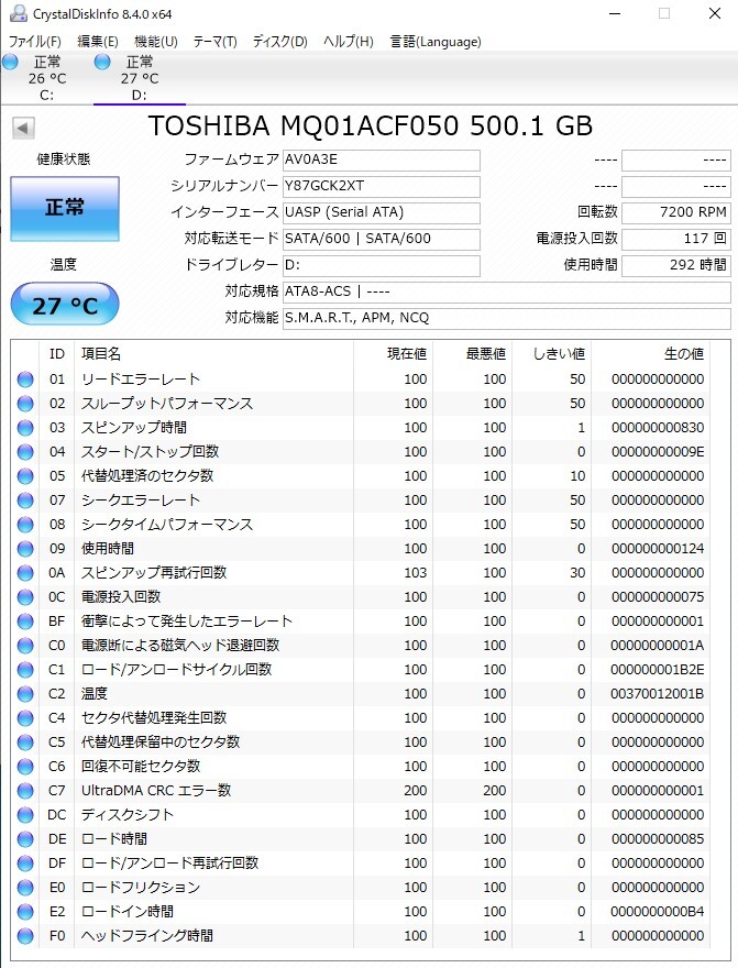 詳細はCrystalDiskInfoの数値画像でご確認ください。