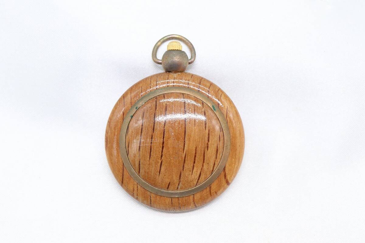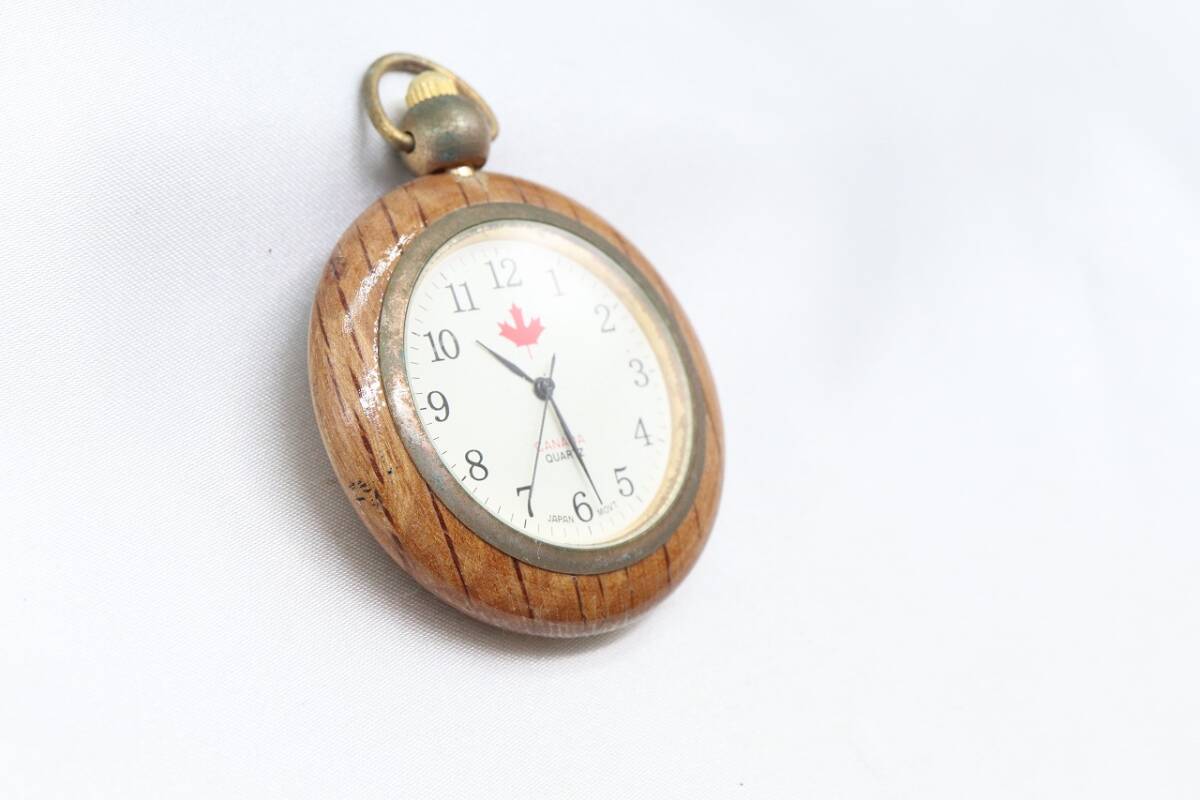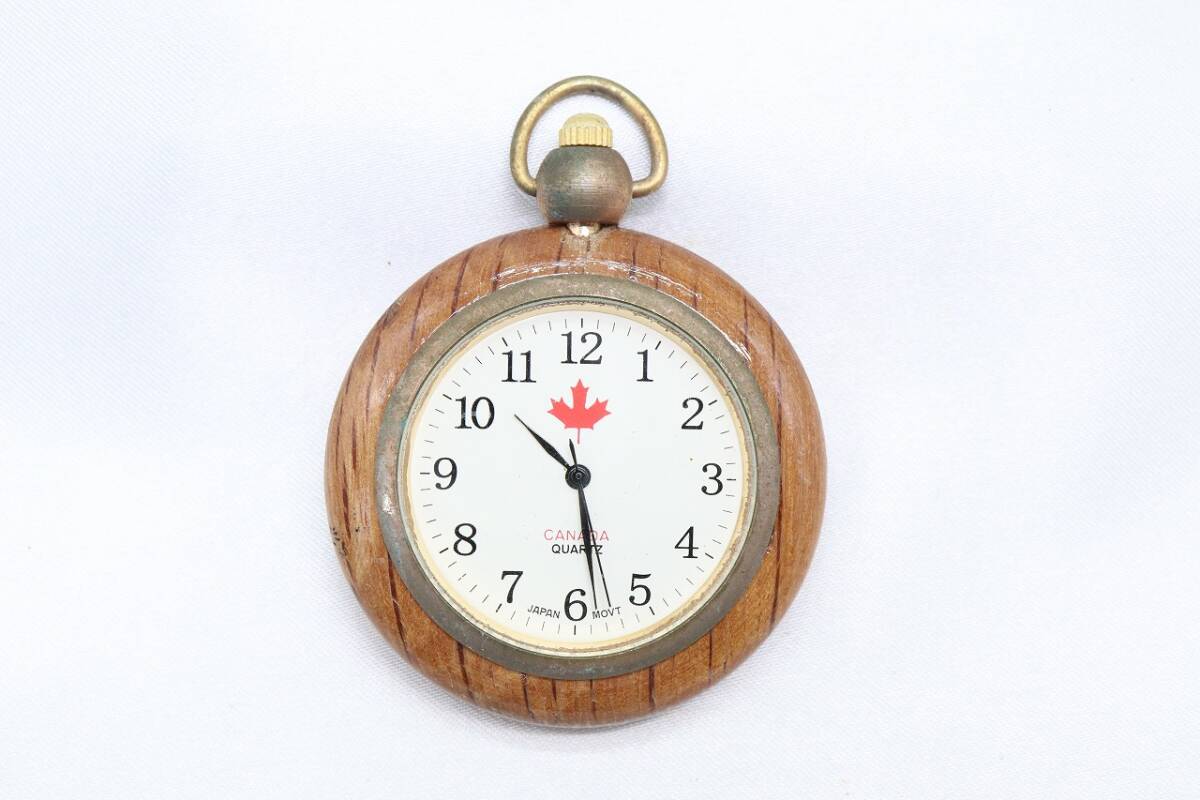 【W283-15】動作品 電池交換済 CANADA カナダ 木材 ウッド 懐中時計 メンズ【送料全国一律185円】
