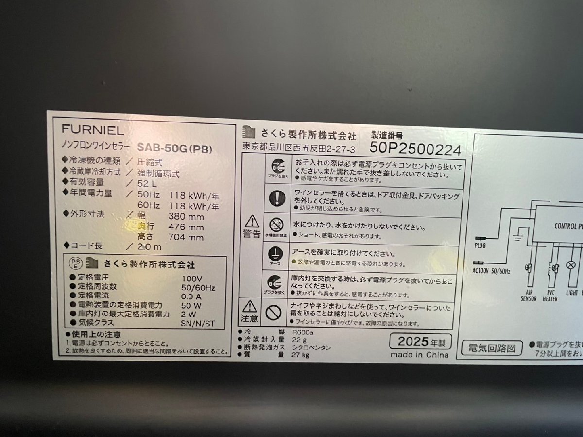 さくら製作所 SAKURA WORKS ワインセラー FURNIEL(ファニエル) SMART CLASS ピュアブラック SAB-50G [12本/右開き] 2025年製造 未使用品の出品となります。状態は開封済みの商品となりますが未使用品となります。いい商談がございましたので超特価の31800円スタートでお願いいたします。落札価格に別途消費税がかかります。発送できる付属品類は写真に写っているものですべてとなります。未使用品につき現状渡し、ノークレーム・ノーリターンでお願いいたします。よろしくお願いいたします。