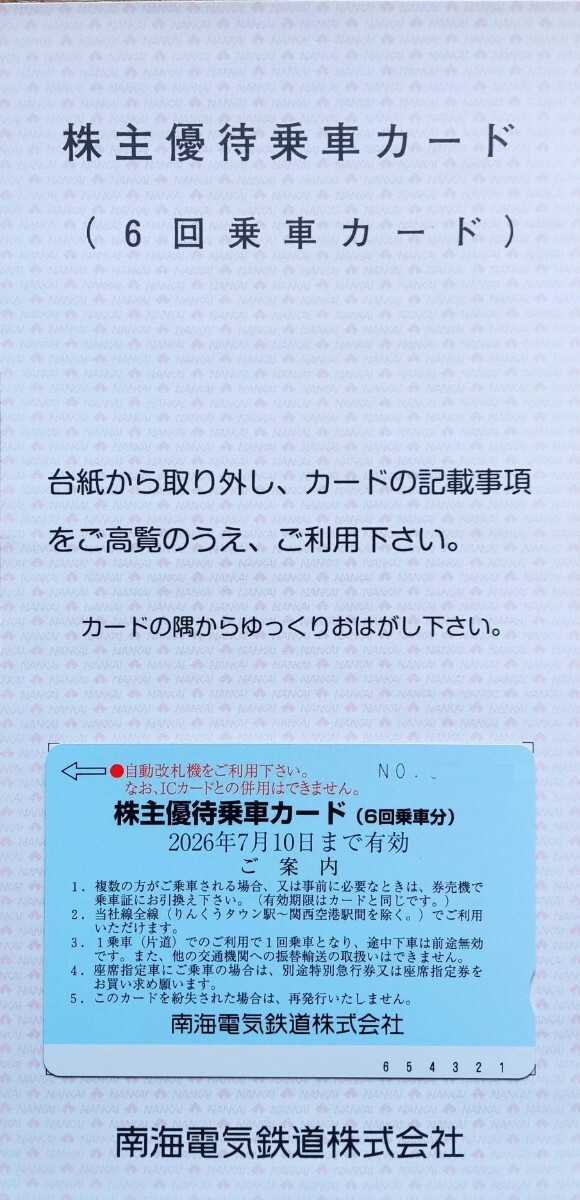南海電鉄 株主優待乗車カード 6回分 送料無料 南海電気鉄道 有効期限:2026年7月10日