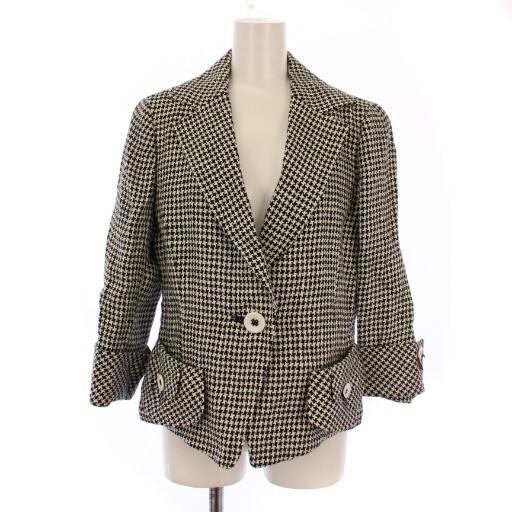 ヒロココシノ HIROKO KOSHINO テーラードジャケット 七分袖 背抜き シングル 1B 千鳥格子 リネン 11 ブラック ホワイト レディース