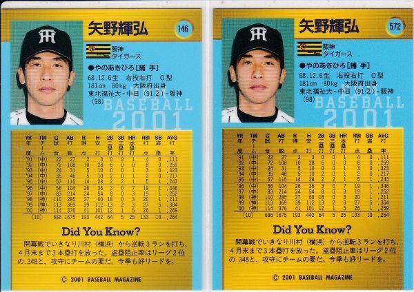 ●2001BBM 【矢野 輝弘】 前後期:通常版2種セット No.146&572:阪神 R2