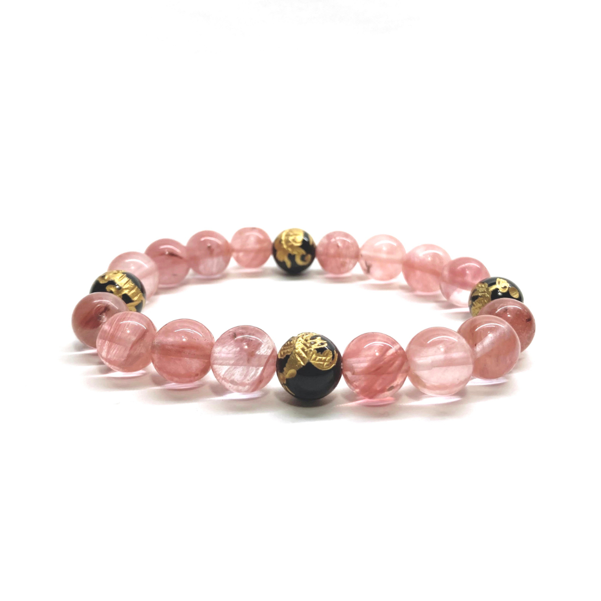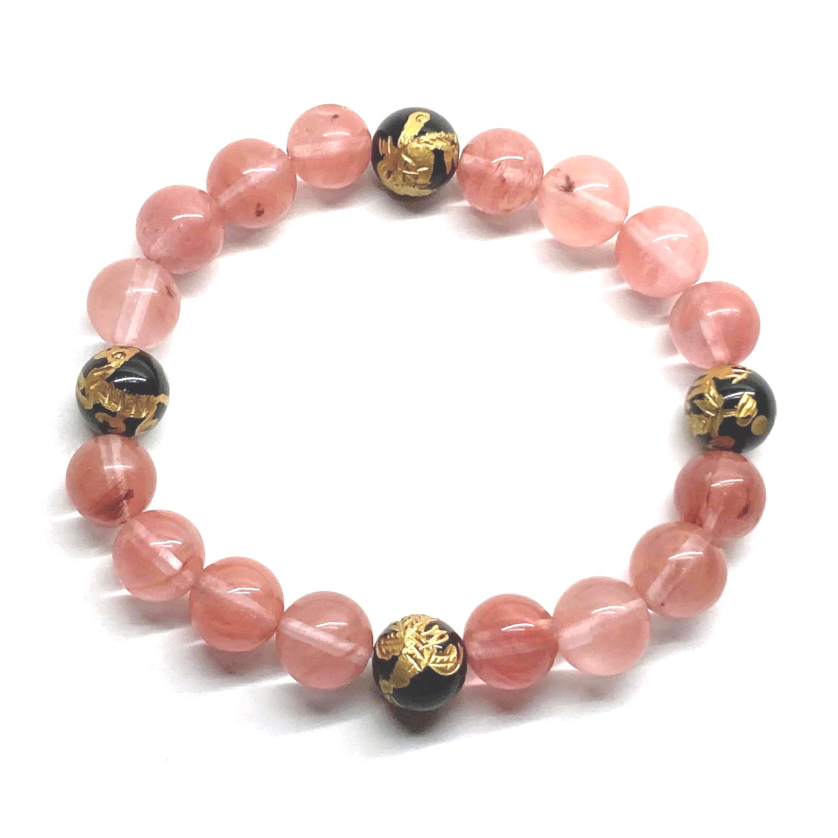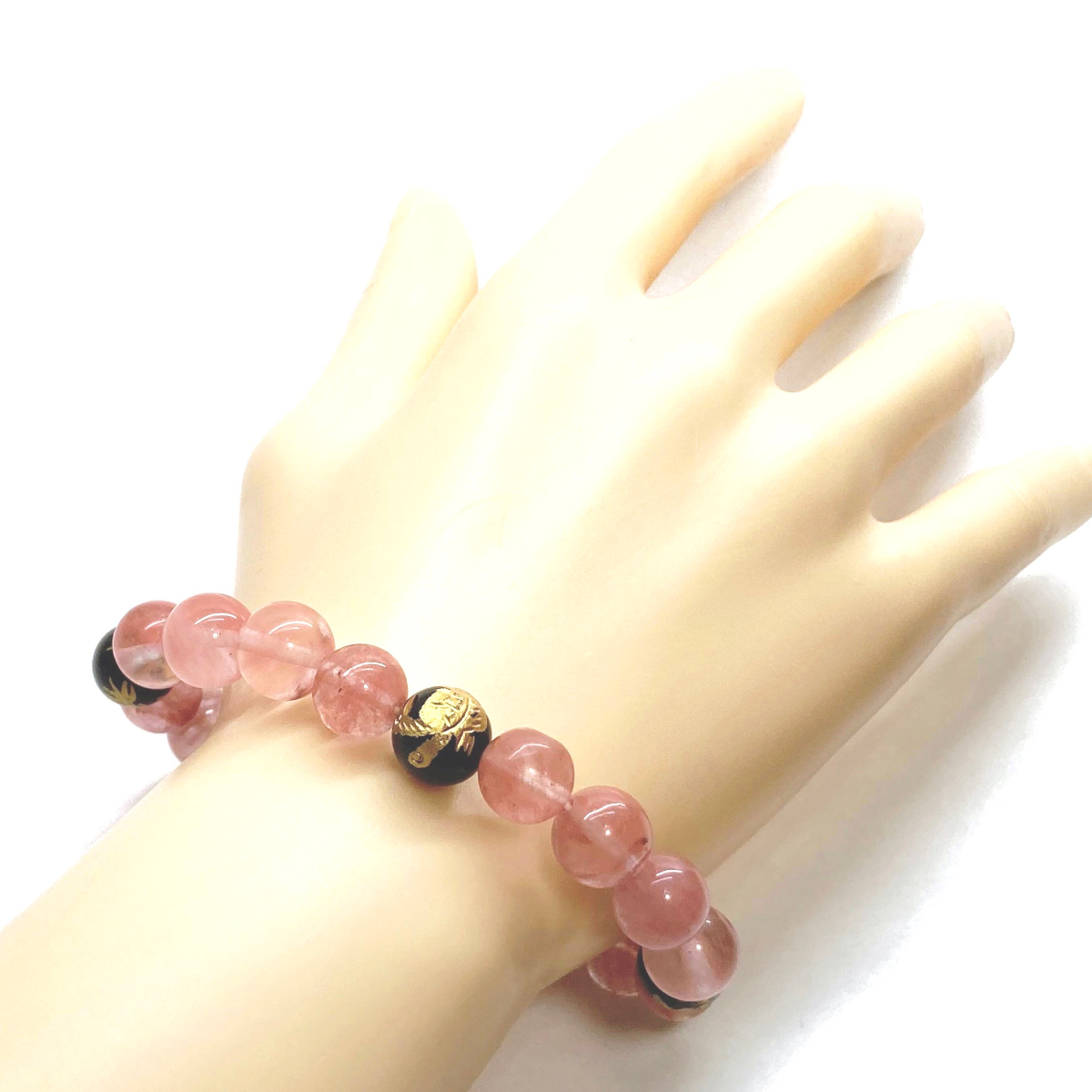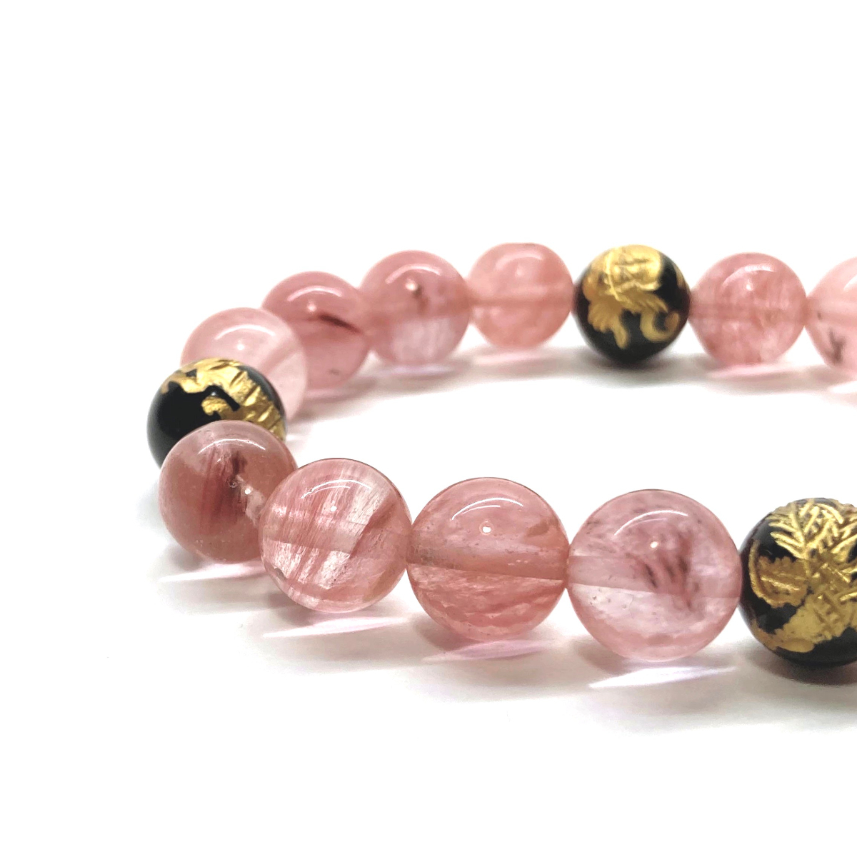 10mm 四神獣金彫オニキス×チェリークォーツ パワーストーン ブレスレット 運気上昇 開運 金運 恋愛運 青龍 白虎 玄武 朱雀 ☆