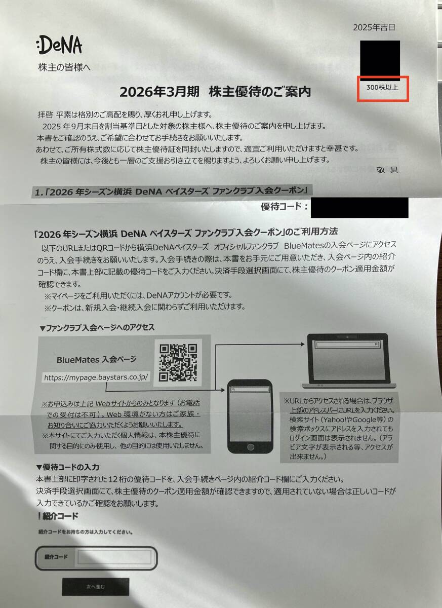 ☆DeNA株主優待☆横浜DeNAベイスターズファンクラブ入会クーポン3000円オフ☆2026シーズン☆優待コード通知のみ☆男性名義☆匿名対応☆