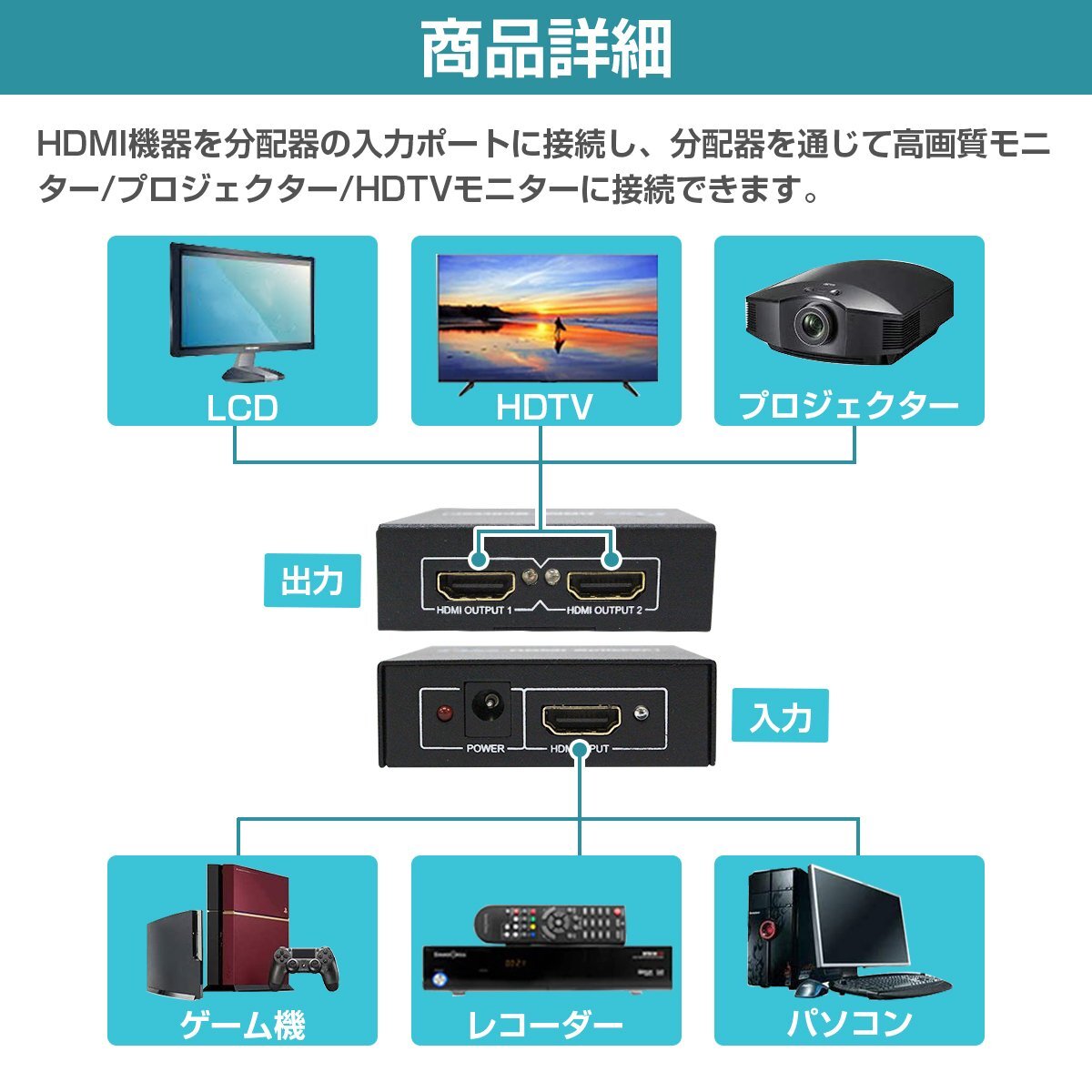 使用方法はHDMI機器を分配器の入力ポートに接続し、