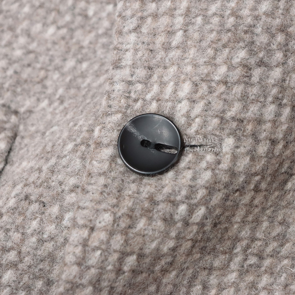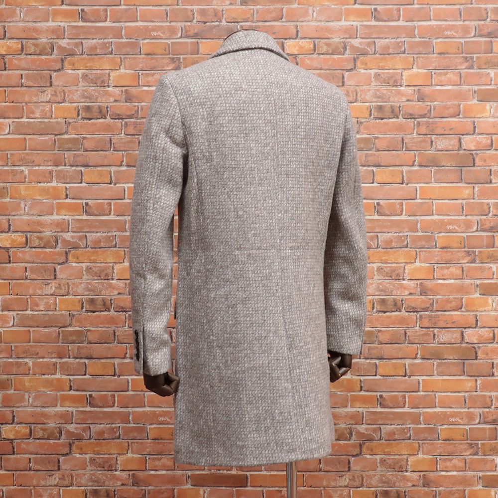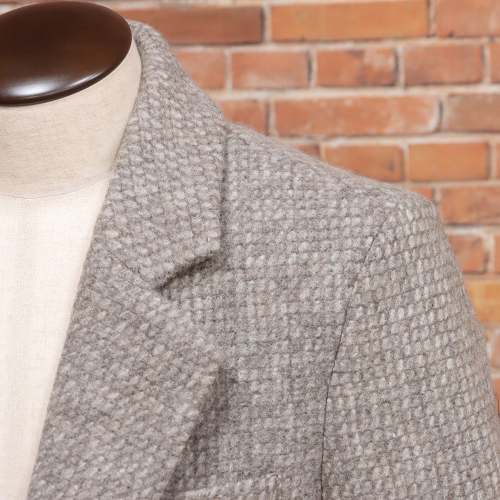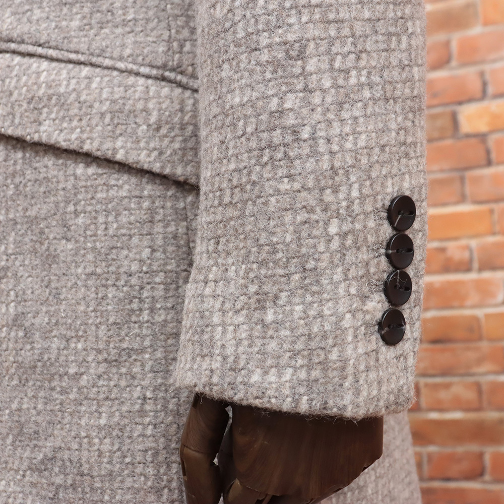 ライトグレーの柔らかな色合いに、クラシックなラペルやストレートなシルエットが映える、端正な佇まい。ふんわりと毛羽立った表面は、見る者にもあたたかみを伝えるようなやさしい風合い。しなやかで適度な厚みがあり、保温性と着心地を兼ね備えています。