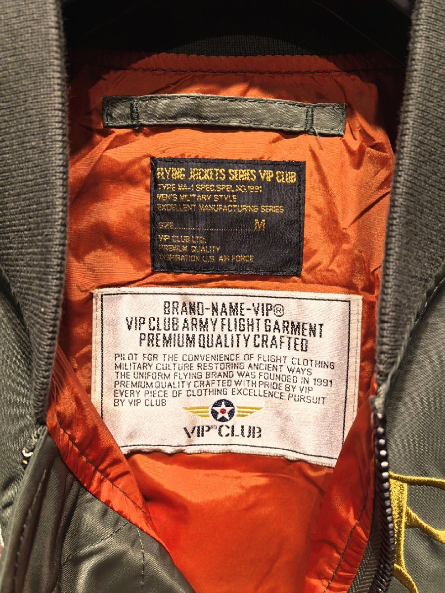 アメリカ発*VIP CLUB・FLYING TIGERS/フライング・タイガース・MA-1/フライトジャケット!MA-1の原型を踏襲し撥水防寒を備えた高機能ポリエステル生地を採用。多数の刺繍が特徴的な一着です。インナーなし薄手の仕様で今節に最適の一着です。