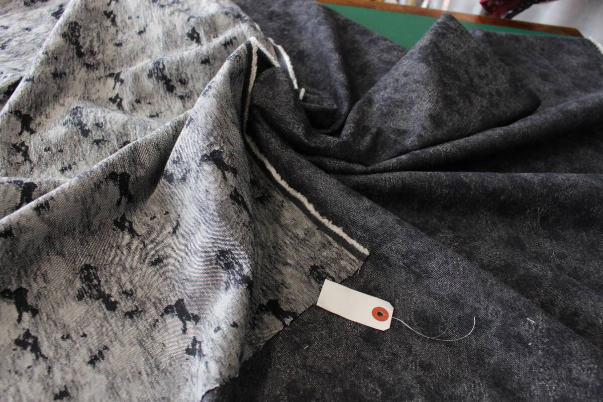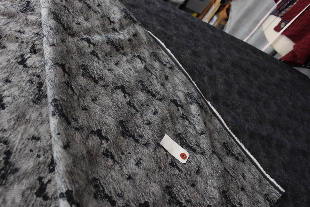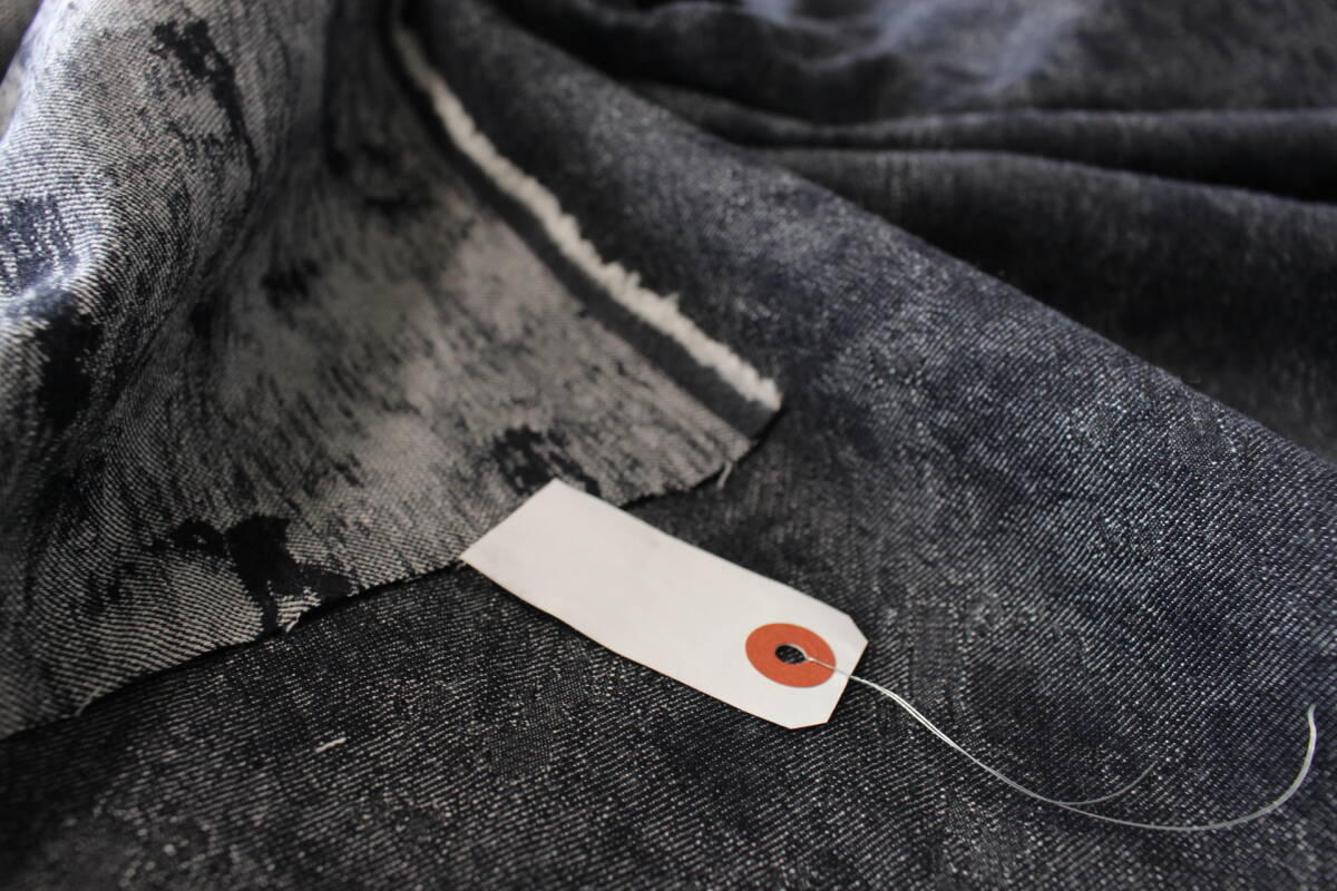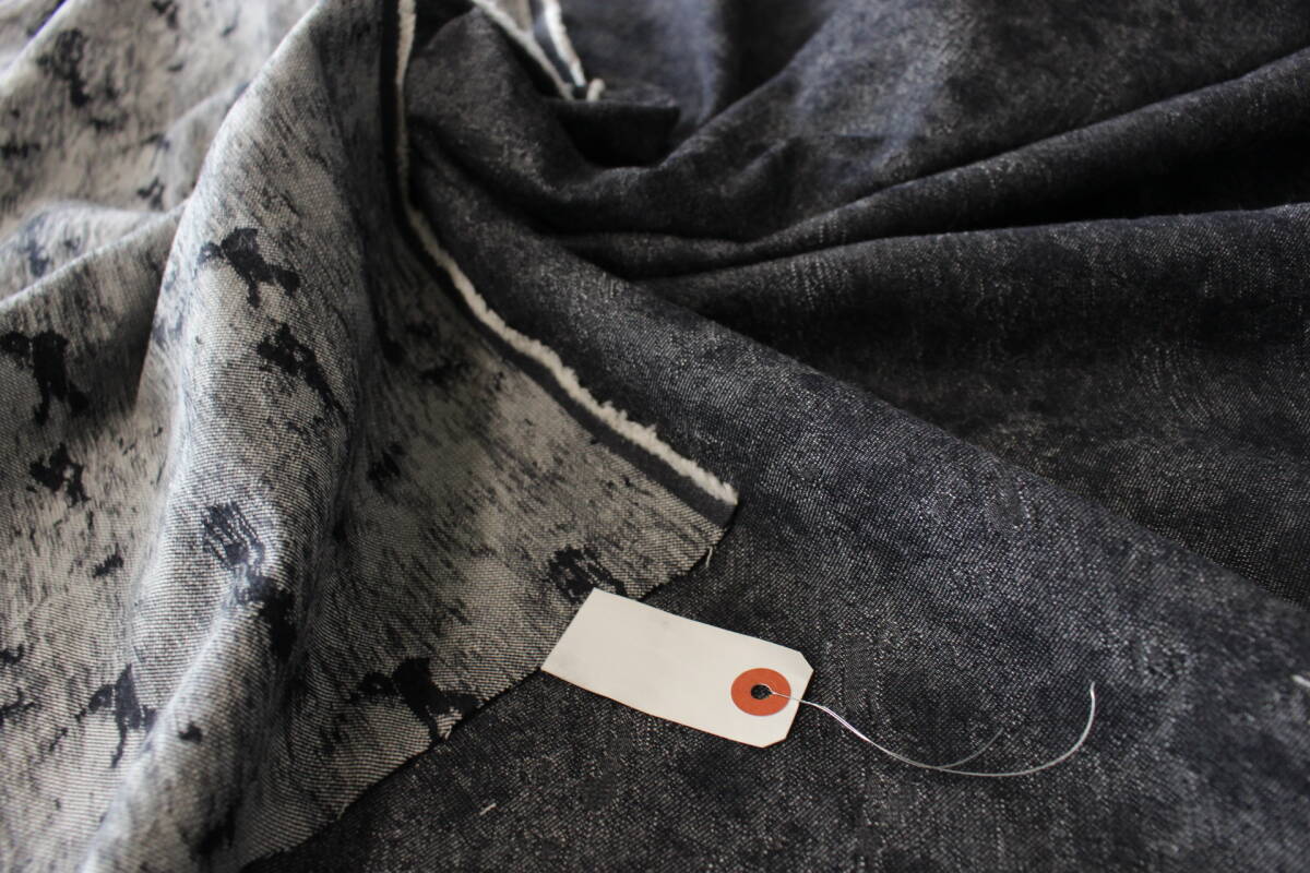 ルイ・ヴィトンに並ぶヨーロピアンハイブランドの大変希少なデニム生地です。諸事情によりブランド名は出せません。とても凝っている生地です。デニムにしては非常に珍しいダブルフェイスの両表生地です。ジャカード織りにより掠れた雲のような抽象的でアーティスティックな柄が生地全体に施されております☆そして触ると立体的なのが素晴らしいです。柄物のデニムはたまに見かけますが、殆どがプリントで織柄はそもそも珍しいのですが、この生地は更に立体的をもたせているので素晴らしいです!!ヴィンテージデニムのような深いインディゴブルーカラーがグレイッシュに織り混ざり重ねて素晴らしい表情を見せてくれています◎伸縮性が少しあります。この生地は初めからやわらかです。薄めの中厚です。パンツ、スカート、サロペット、ジレ、ポンチョ、カーディガン、アウター、フーデッドパーカ、ケープ、バッグ等の製作に向いております。