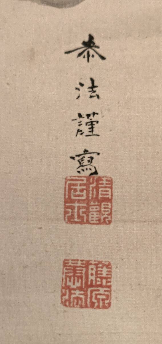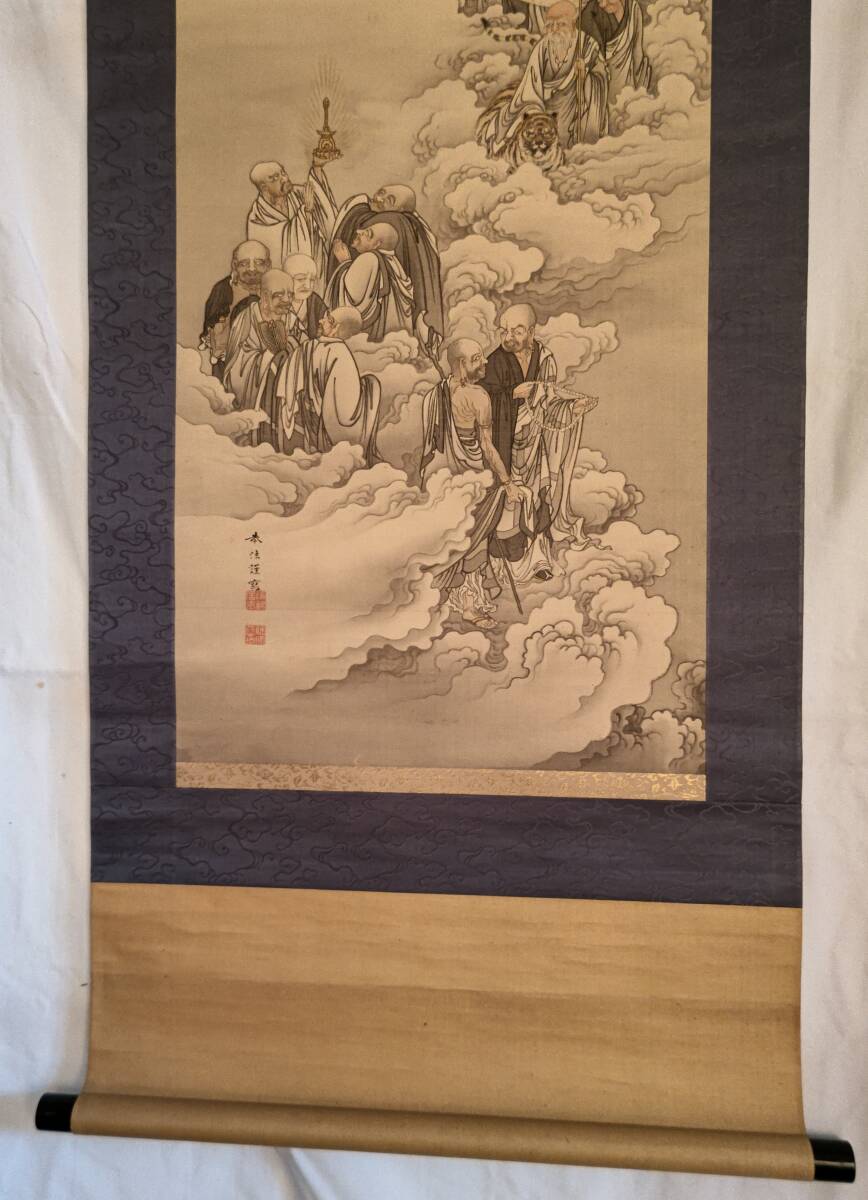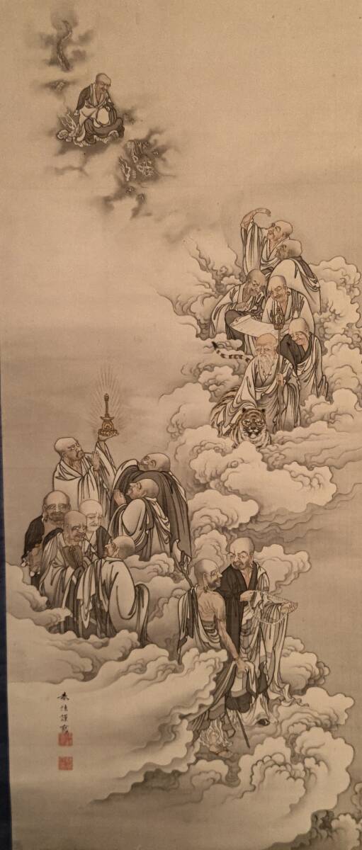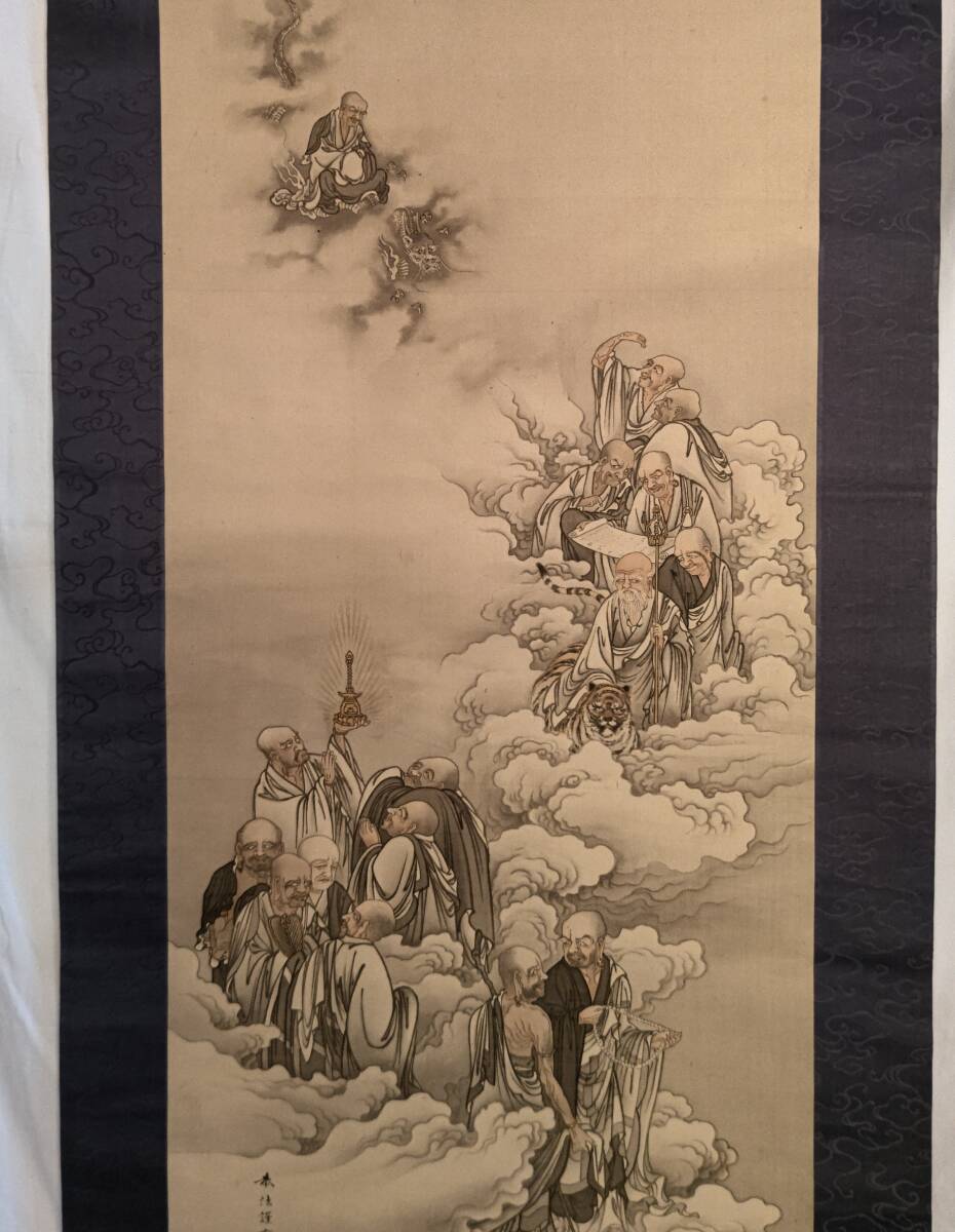 F612★【掛軸】【模写・奥村恭法】『雪中十六羅漢之圖』絹本 共箱★