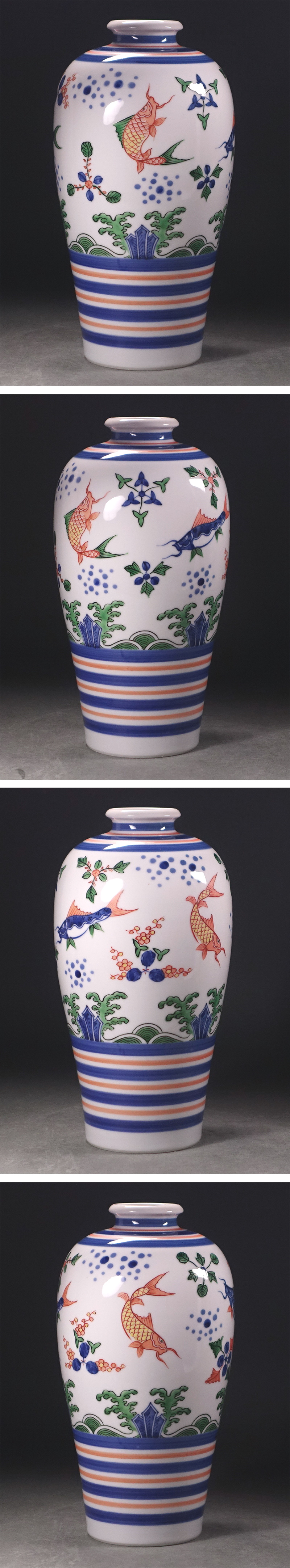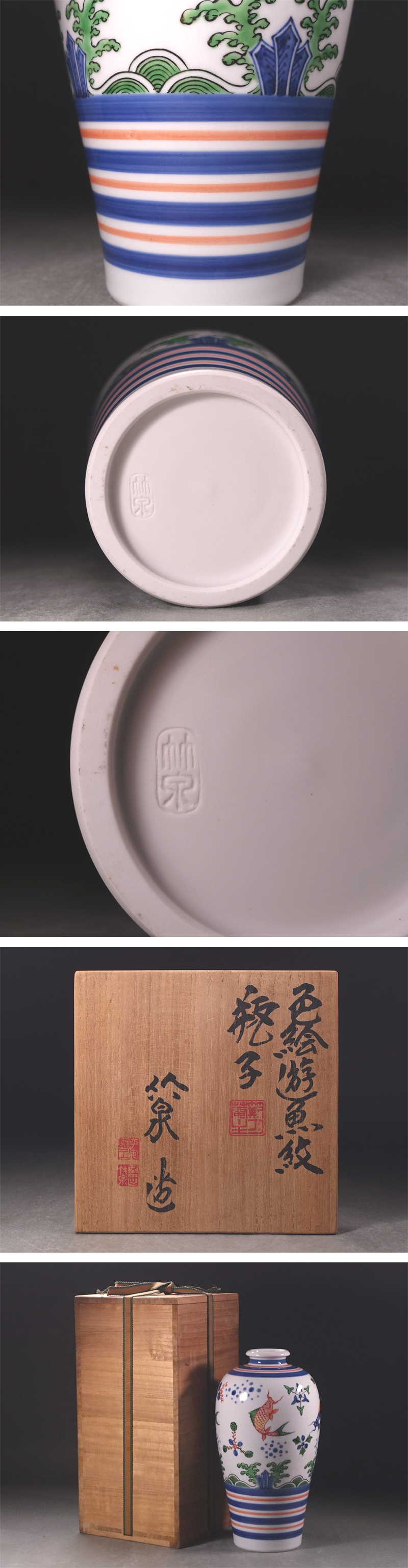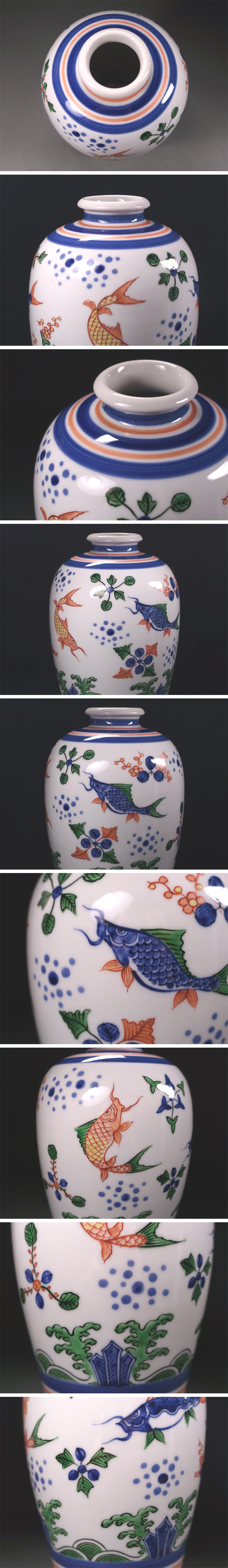 中国明代の五彩に敬慕を示し制作された花瓶で、染付、色絵を用いて遊魚を四方に描き、リズミカルな画面構成と卓抜した絵付技術はさすが五代竹泉といった所でしょう。